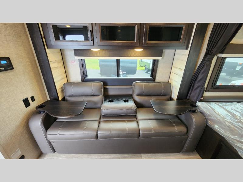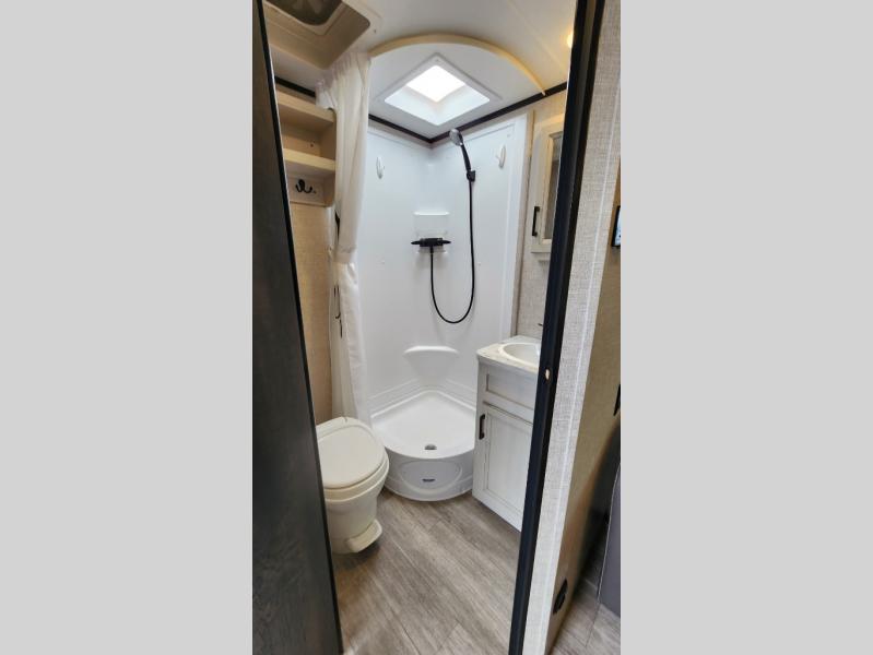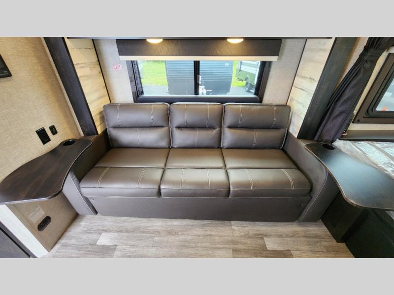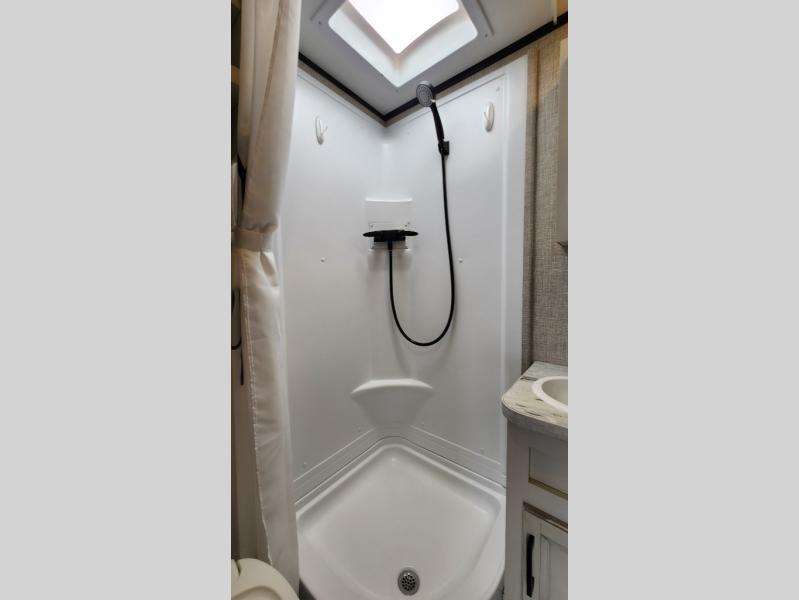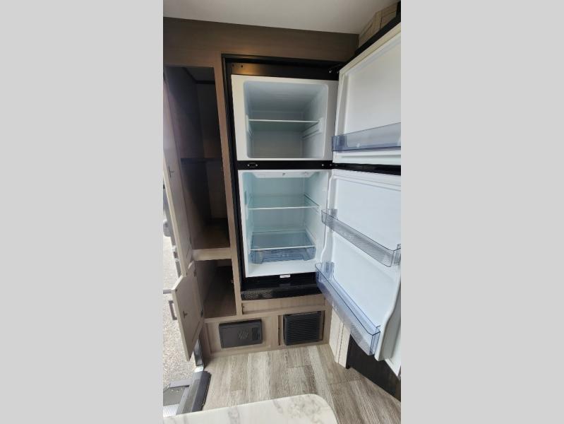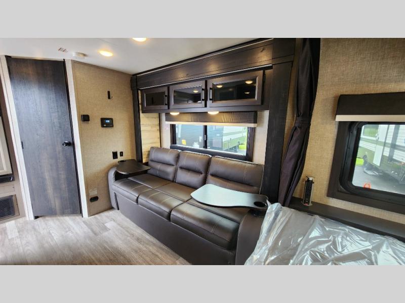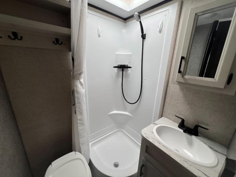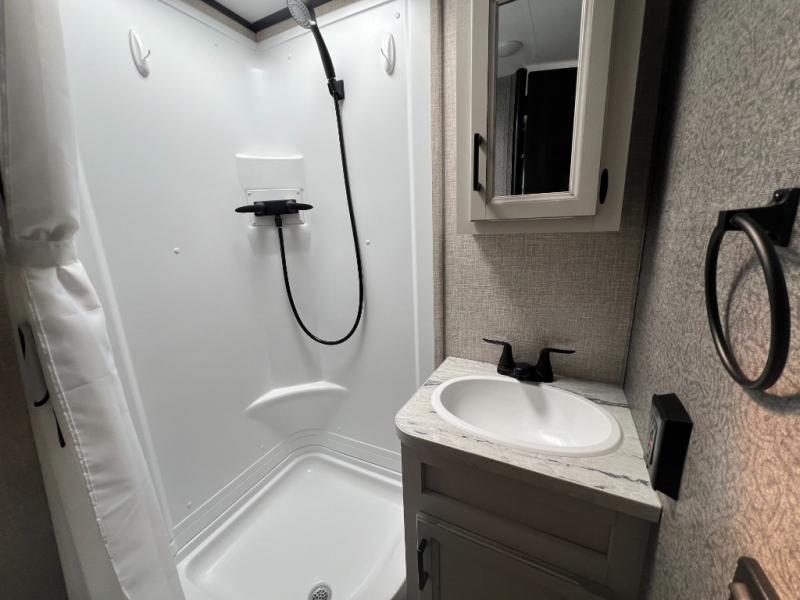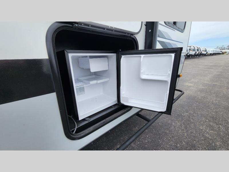 Weekends at the lake are made comfortable in this single slide out travel trailer. You will enjoy your own 54" x 80" front bed so you don't have to sleep on the floor, plus there is a jack-knife sofa if you have an overnight guest. The full bath features a radius shower with a skylight, plus plenty of storage space for your medicines and toiletries. This model includes a microwave oven and a three burner cooktop to prepare meals each day, and a 6 cu. ft. gas/electric refrigerator for perishables. You will also find an exterior refrigerator for cold drinks, plus a Jayport system with an LP quick connect.