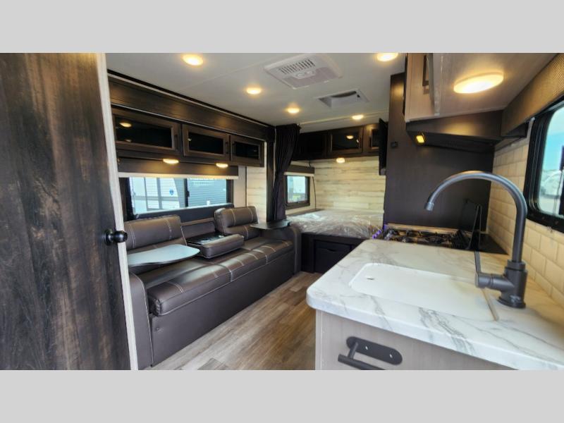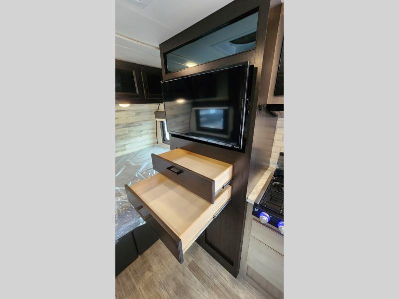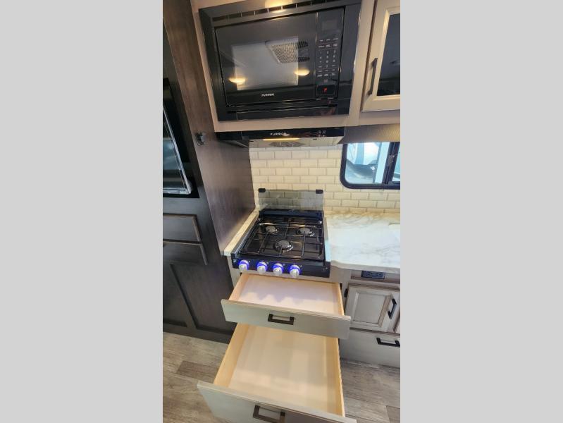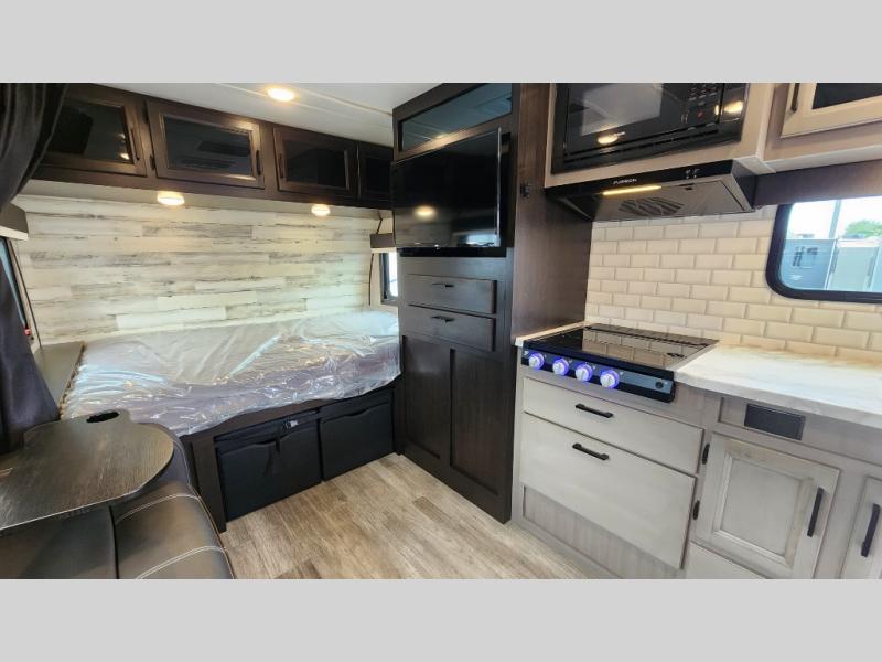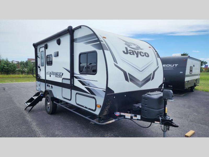 The Jay Feather Micro travel trailers by Jayco are for those looking for lightweight camping, while not sacrificing comfort and convenience. The modern retro graphics package is sure to be eye-catching, and the newly designed interiors will have you feeling right at home. Each model features an American-made frame with an integrated A-frame, Goodyear off-road tires, plus galvanized steel and impact-resistant wheel wells for added protection during transport. Some of the interior comforts you will enjoy are the residential vinyl flooring with cold crack resistance, screwed and glued cabinetry, and LED lighting. Adventure is waiting for you with a Jay Feather Micro travel trailer. Choose your favorite floorplan today!