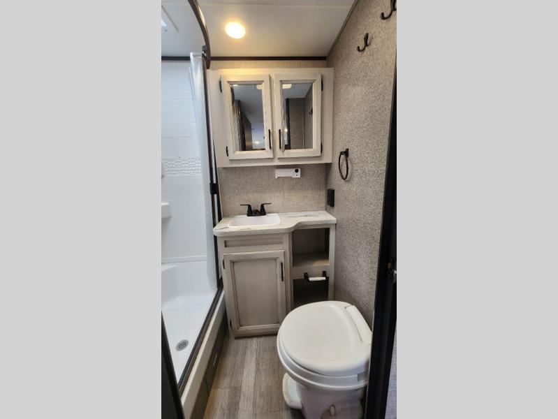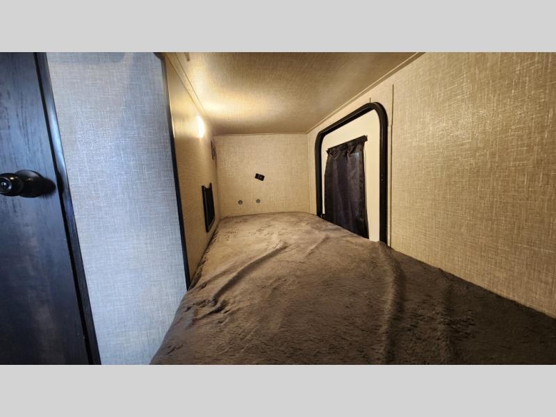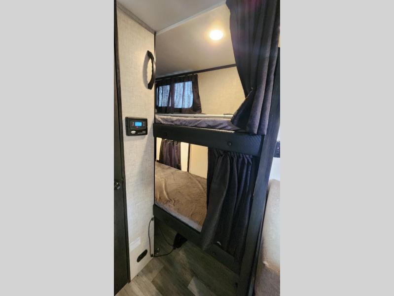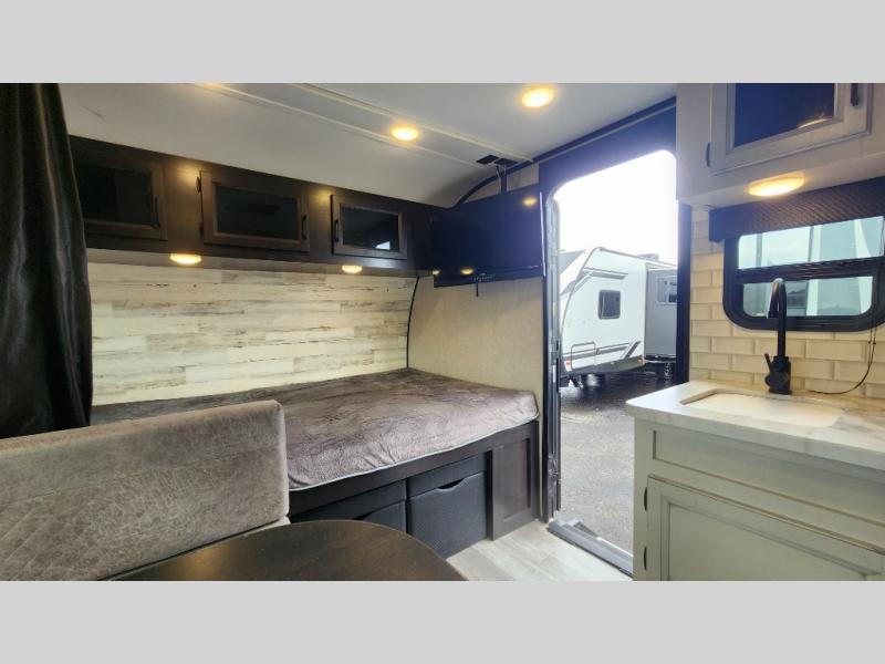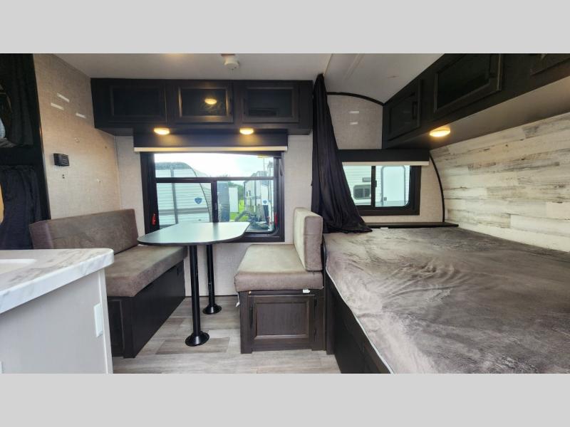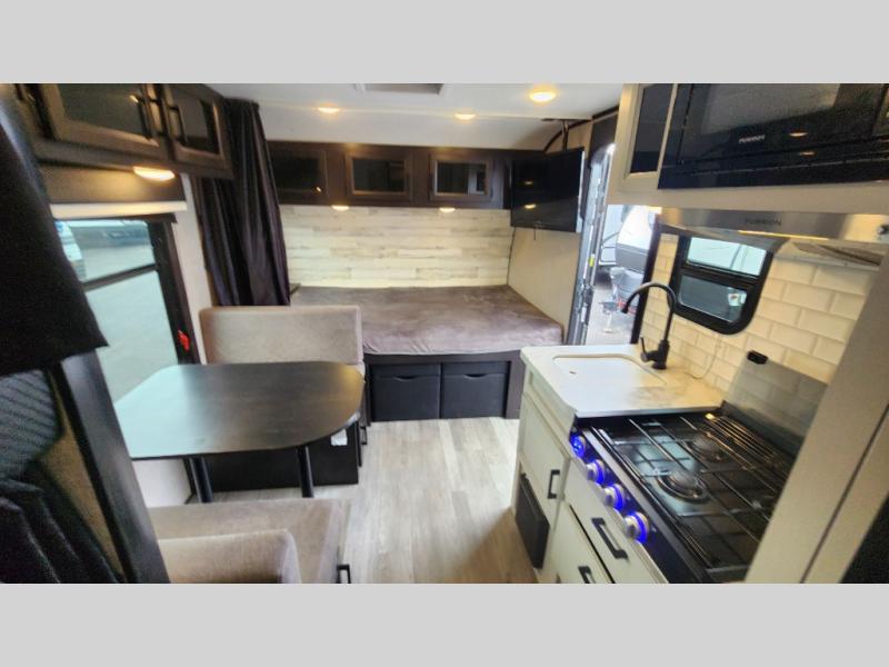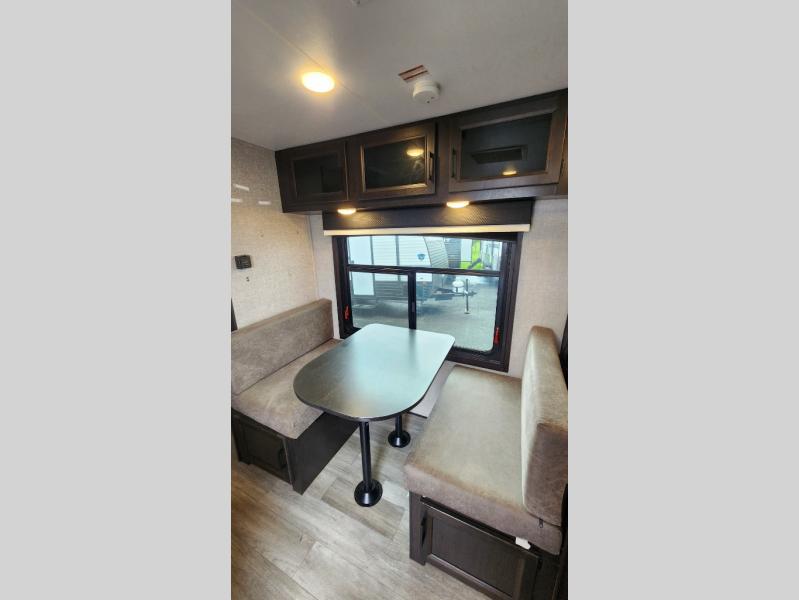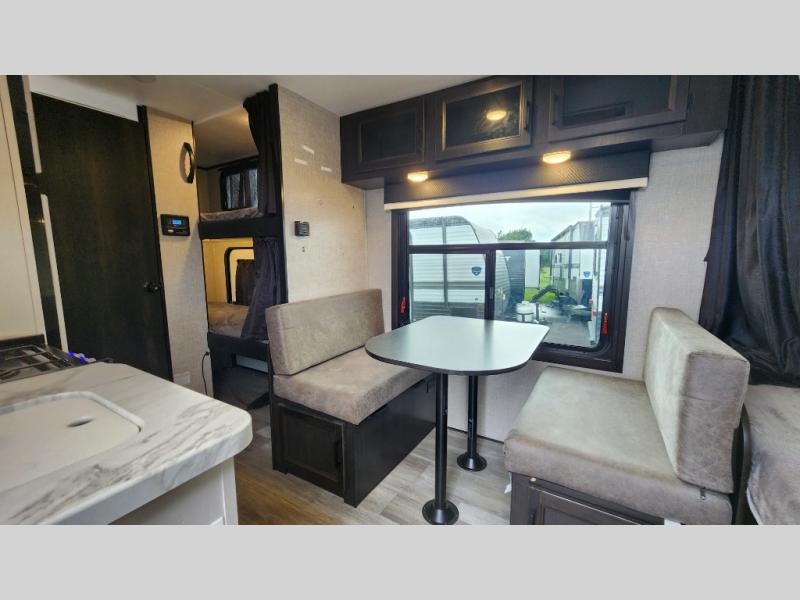 If you've been looking for a lightweight travel trailer with more sleeping space, your search is over with this model! There are bunk beds in the back near the full bath for convenience, a front queen bed, plus a booth dinette that will double as dining and sleeping space. This model also includes overhead compartments for your belongings, plus exterior storage for you fishing poles or tackle boxes.