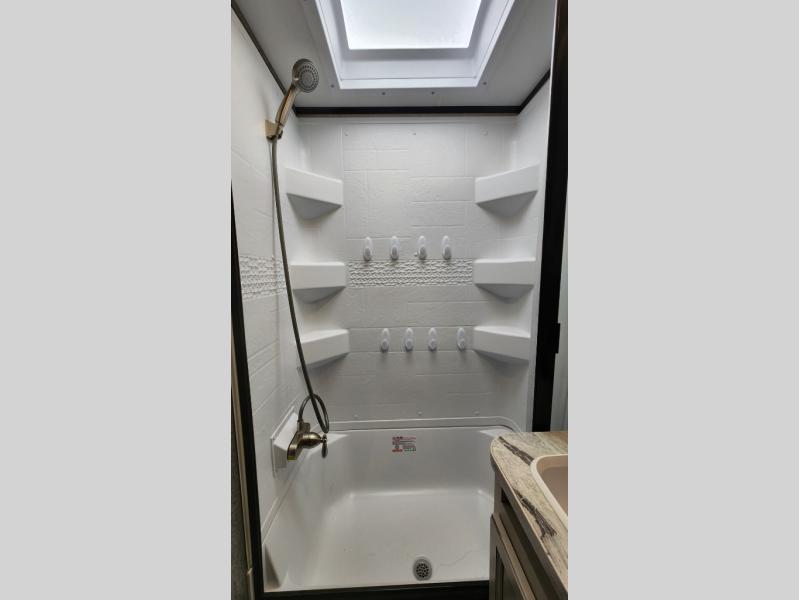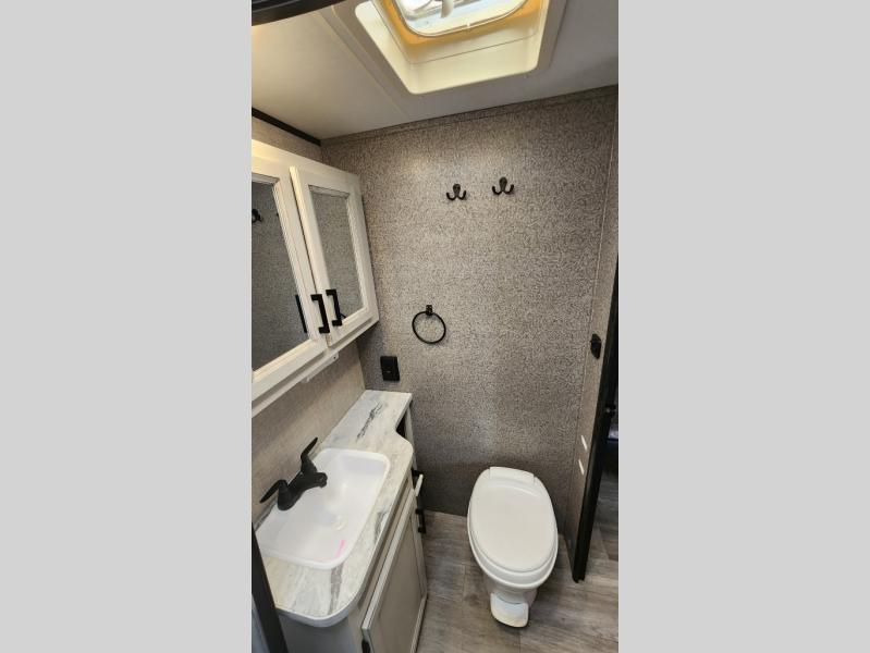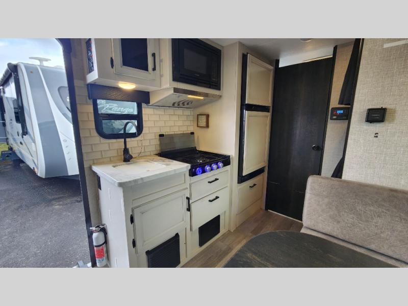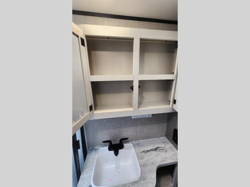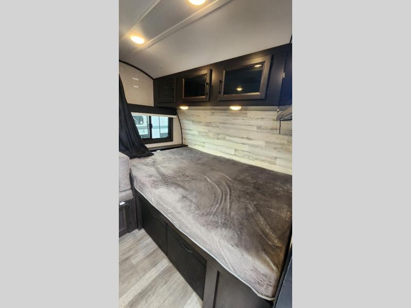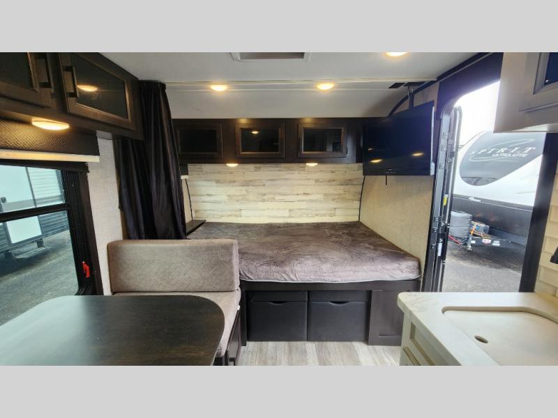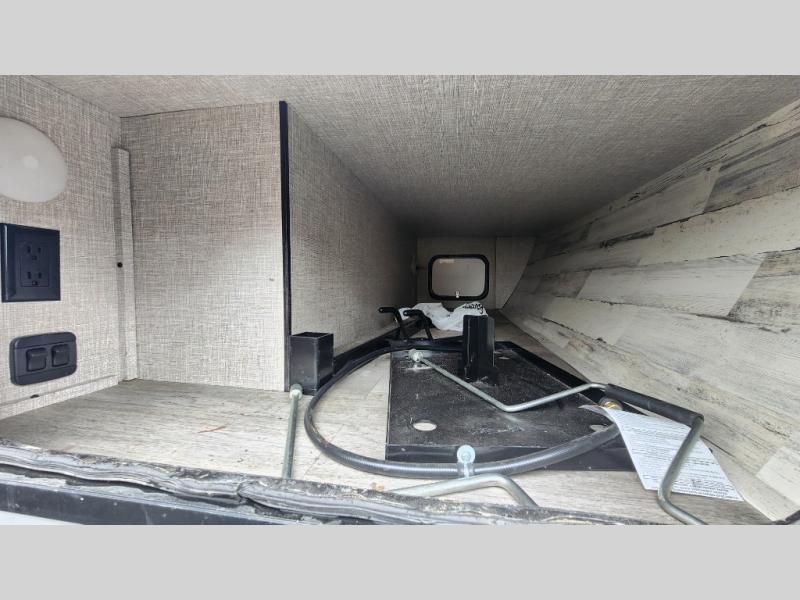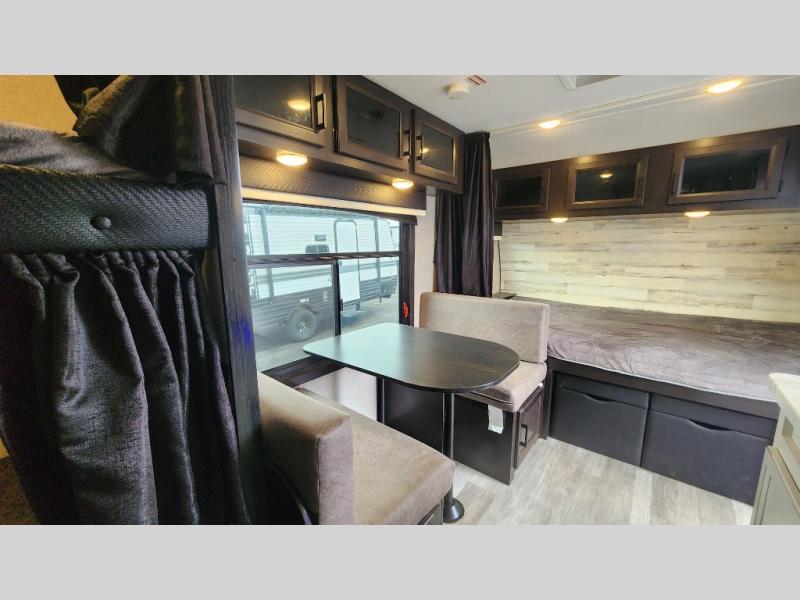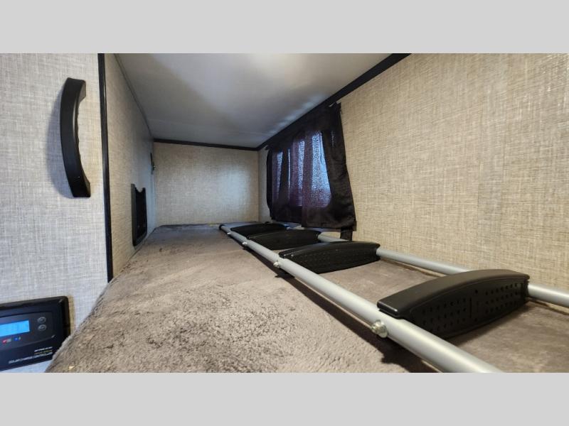 If you've been looking for a lightweight travel trailer with more sleeping space, your search is over with this model! There are bunk beds in the back near the full bath for convenience, a front queen bed, plus a booth dinette that will double as dining and sleeping space. This model also includes overhead compartments for your belongings, plus exterior storage for you fishing poles or tackle boxes.