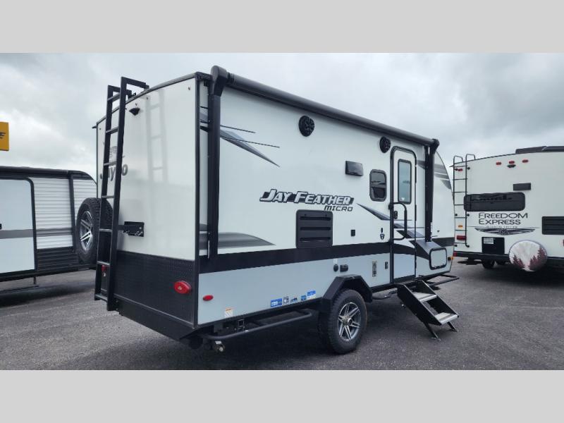 The Jay Feather Micro travel trailers by Jayco are for those looking for lightweight camping, while not sacrificing comfort and convenience. The modern retro graphics package is sure to be eye-catching, and the newly designed interiors will have you feeling right at home. Each model features an American-made frame with an integrated A-frame, Goodyear off-road tires, plus galvanized steel and impact-resistant wheel wells for added protection during transport. Some of the interior comforts you will enjoy are the residential vinyl flooring with cold crack resistance, screwed and glued cabinetry, and LED lighting. Adventure is waiting for you with a Jay Feather Micro travel trailer. Choose your favorite floorplan today!