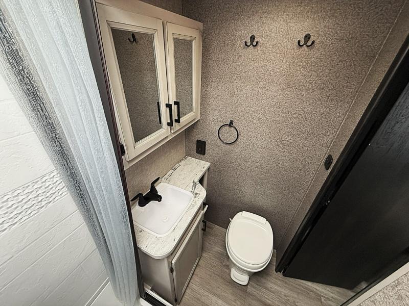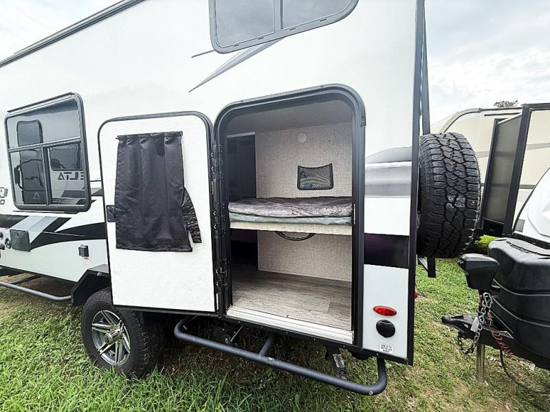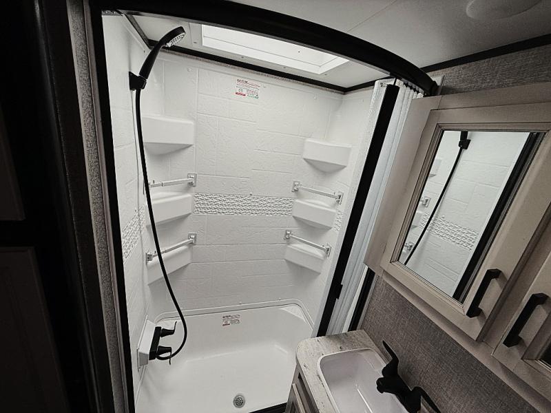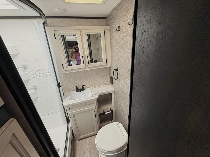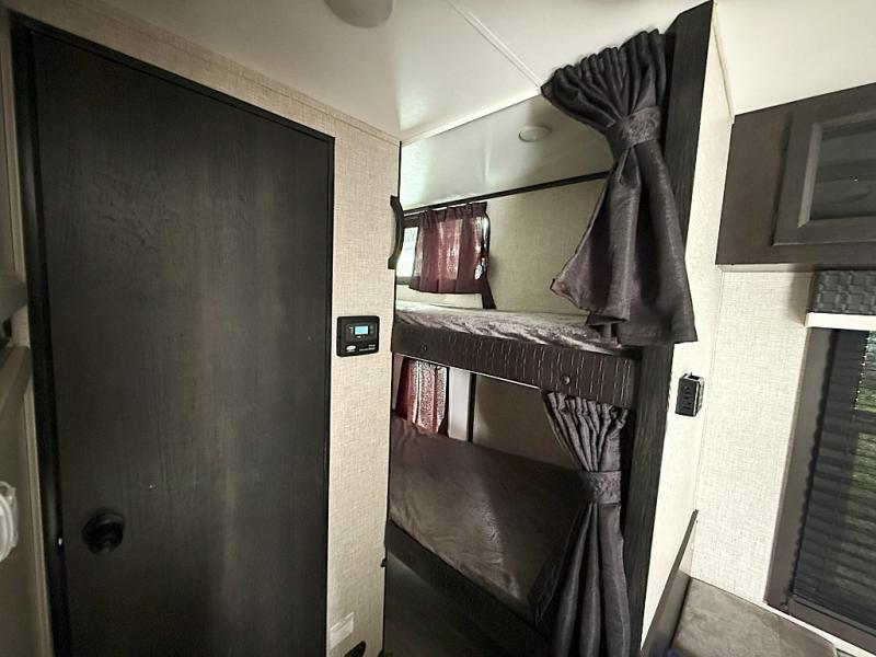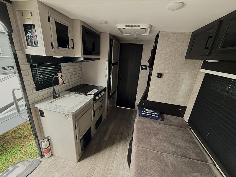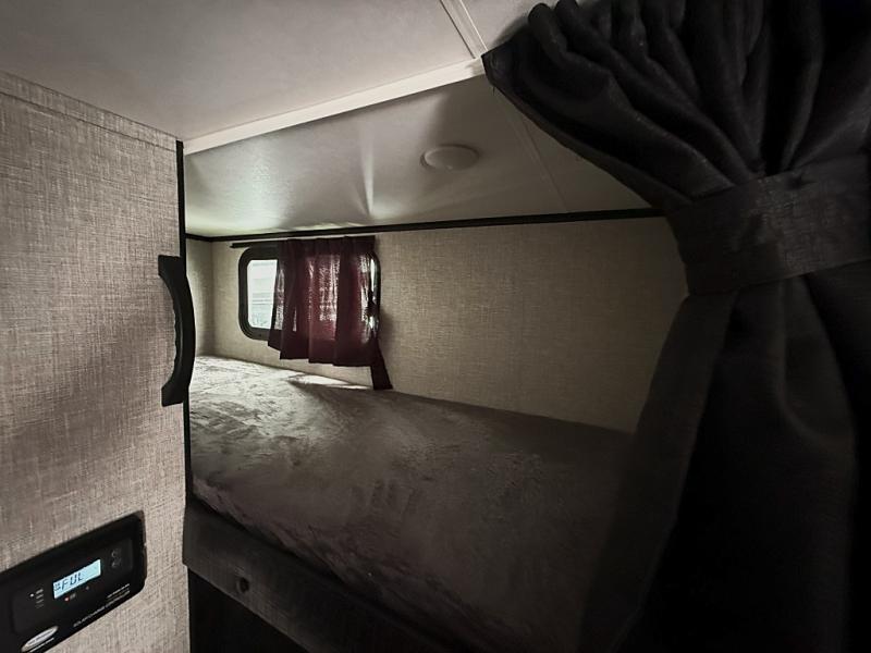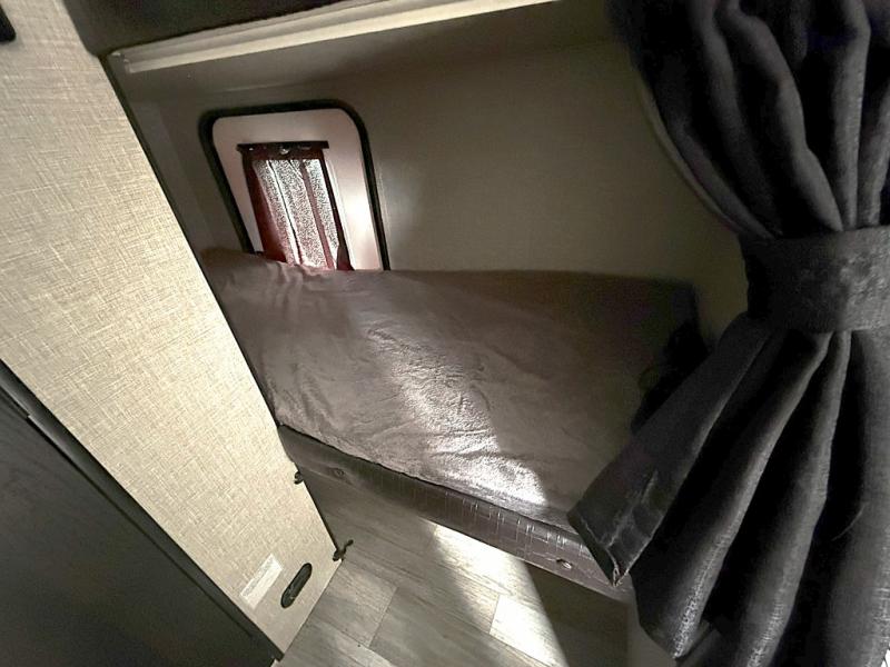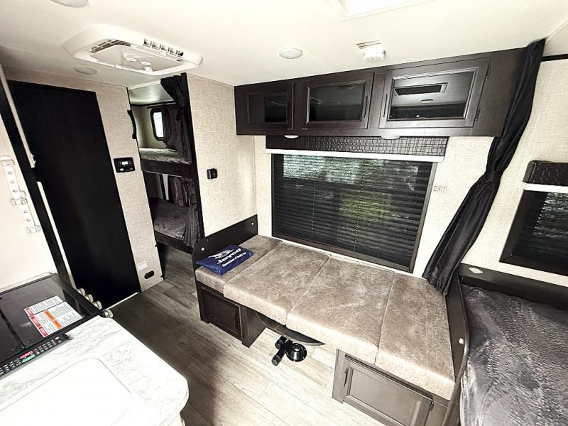 If you've been looking for a lightweight travel trailer with more sleeping space, your search is over with this model! There are bunk beds in the back near the full bath for convenience, a front queen bed, plus a booth dinette that will double as dining and sleeping space. This model also includes overhead compartments for your belongings, plus exterior storage for you fishing poles or tackle boxes.
