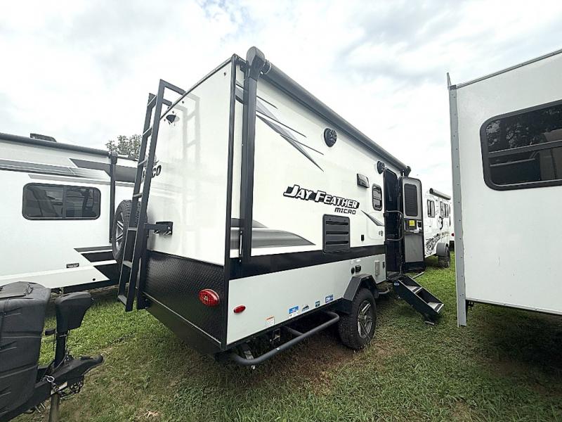 The Jay Feather Micro travel trailers by Jayco are for those looking for lightweight camping, while not sacrificing comfort and convenience. The modern retro graphics package is sure to be eye-catching, and the newly designed interiors will have you feeling right at home. Each model features an American-made frame with an integrated A-frame, Goodyear off-road tires, plus galvanized steel and impact-resistant wheel wells for added protection during transport. Some of the interior comforts you will enjoy are the residential vinyl flooring with cold crack resistance, screwed and glued cabinetry, and LED lighting. Adventure is waiting for you with a Jay Feather Micro travel trailer. Choose your favorite floorplan today!