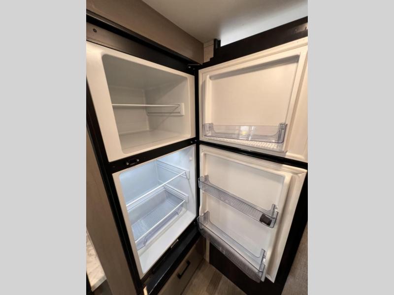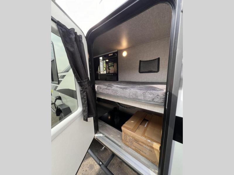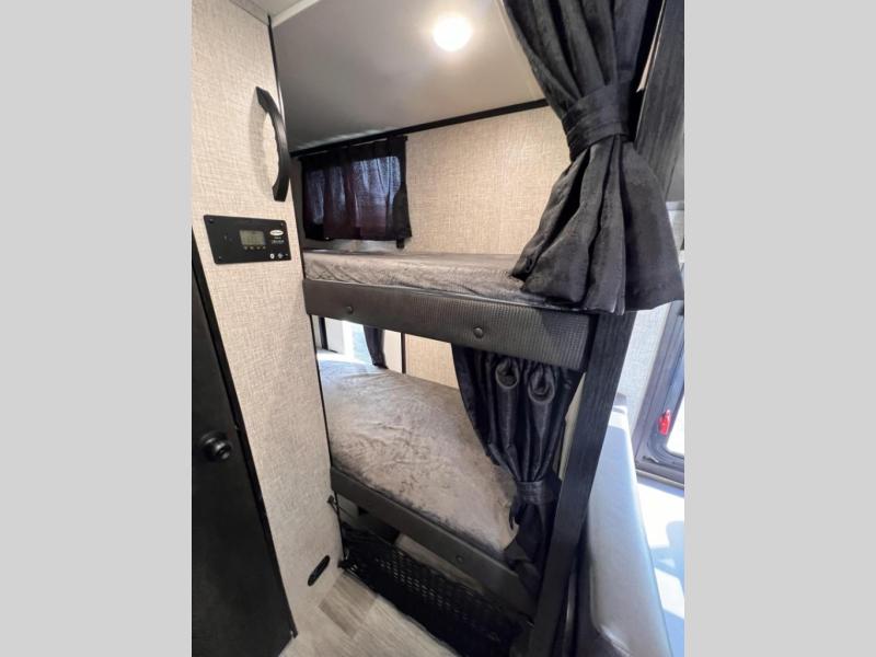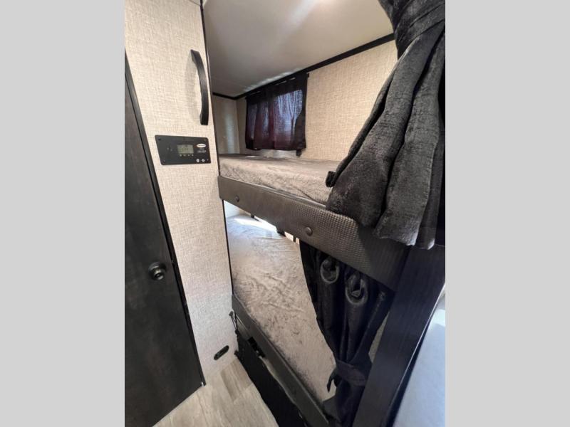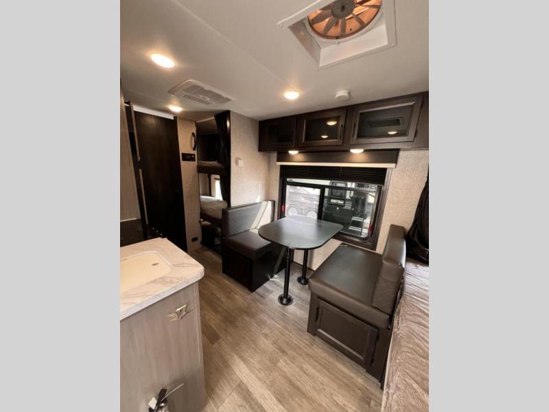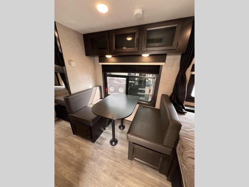 If you've been looking for a lightweight travel trailer with more sleeping space, your search is over with this model! There are bunk beds in the back near the full bath for convenience, a front queen bed, plus a booth dinette that will double as dining and sleeping space. This model also includes overhead compartments for your belongings, plus exterior storage for you fishing poles or tackle boxes.