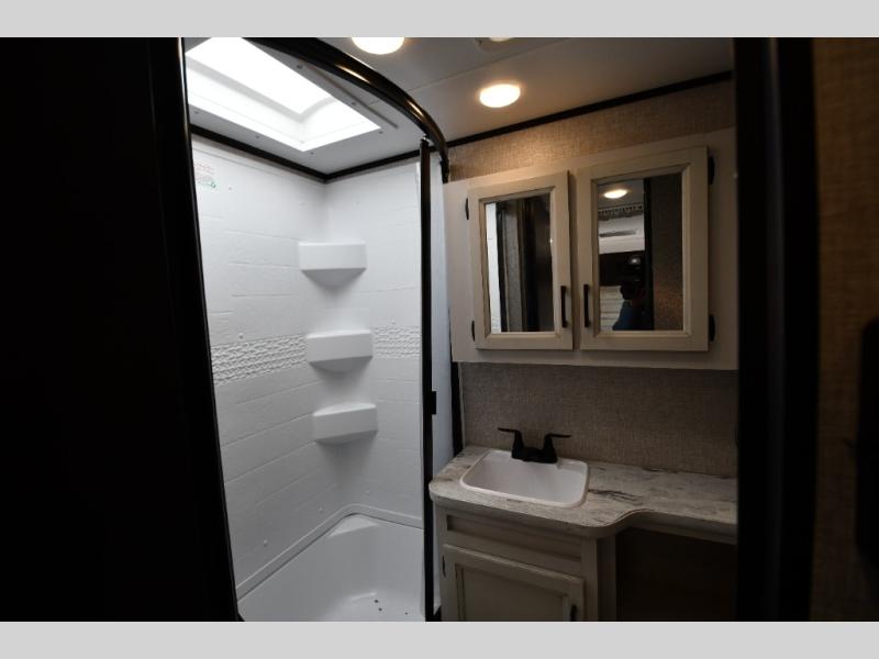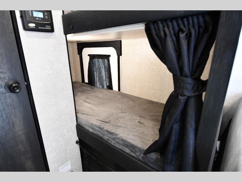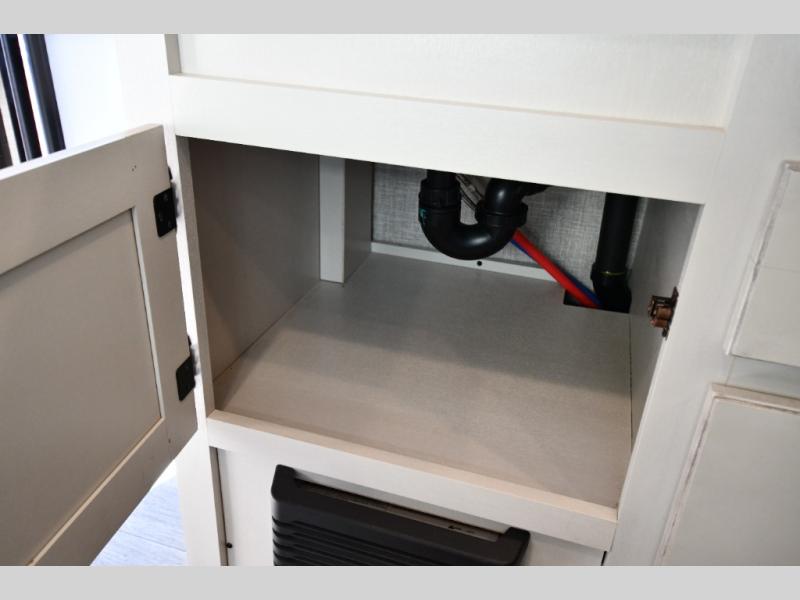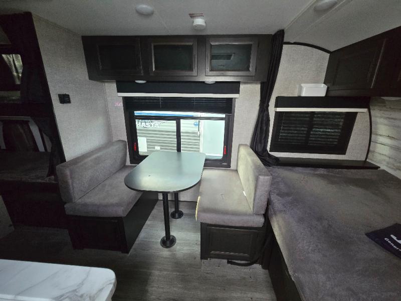If you've been looking for a lightweight travel trailer with more sleeping space, your search is over with this model! There are bunk beds in the back near the full bath for convenience, a front queen bed, plus a booth dinette that will double as dining and sleeping space. This model also includes overhead compartments for your belongings, plus exterior storage for you fishing poles or tackle boxes.