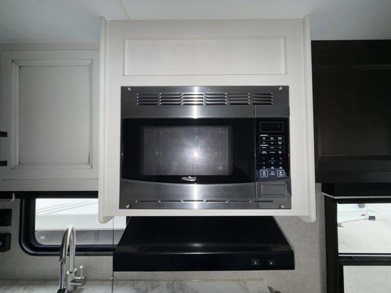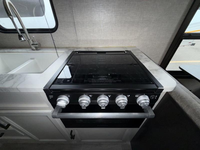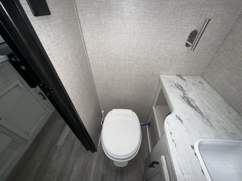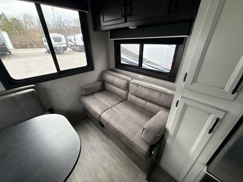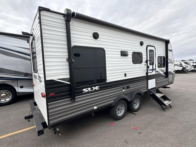 Looking for a couples trailer or a manageable RV that will sleep four when you utilize the furniture as sleeping space? Look no further than this SLX 8 to find a queen bed up front for two, and the jack-knife sofa plus the booth dinette provide sleeping space for two more. The cook will enjoy making meals with everything nearby to keep everyone fed, plus the refrigerator and pantry offer food storage. Everyone can get cleaned up in the full bathroom either in the morning or before bedtime, and the bathroom will come in handy during those night time trips. The outside offers a 16' power awning to relax under as you plan your activities, and there is storage for camping games, charcoal and such along the exterior.