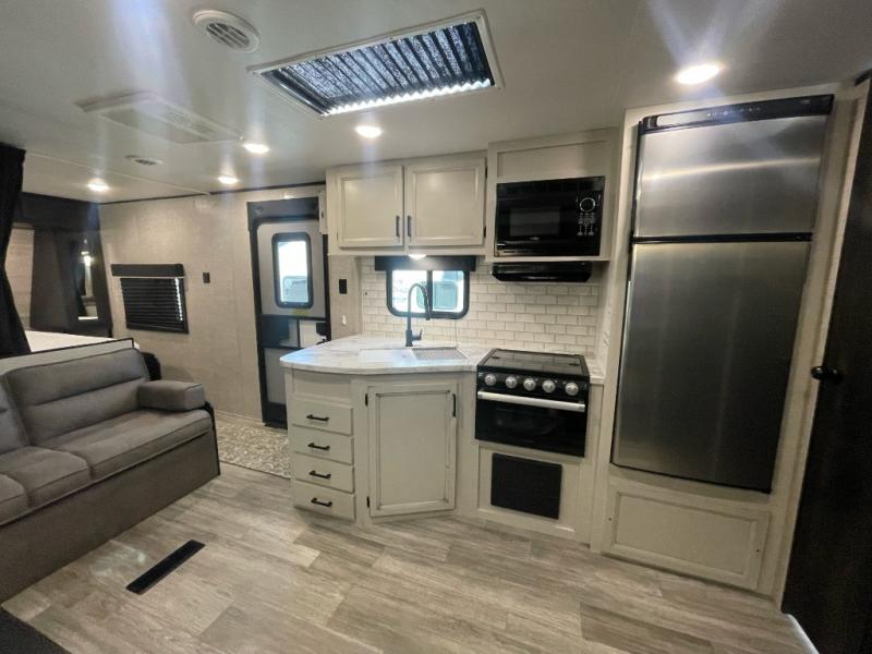 Check out the #1-selling Jayco Jay flight travel trailer! These trailers are built upon I-Class™ cambered structural steel I-beams and a fully integrated A-frame. They have axles with electric, self-adjusting brakes and easy-lube hubs to make your journeys smooth, and the Magnum Truss roof system will withstand many years and types of travel. You'll have large exterior downspouts, a front diamond plate, four stabilizer jacks, and a friction-hinge entry door with shade-prep window. The interior is where you'll find great comfort and modern design. There are residential-style kitchen countertops, solid hardwood cabinet doors, a premium multimedia sound system, a full-height kitchen backsplash, a kitchen skylight with shade, and a deluxe bedspread with pillows.