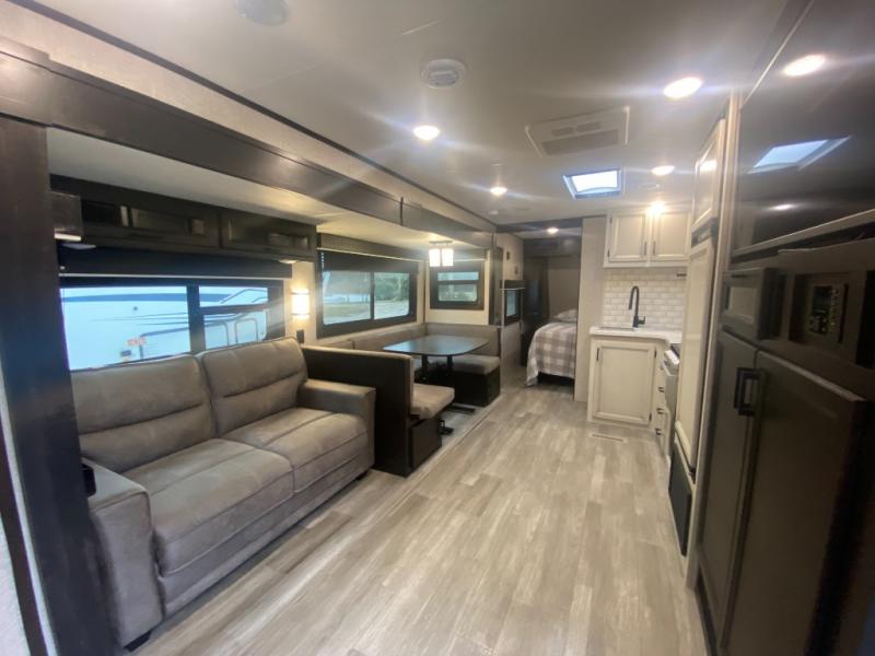 Check out the #1-selling Jayco Jay flight travel trailer! These trailers are built upon I-Class™ cambered structural steel I-beams and a fully integrated A-frame. They have axles with electric, self-adjusting brakes and easy-lube hubs to make your journeys smooth, and the Magnum Truss roof system will withstand many years and types of travel. You'll have large exterior downspouts, a front diamond plate, four stabilizer jacks, and a friction-hinge entry door with shade-prep window. The interior is where you'll find great comfort and modern design. There are residential-style kitchen countertops, solid hardwood cabinet doors, a premium multimedia sound system, a full-height kitchen backsplash, a kitchen skylight with shade, and a deluxe bedspread with pillows.