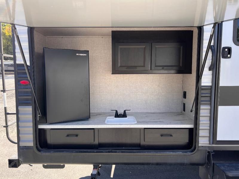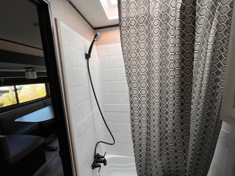 This Jay Flight travel trailer has two private sleeping areas, a private bedroom up front and a private bunkhouse in the back. The bunkhouse even has a slide out for some added space. Two entry doors get you into this trailer quickly from the front or back, and you will also have two kitchens on this unit, one inside and one outside. The entertainment center makes nighttime movie watching easy, and you can always heat up a snack quickly in the microwave. The bathroom skylight will bring in more sunlight as you get ready, and the tub/shower will help you get clean.