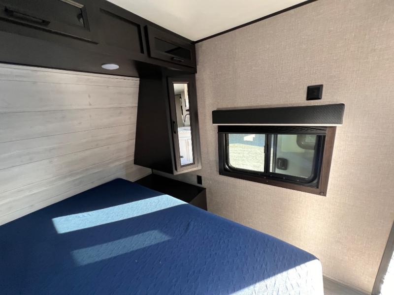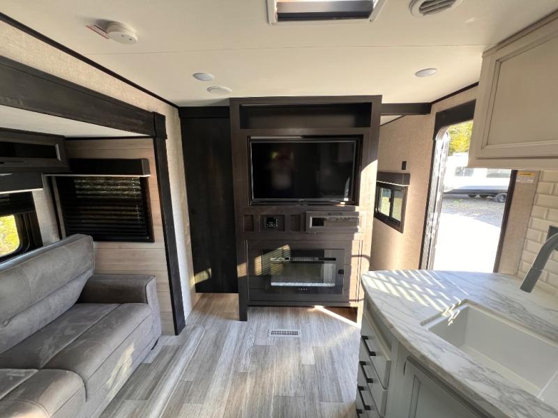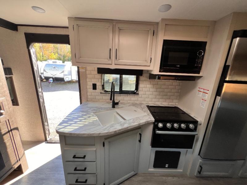 Check out the #1-selling Jayco Jay flight travel trailer! These trailers are built upon I-Class™ cambered structural steel I-beams and a fully integrated A-frame. They have axles with electric, self-adjusting brakes and easy-lube hubs to make your journeys smooth, and the Magnum Truss roof system will withstand many years and types of travel. You'll have large exterior downspouts, a front diamond plate, four stabilizer jacks, and a friction-hinge entry door with shade-prep window. The interior is where you'll find great comfort and modern design. There are residential-style kitchen countertops, solid hardwood cabinet doors, a premium multimedia sound system, a full-height kitchen backsplash, a kitchen skylight with shade, and a deluxe bedspread with pillows.