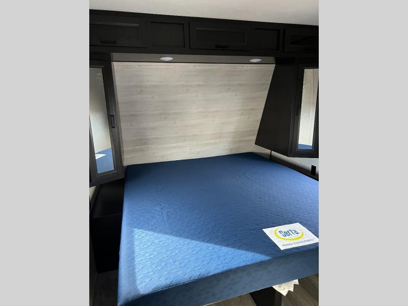 Check out the #1-selling Jayco Jay flight travel trailer! These trailers are built upon I-Class™ cambered structural steel I-beams and a fully integrated A-frame. They have axles with electric, self-adjusting brakes and easy-lube hubs to make your journeys smooth, and the Magnum Truss roof system will withstand many years and types of travel. You'll have large exterior downspouts, a front diamond plate, four stabilizer jacks, and a friction-hinge entry door with shade-prep window. The interior is where you'll find great comfort and modern design. There are residential-style kitchen countertops, solid hardwood cabinet doors, a premium multimedia sound system, a full-height kitchen backsplash, a kitchen skylight with shade, and a deluxe bedspread with pillows.