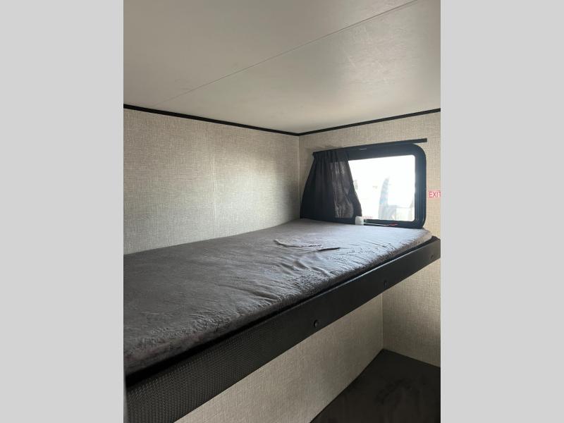 You'll have a grand time getting away with this Jay Flight travel trailer! You'll stay comfortable on the queen-size bed in the front private bedroom, and you can even turn the queen bed into a king by adding the optional king-size bed in its place. When you enter this trailer, there is an entryway closet directly to your right, so you can store coats and shoes easily. The entertainment center gives you the chance to add an optional fireplace below which will make your time spent on the jackknife sofa even more enjoyable. A booth dinette can be used as a dining or sleeping location, and the kitchen hutch will store some dishes for you. The private bunkhouse has the second entertainment center as well as its own dinette and storage area.