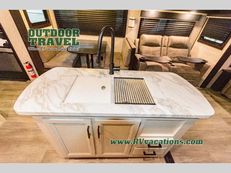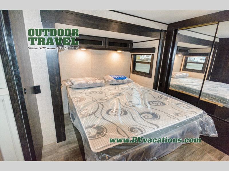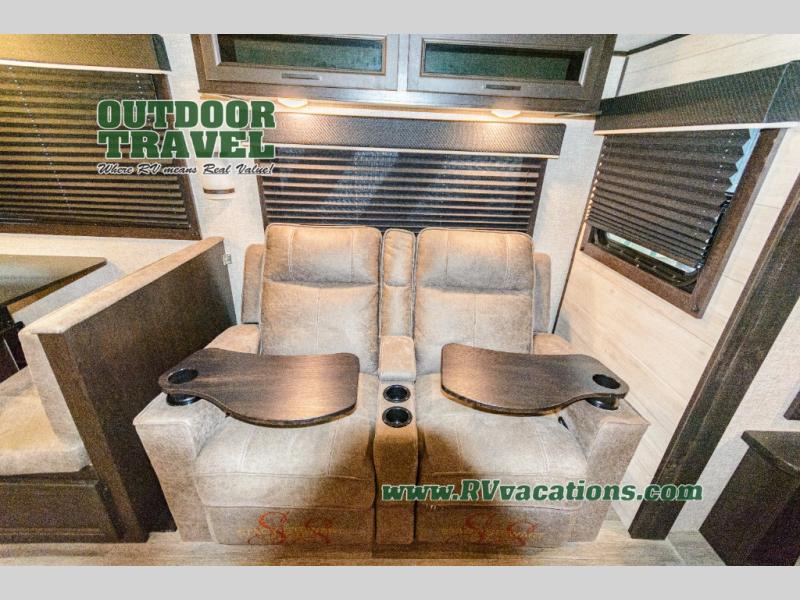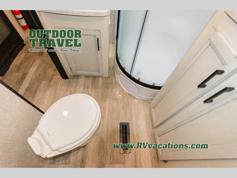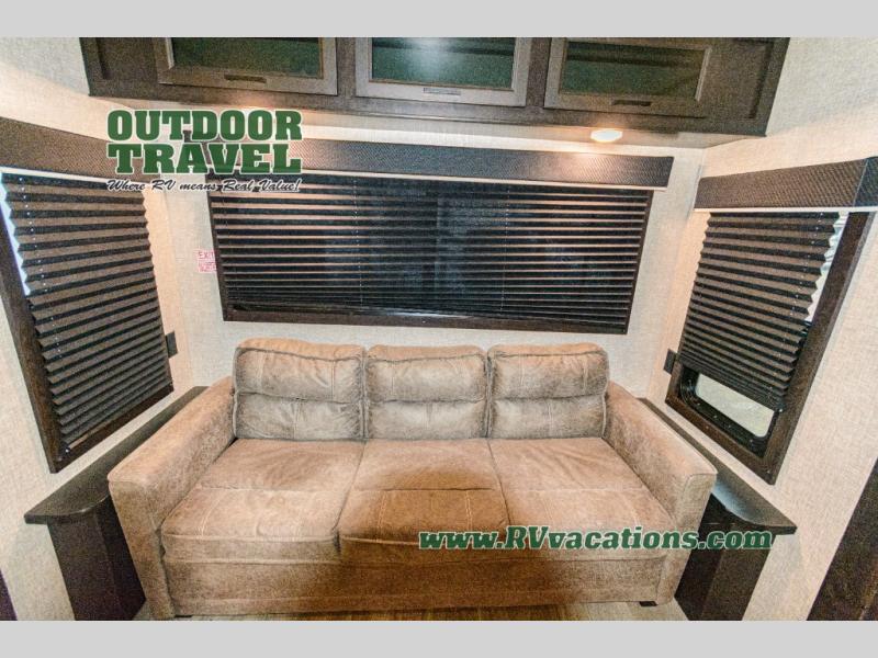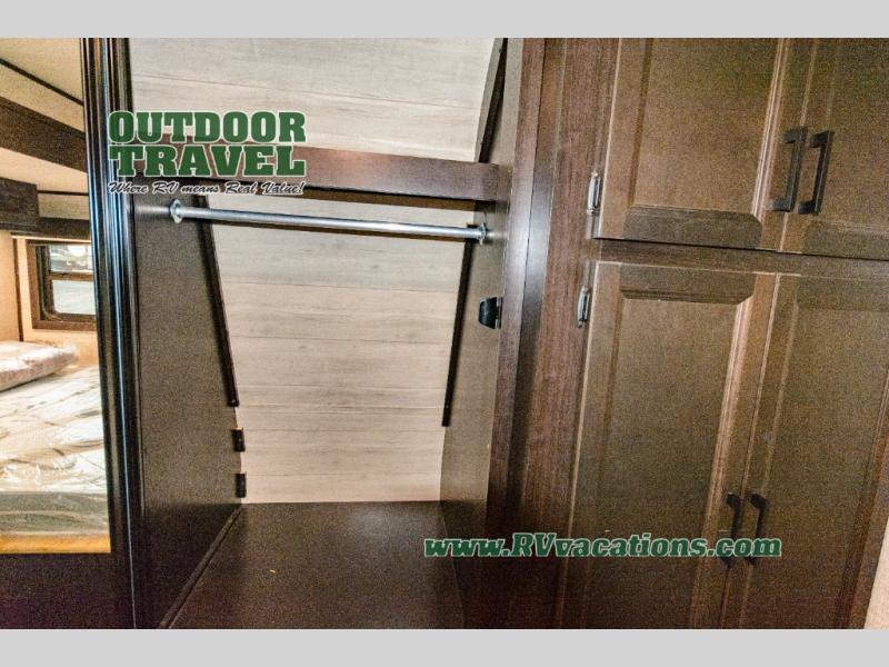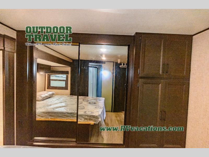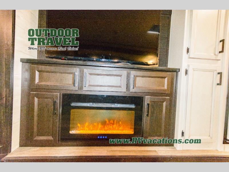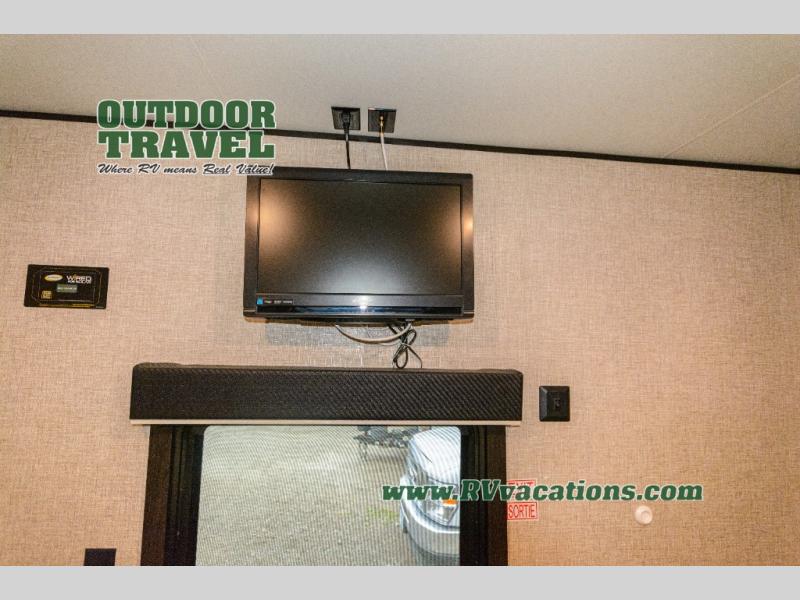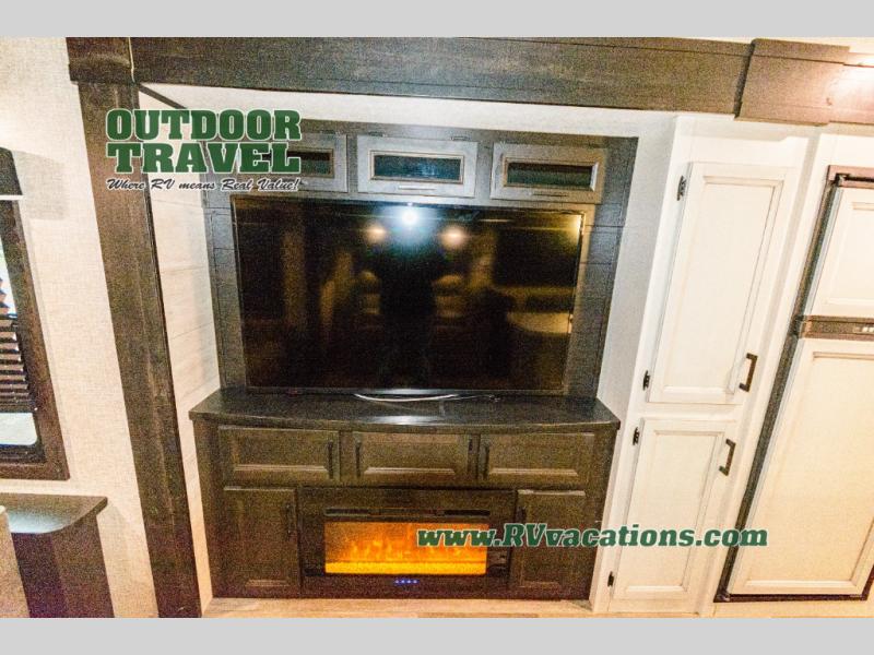 What I liked most: Triple slide creates a lot of space in the kitchen living dining area. Two recliners plus the couch is a lot of seating. Built in entertainment area with fireplace. The television is setup behind a cabinet door border that opens and reveals extra storage space. Bathroom has two door entry. Lots of storage in the bathroom. Bedroom feels very open with double slide closet mirror and plenty of storage. A pretty neat digital device charging center as well.