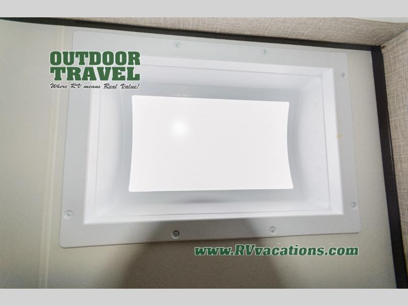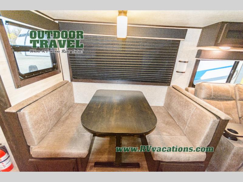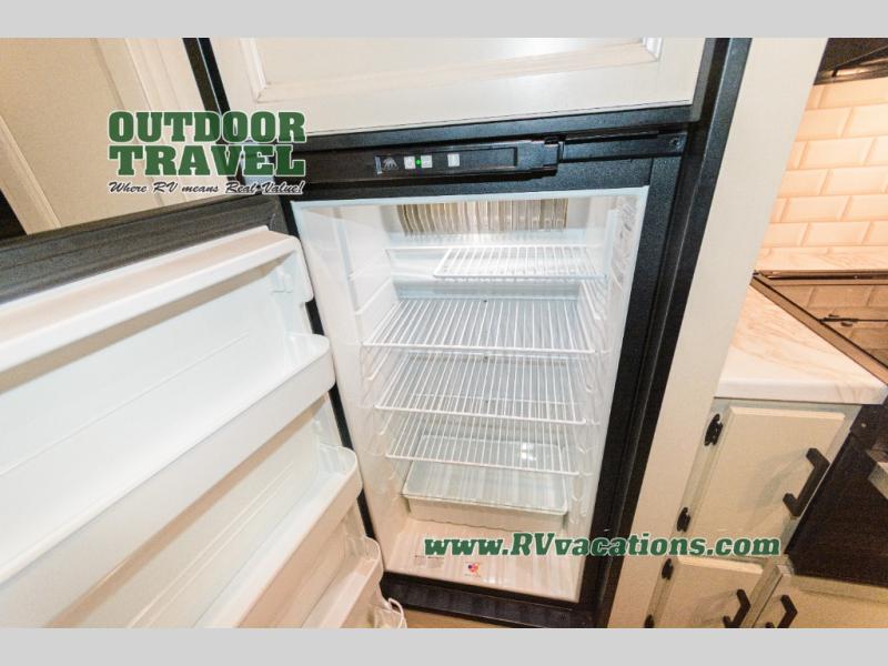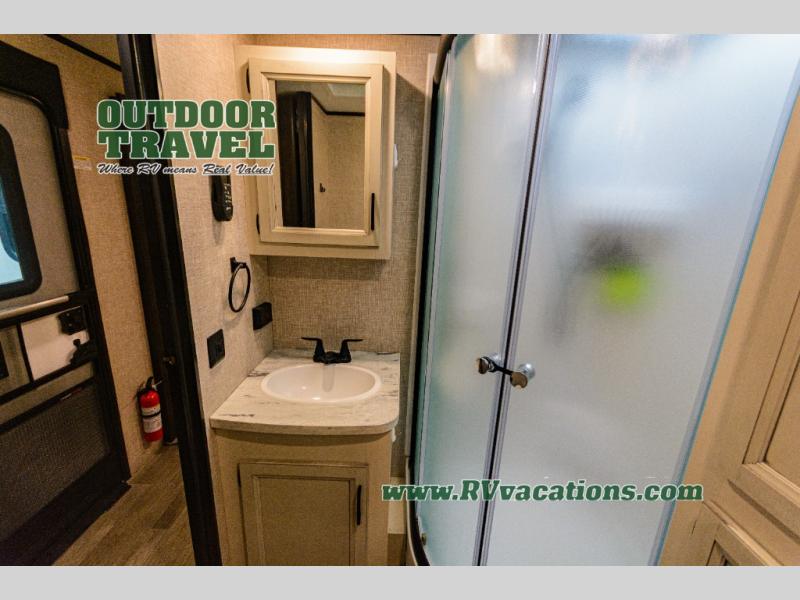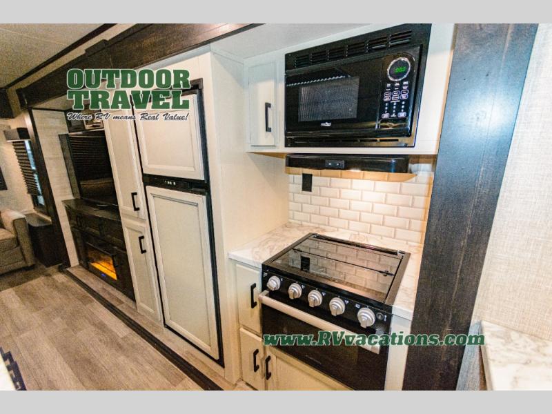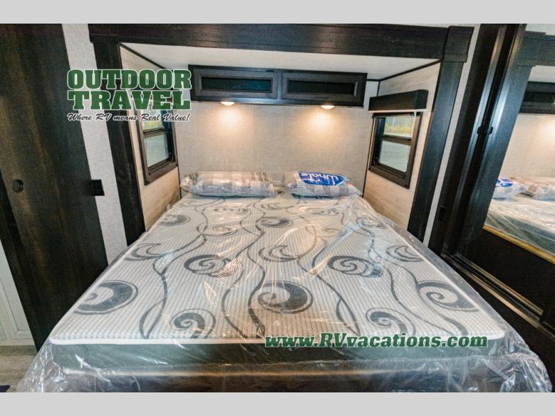 This Jay Flight travel trailer is very similar to model 34RLOK with just a few tweaks! The fireplace sits below the entertainment center, and both items are across from the theater seating. You'll also have a jackknife sofa right there so that others can join in on the relaxation, and the booth dinette is situated next to the theater seating so that it can also be used as seating during movie nights. A kitchen island adds function to the kitchen, and it also serves as a great dishwashing station. You can cook just about anything on the three-burner range, and the pantry will help you store your snacks. You'll also be able to access the dual-entry bathroom from the main hallway or the front bedroom.