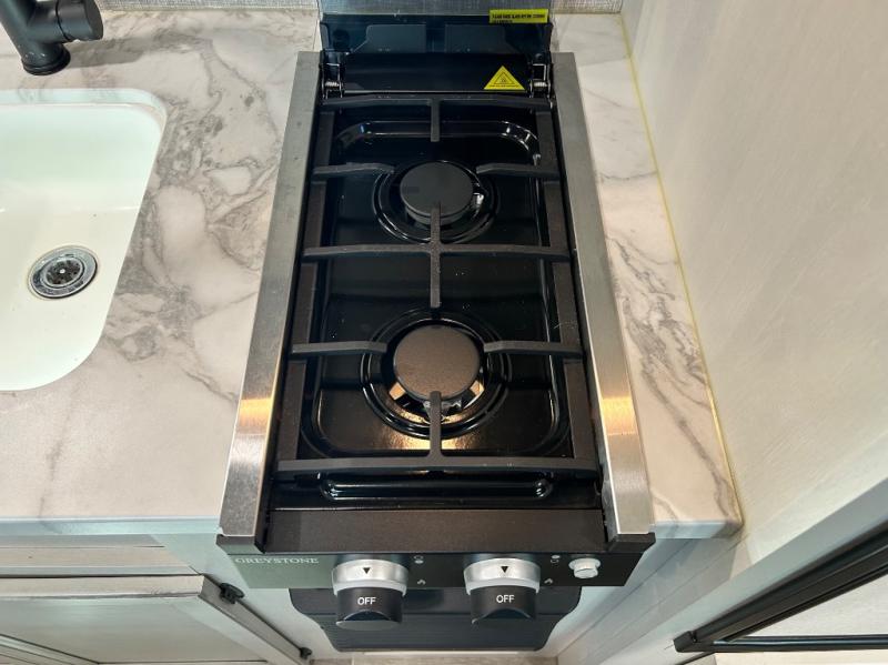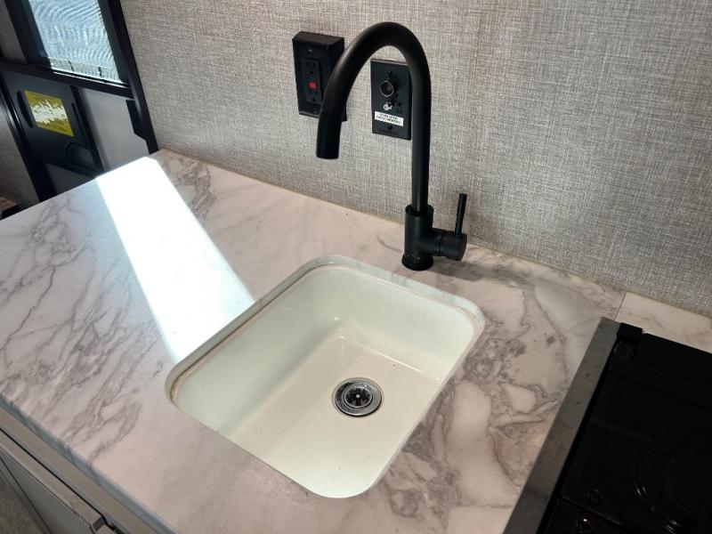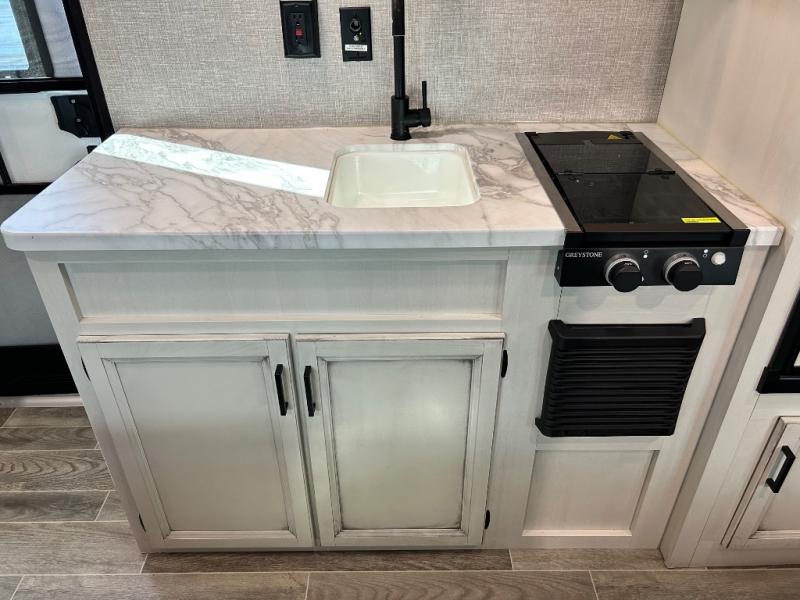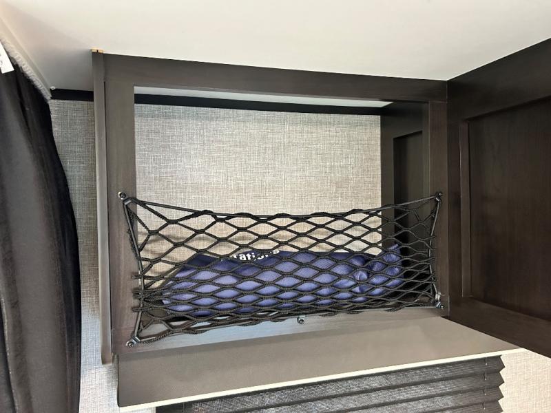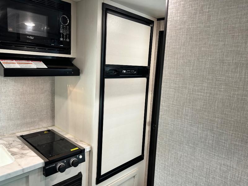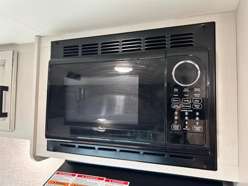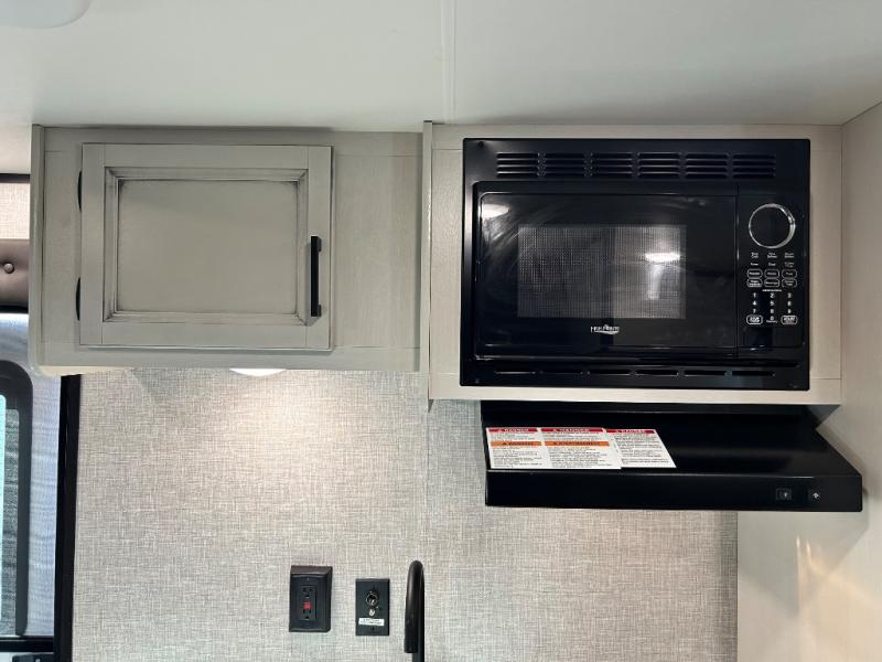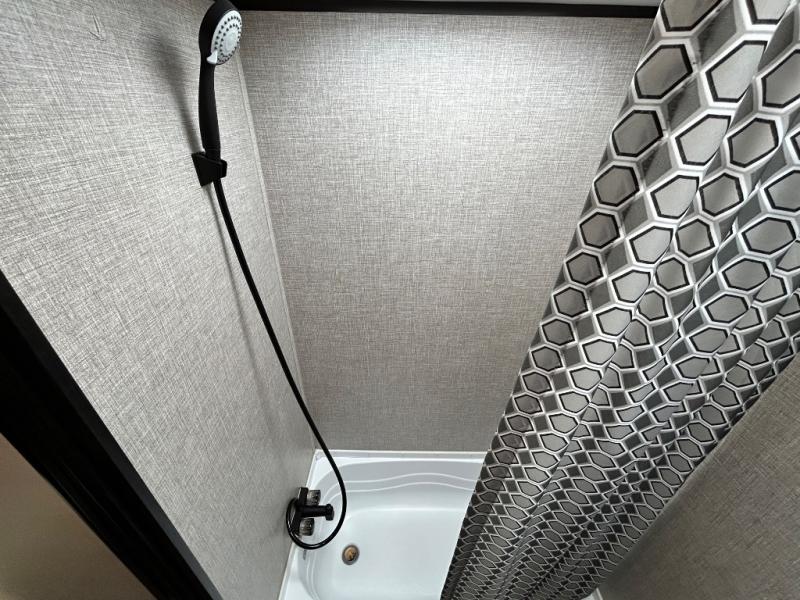 This Jay Flight SLX 7 travel trailer offers you a queen-size bed for sleeping at night, and there is even a privacy curtain that you can draw to separate the bed from the rest of the trailer too. The 29" x 75" bunk beds are another sleeping location, and you can even create a bed for one more person by transforming the booth dinette. Overhead cabinets will help you keep your belongings organized, and the kitchen has a two-burner range, 6-cubic foot refrigerator, residential-style countertops, microwave oven, and a high-rise faucet at the sink to help you prepare meals.