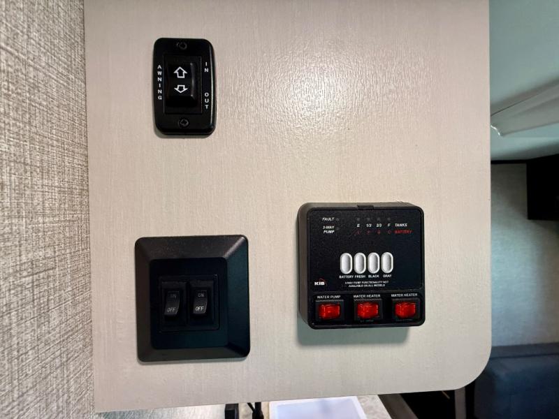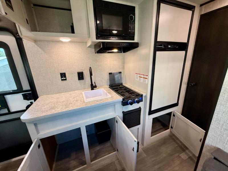 This Jay Flight SLX 7 travel trailer offers you a queen-size bed for sleeping at night, and there is even a privacy curtain that you can draw to separate the bed from the rest of the trailer too. The 29" x 75" bunk beds are another sleeping location, and you can even create a bed for one more person by transforming the booth dinette. Overhead cabinets will help you keep your belongings organized, and the kitchen has a two-burner range, 6-cubic foot refrigerator, residential-style countertops, microwave oven, and a high-rise faucet at the sink to help you prepare meals.