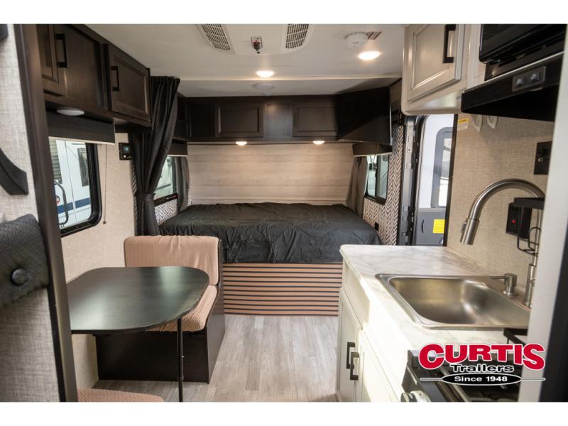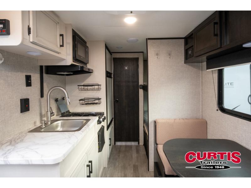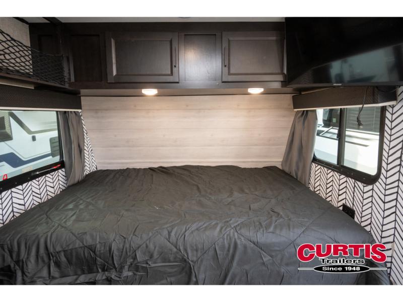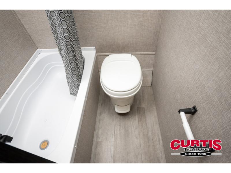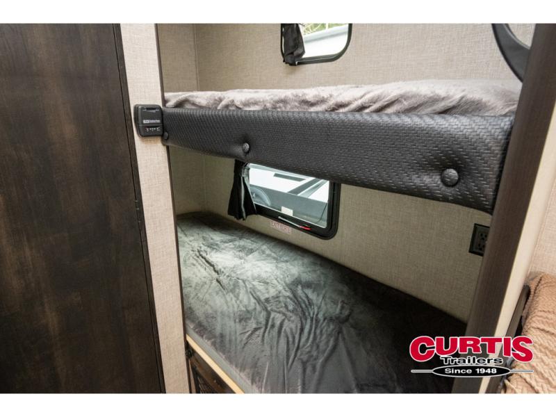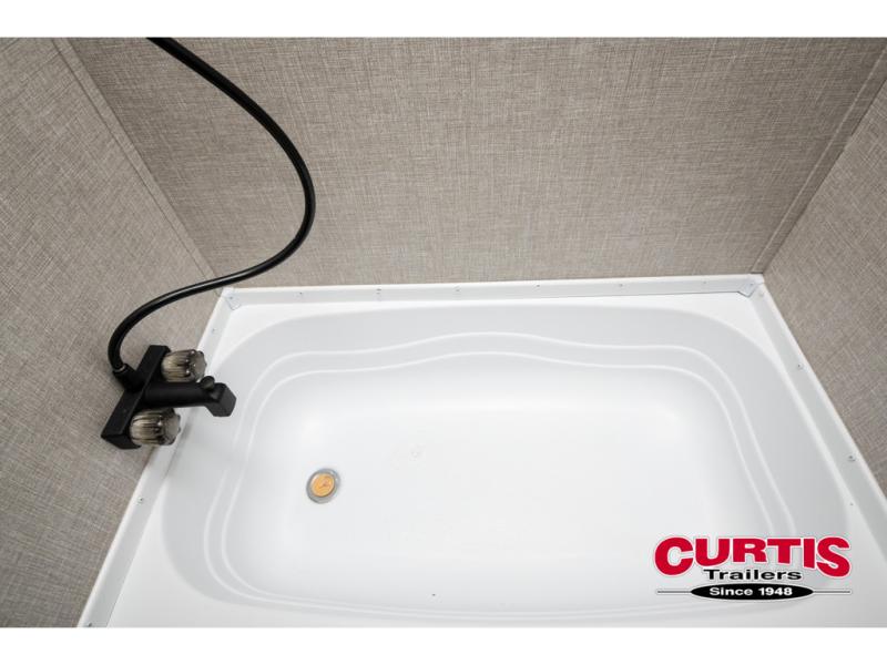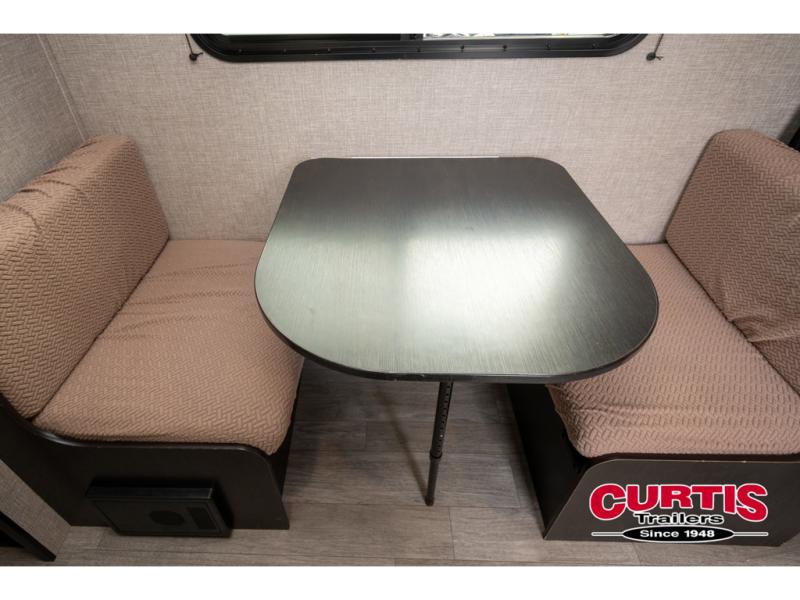 This Jay Flight SLX 7 travel trailer offers you a queen-size bed for sleeping at night, and there is even a privacy curtain that you can draw to separate the bed from the rest of the trailer too. The 29" x 75" bunk beds are another sleeping location, and you can even create a bed for one more person by transforming the booth dinette. Overhead cabinets will help you keep your belongings organized, and the kitchen has a two-burner range, 6-cubic foot refrigerator, residential-style countertops, microwave oven, and a high-rise faucet at the sink to help you prepare meals.