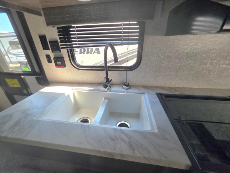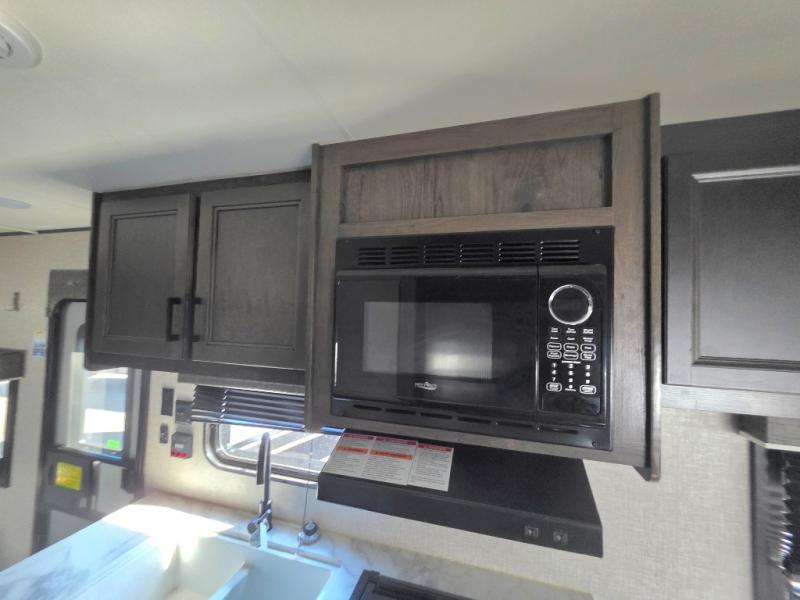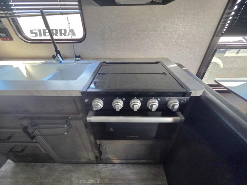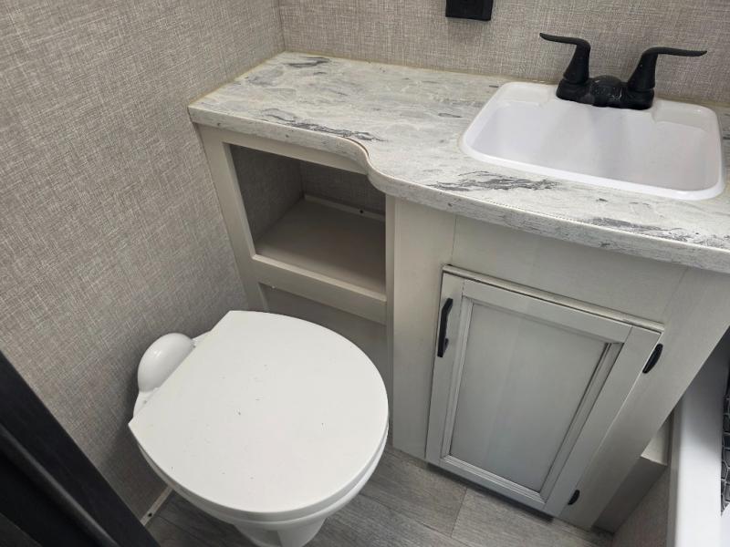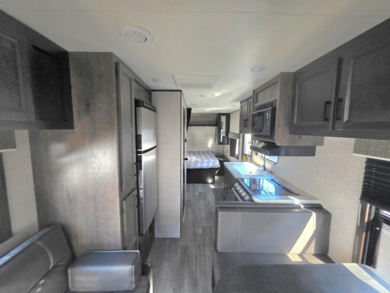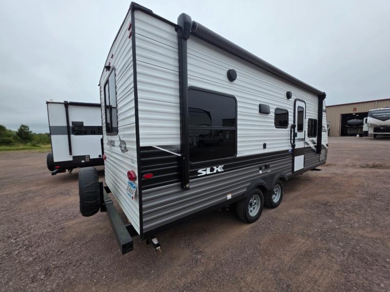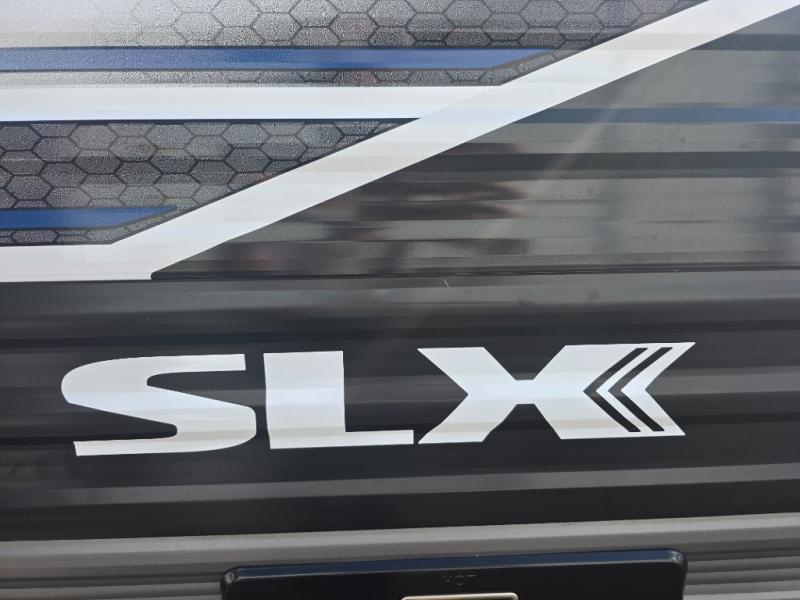 Looking for a couples trailer or a manageable RV that will sleep four when you utilize the furniture as sleeping space? Look no further than this SLX 8 to find a queen bed up front for two, and the jack-knife sofa plus the booth dinette provide sleeping space for two more. The cook will enjoy making meals with everything nearby to keep everyone fed, plus the refrigerator and pantry offer food storage. Everyone can get cleaned up in the full bathroom either in the morning or before bedtime, and the bathroom will come in handy during those night time trips. The outside offers a 16' power awning to relax under as you plan your activities, and there is storage for camping games, charcoal and such along the exterior.