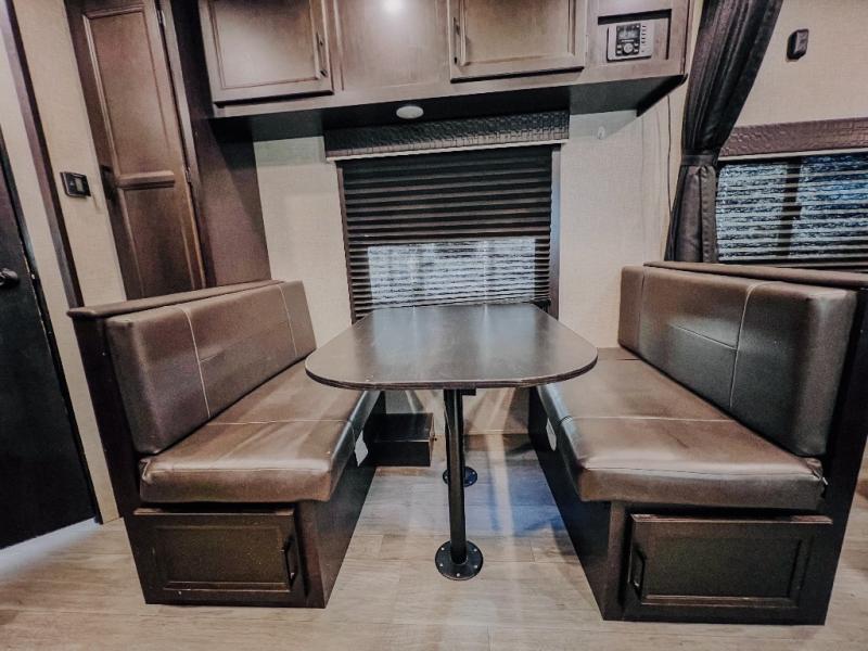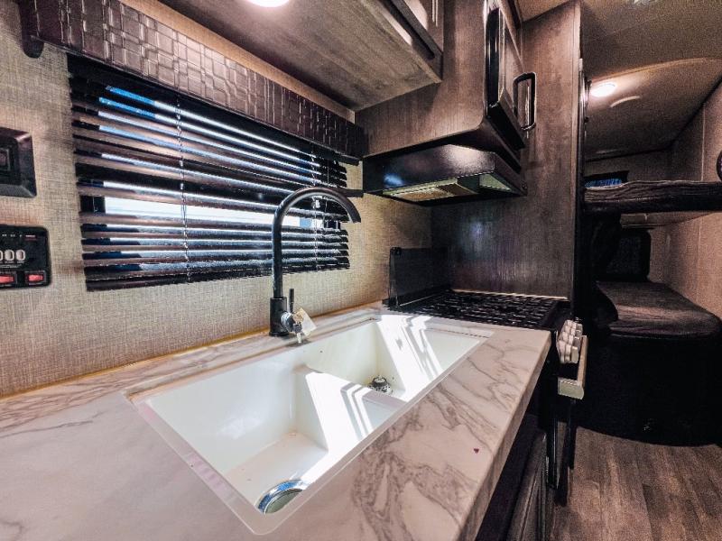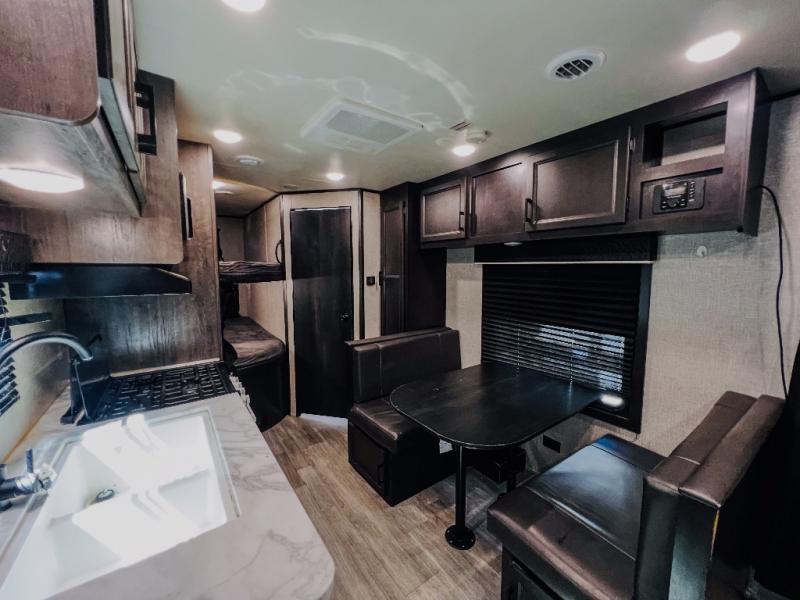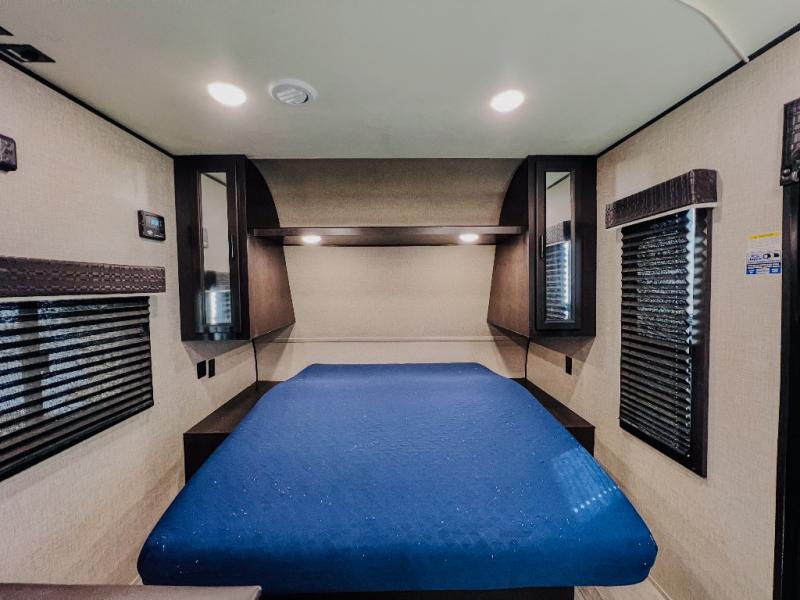 Get ready for family fun or a friend's weekend at the campgrounds in this trailer! This trailer offers full kitchen amenities including a pantry for snacks and such, plus a full rear corner bathroom for privacy and includes a shower. When you need a break, the semi-private bedroom up front offers a queen bed, dual wardrobes and a curtain to close, and the double size bunks offer a curtain to close as well. There is a 13' power awing with LED lights for you to enjoy this outdoor space into the night, plus exterior storage for your outdoor games and gear.
