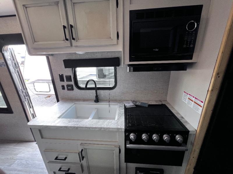 Get ready for family fun or a friend's weekend at the campgrounds in this trailer! This trailer offers full kitchen amenities including a pantry for snacks and such, plus a full rear corner bathroom for privacy and includes a shower. When you need a break, the semi-private bedroom up front offers a queen bed, dual wardrobes and a curtain to close, and the double size bunks offer a curtain to close as well. There is a 13' power awing with LED lights for you to enjoy this outdoor space into the night, plus exterior storage for your outdoor games and gear.