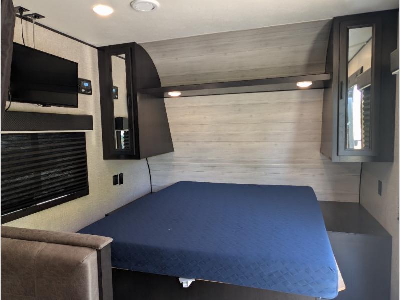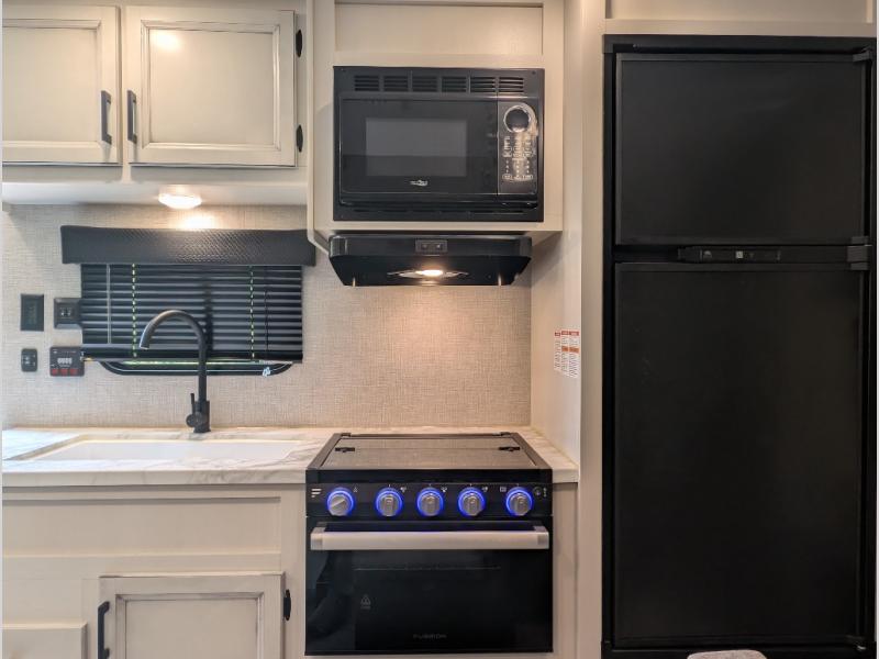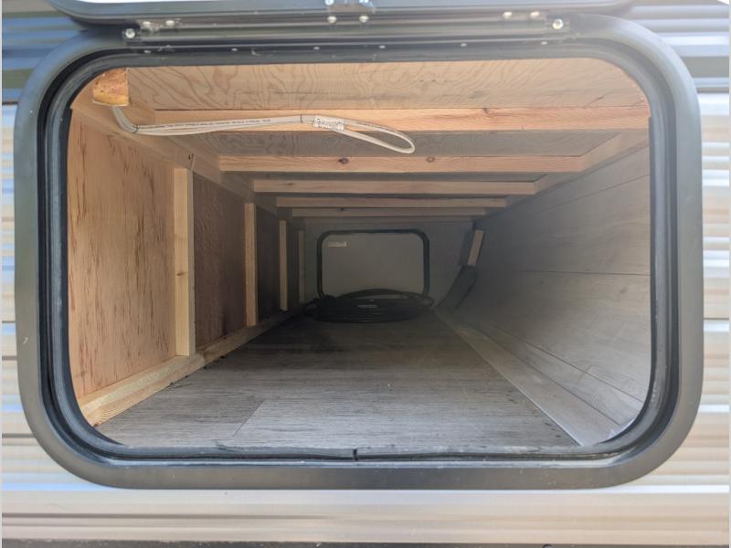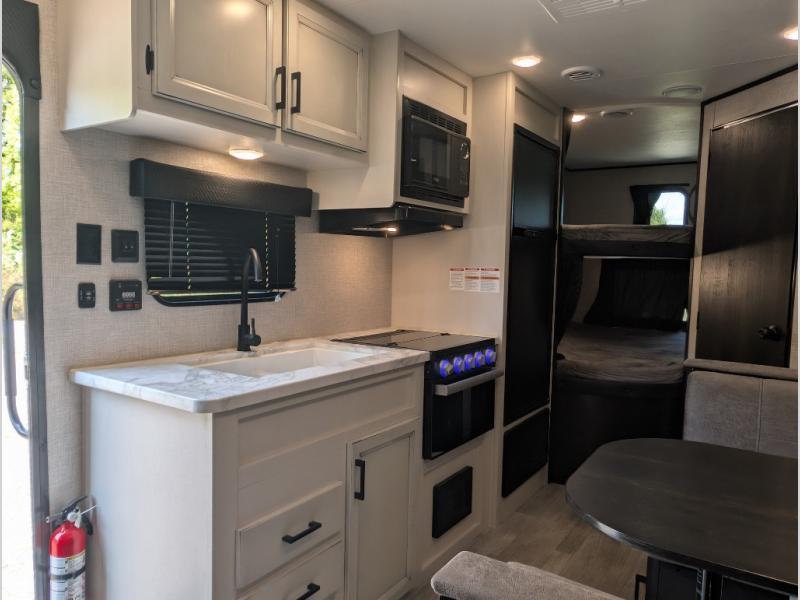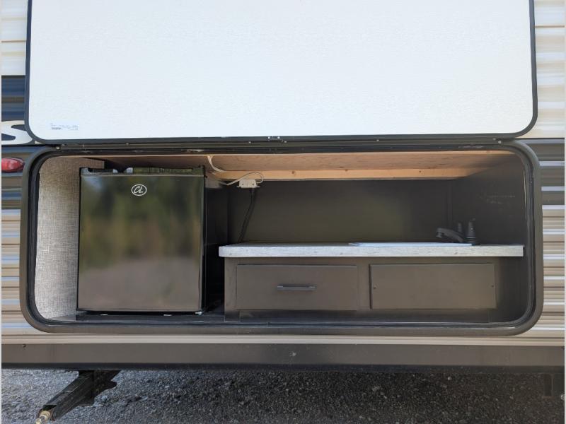 Get ready for family fun or a friend's weekend at the campgrounds in this trailer! This trailer offers full kitchen amenities including a pantry for snacks and such, plus a full rear corner bathroom for privacy and includes a shower. When you need a break, the semi-private bedroom up front offers a queen bed, dual wardrobes and a curtain to close, and the double size bunks offer a curtain to close as well. There is a 13' power awing with LED lights for you to enjoy this outdoor space into the night, plus exterior storage for your outdoor games and gear.