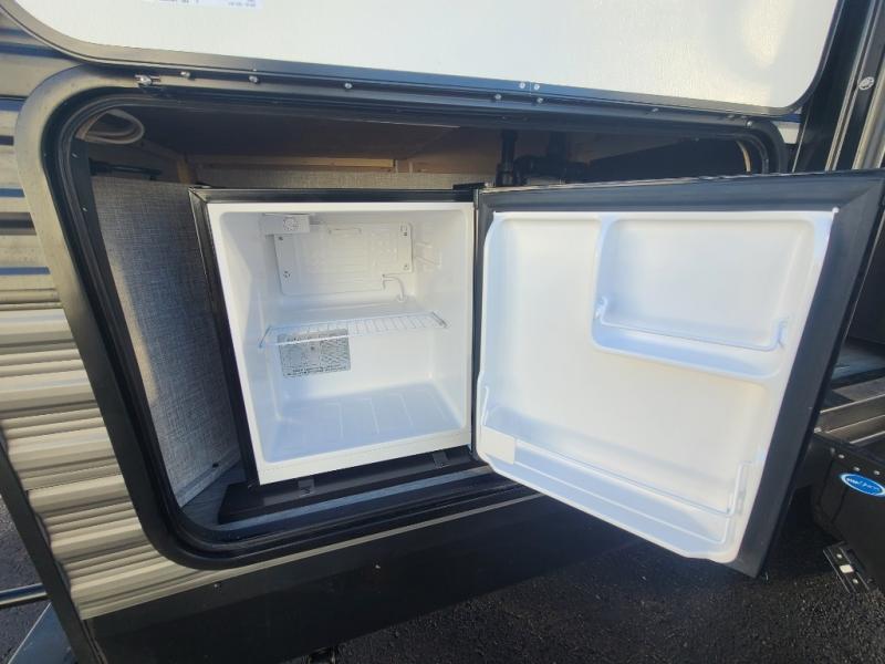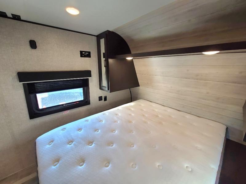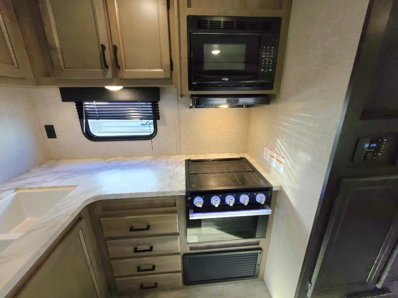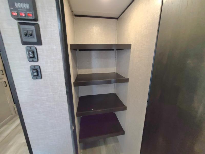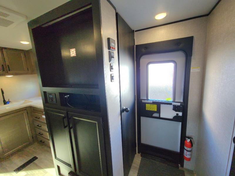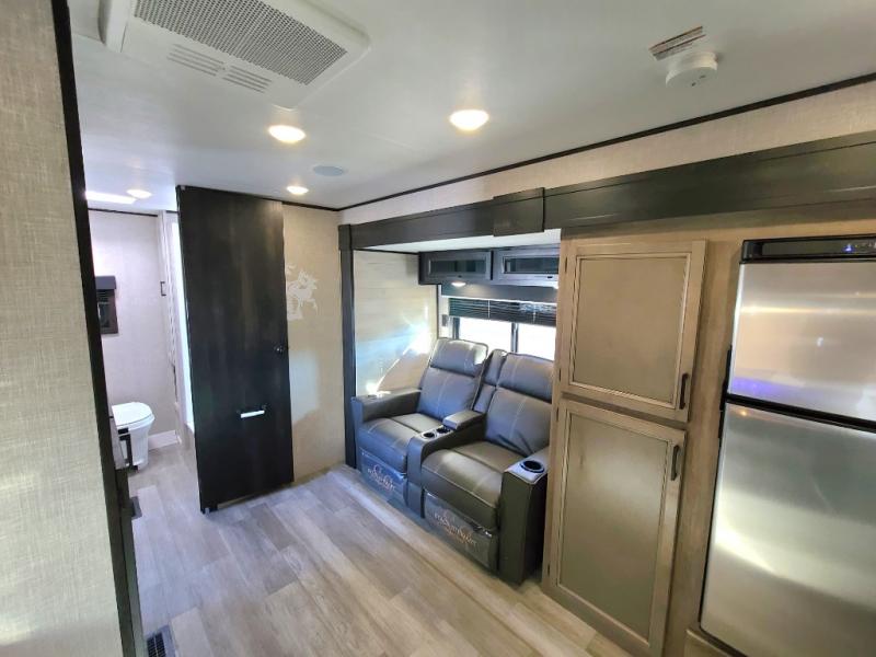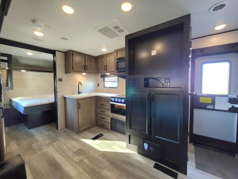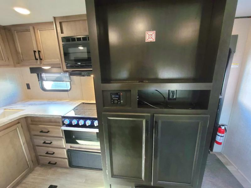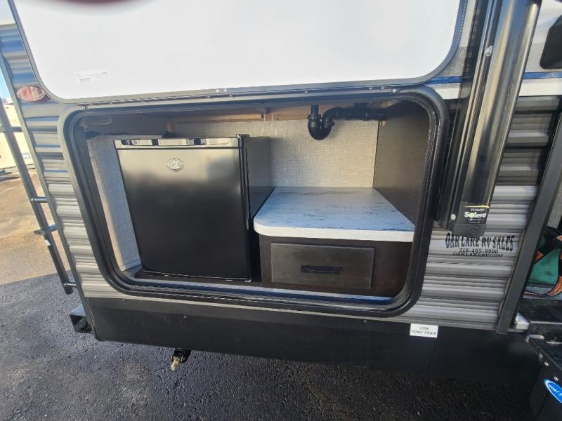 You will feel right at home in this travel trailer! It features a front private bedroom with a 60" x 74" queen bed that has wardrobes on either side and a shelf above to set your books. The kitchen has everything you will need to prepare a delicious home cooked meal including a large pantry to store your favorite snacks. The theater seats are directly across from the entertainment center and can also be switched out for an optional tri-fold sofa. The full rear bathroom has an abundance of room for you to walk around as you get ready each morning, including a extra large counter space. The shower has plenty of room to move around without feeling cramped. You can grab a jacket from the walk-in closet on those crisp mornings and head to the outside kitchen for breakfast with a sunrise!