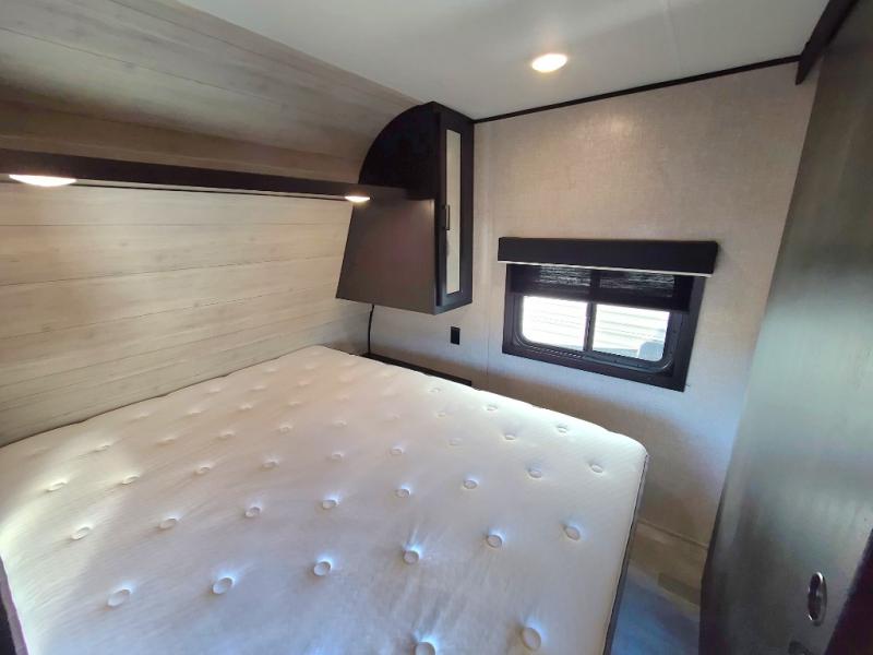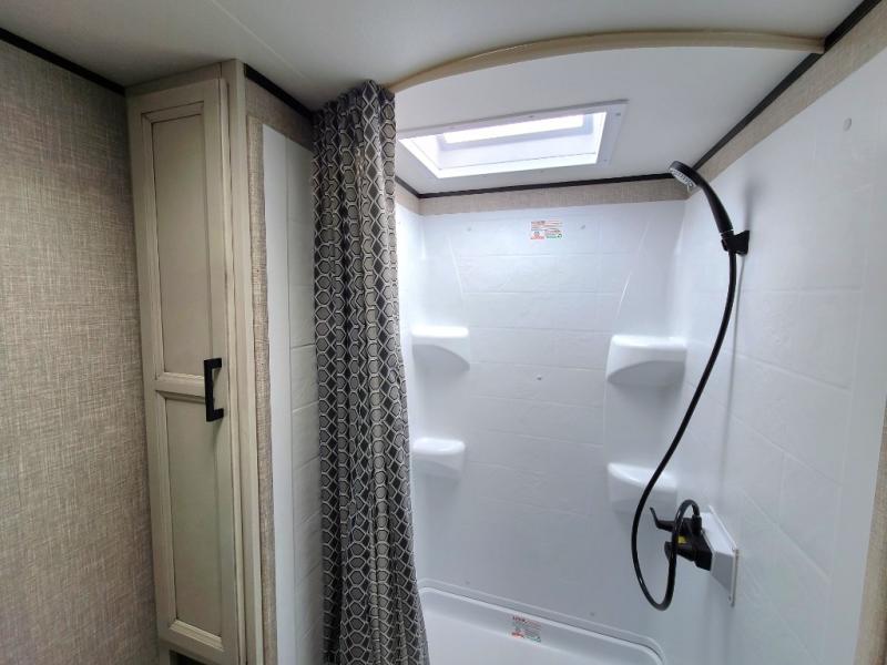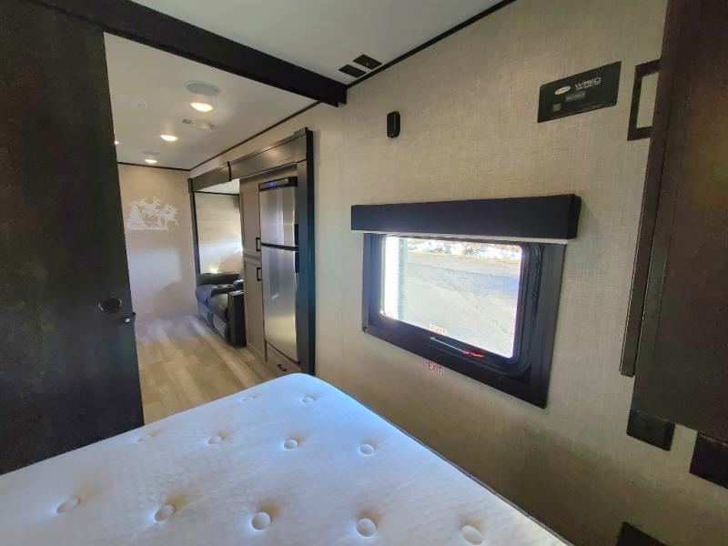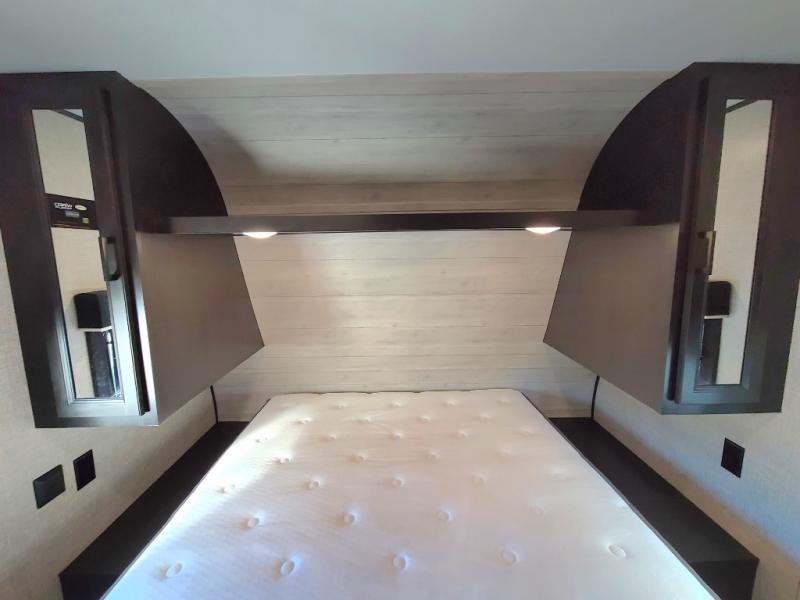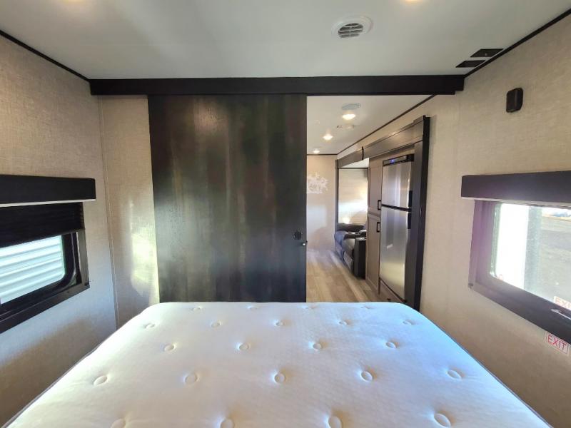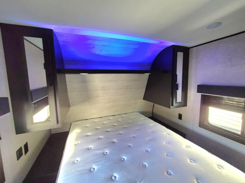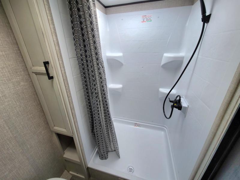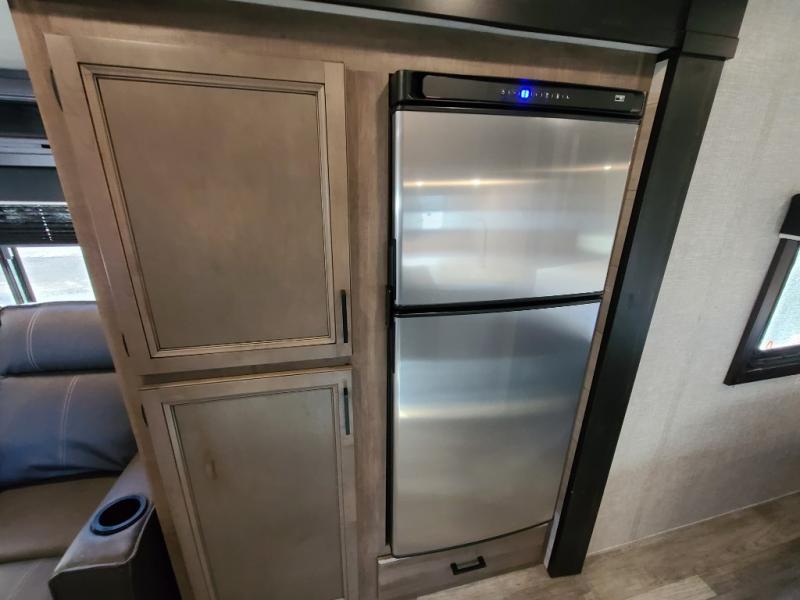 You will feel right at home in this travel trailer! It features a front private bedroom with a 60" x 74" queen bed that has wardrobes on either side and a shelf above to set your books. The kitchen has everything you will need to prepare a delicious home cooked meal including a large pantry to store your favorite snacks. The theater seats are directly across from the entertainment center and can also be switched out for an optional tri-fold sofa. The full rear bathroom has an abundance of room for you to walk around as you get ready each morning, including a extra large counter space. The shower has plenty of room to move around without feeling cramped. You can grab a jacket from the walk-in closet on those crisp mornings and head to the outside kitchen for breakfast with a sunrise!