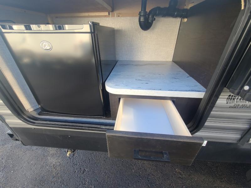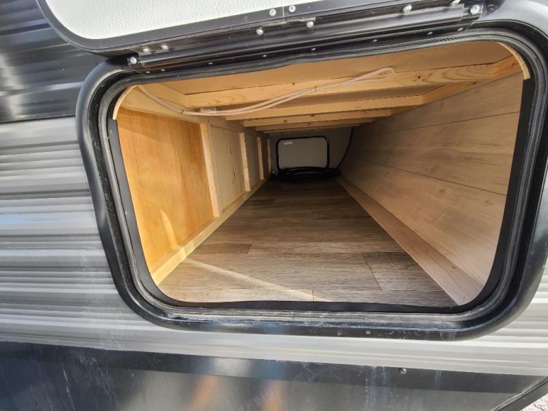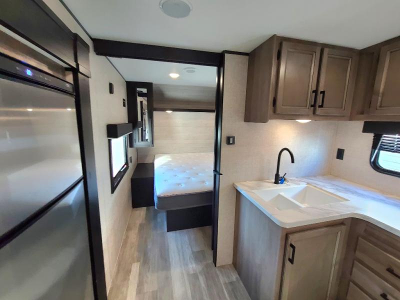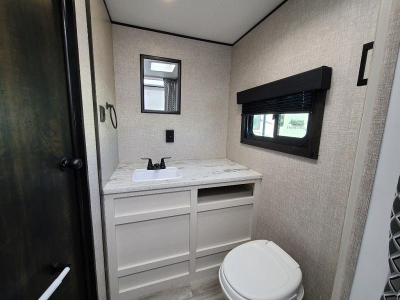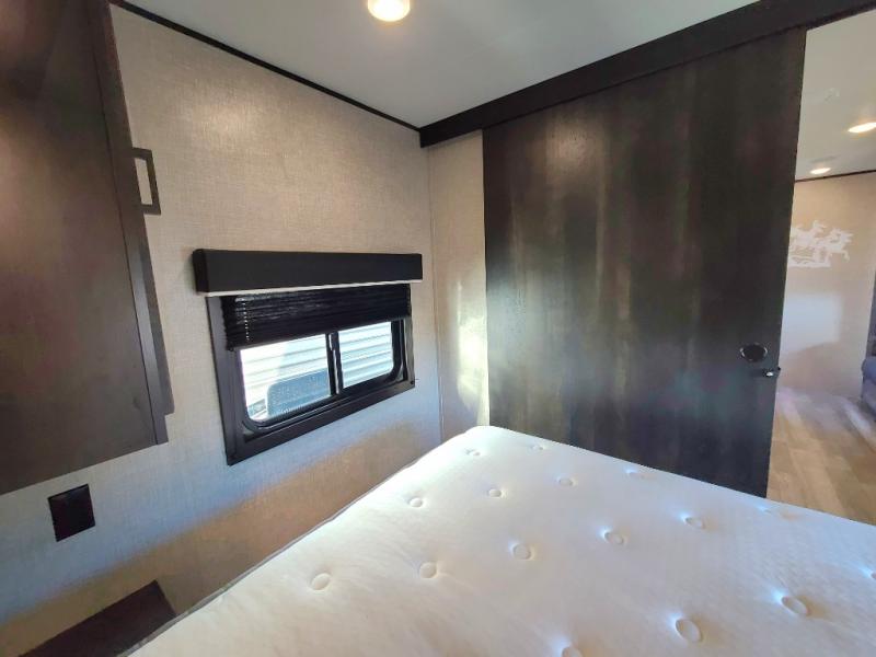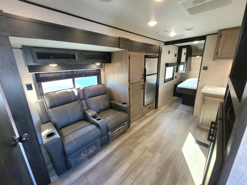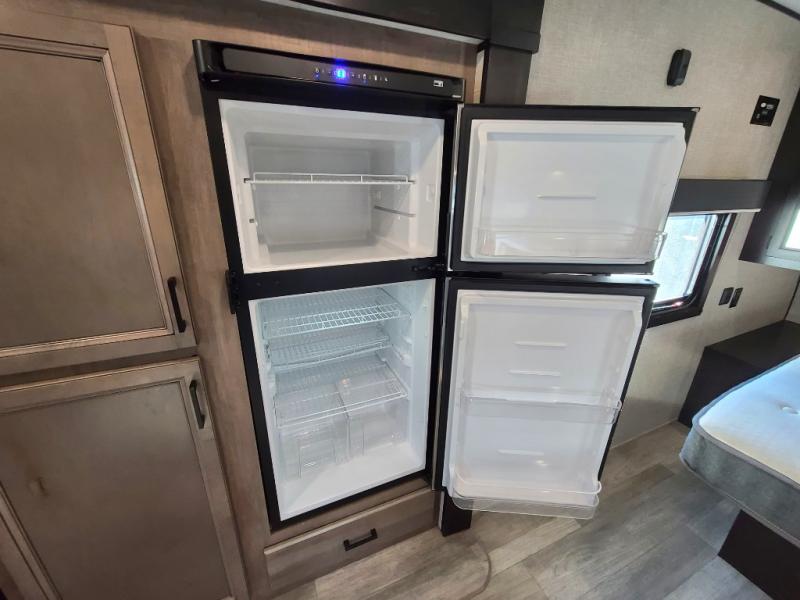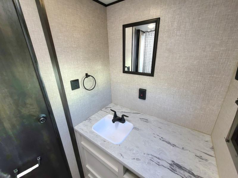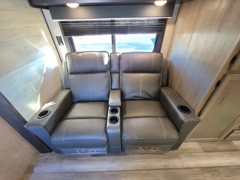 You will feel right at home in this travel trailer! It features a front private bedroom with a 60" x 74" queen bed that has wardrobes on either side and a shelf above to set your books. The kitchen has everything you will need to prepare a delicious home cooked meal including a large pantry to store your favorite snacks. The theater seats are directly across from the entertainment center and can also be switched out for an optional tri-fold sofa. The full rear bathroom has an abundance of room for you to walk around as you get ready each morning, including a extra large counter space. The shower has plenty of room to move around without feeling cramped. You can grab a jacket from the walk-in closet on those crisp mornings and head to the outside kitchen for breakfast with a sunrise!