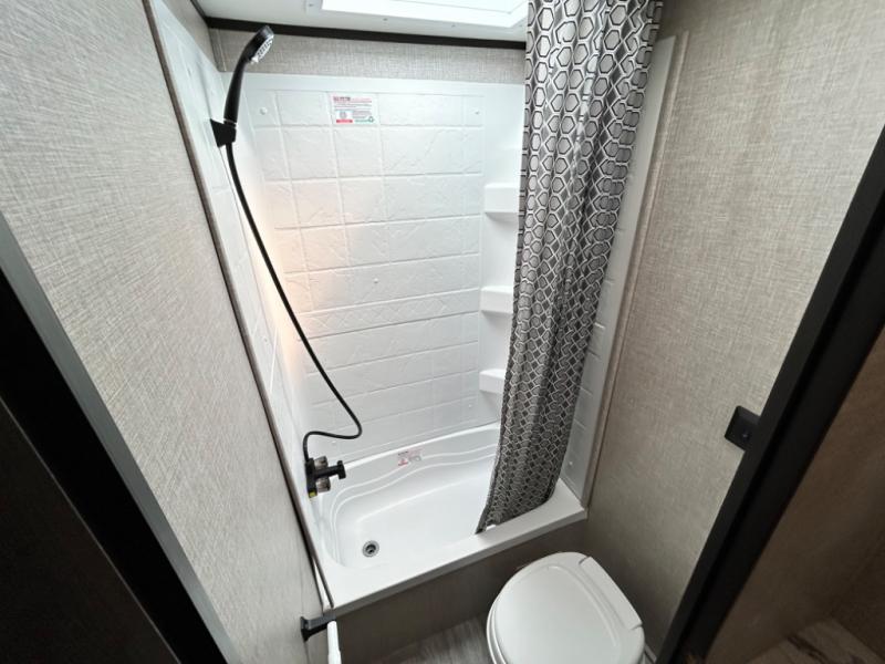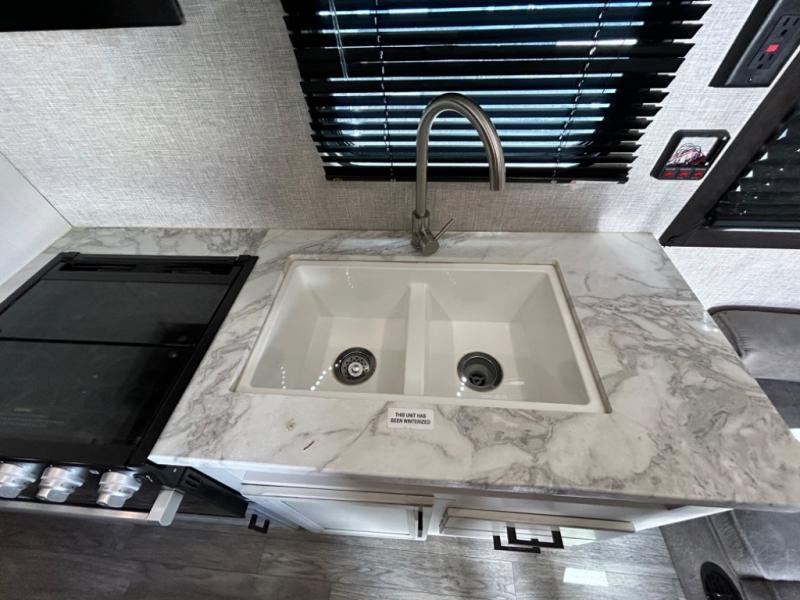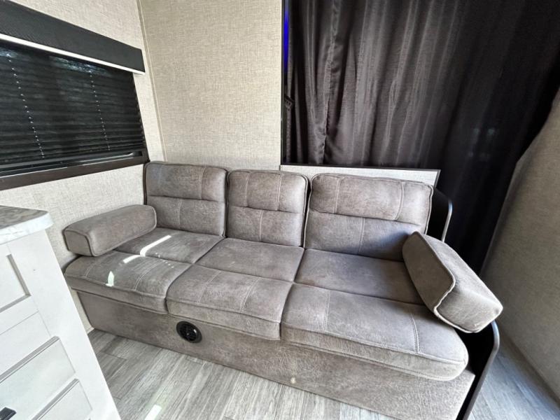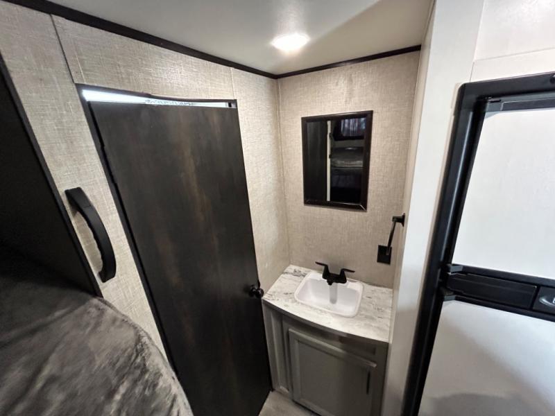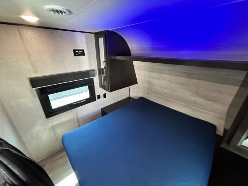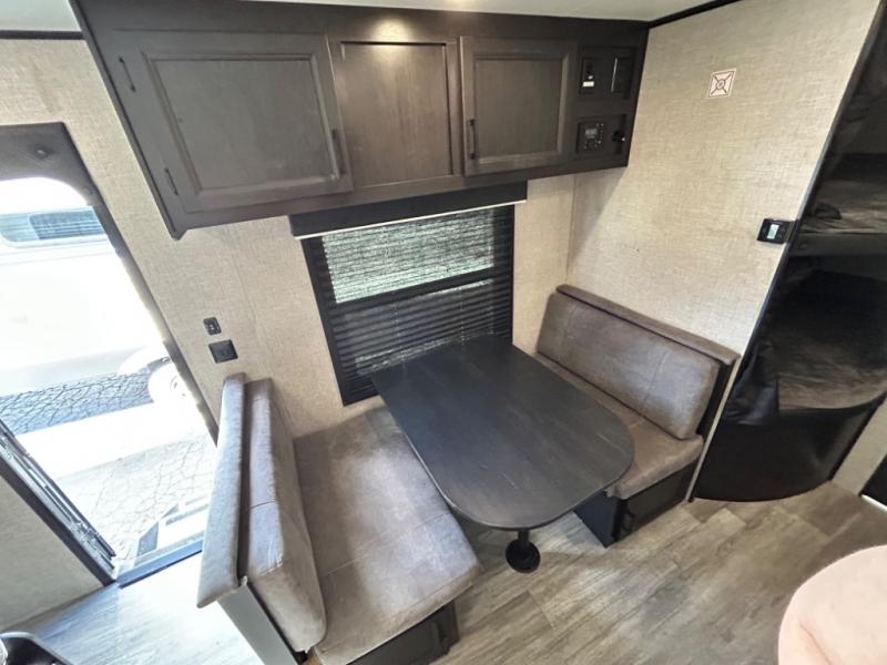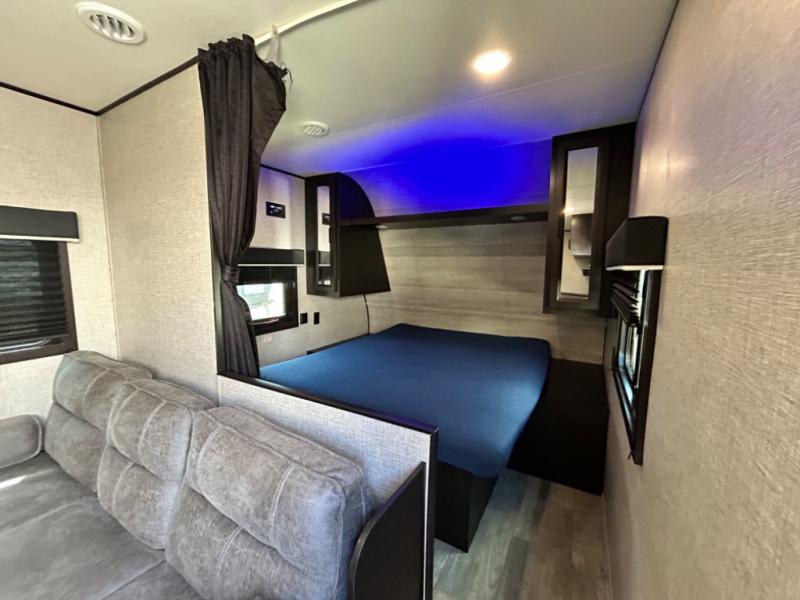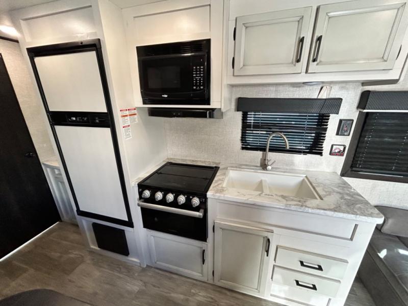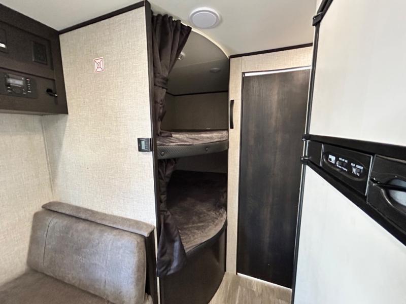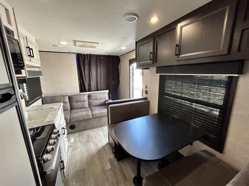 This easy to setup trailer offers a semi-private bedroom up front with a queen bed, semi-private double size bunks in the rear thanks to the curtains, and a private toilet and tub/shower room. The bathroom sink is just outside the door allowing two people to get ready for bed at once. The galley kitchen offers full amenities, and two can dine at the booth dinette and some can relax on the jack-knife sofa. Both furnishings offer extra sleeping space. And you might like to add the Chil N' Stor option which adds a fridge and counter space along the exterior to serve meals outside and store extra beverages.