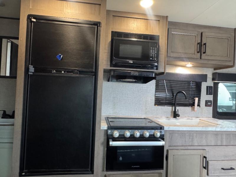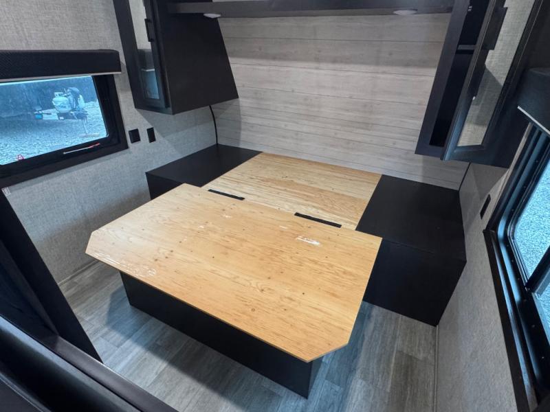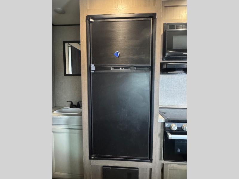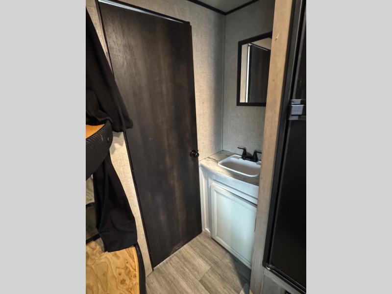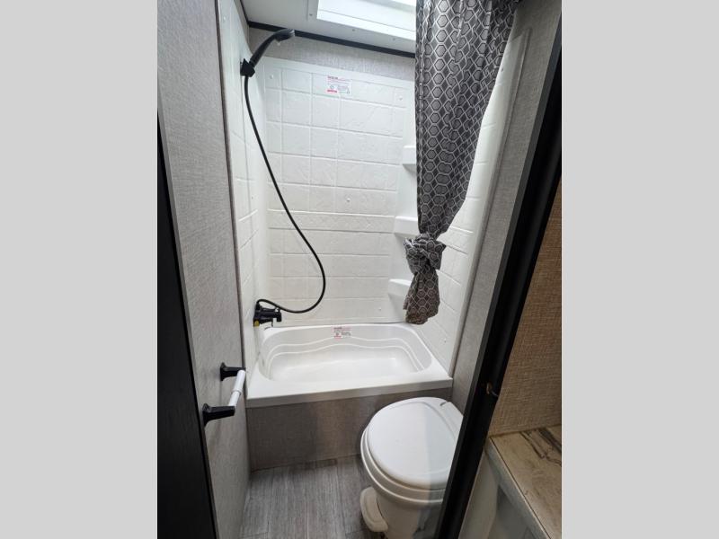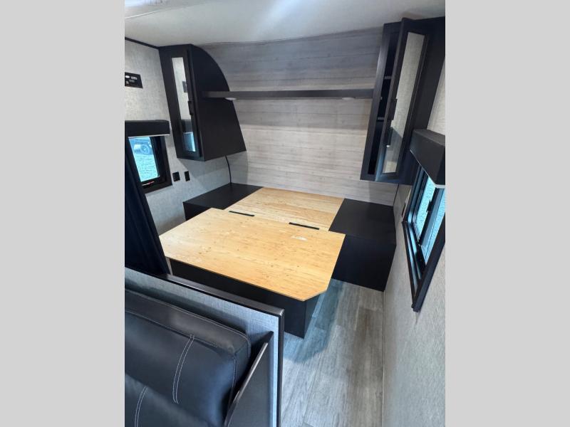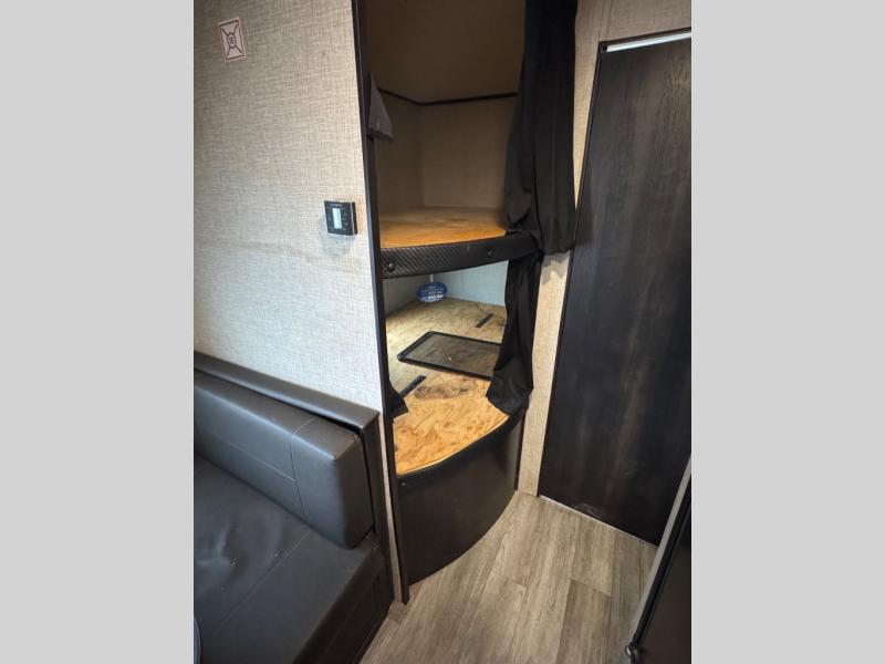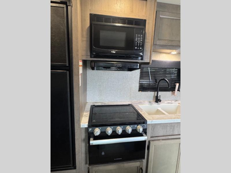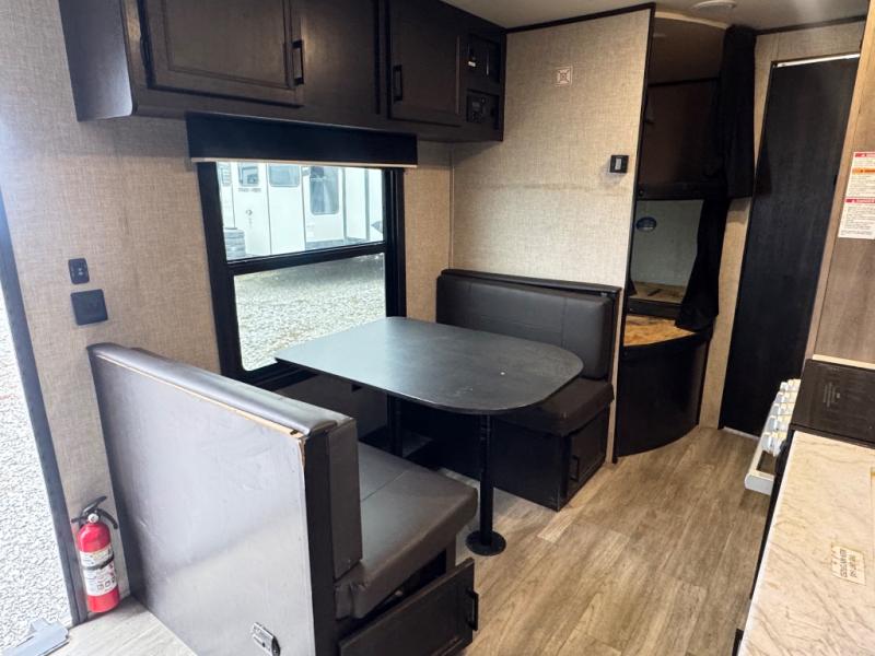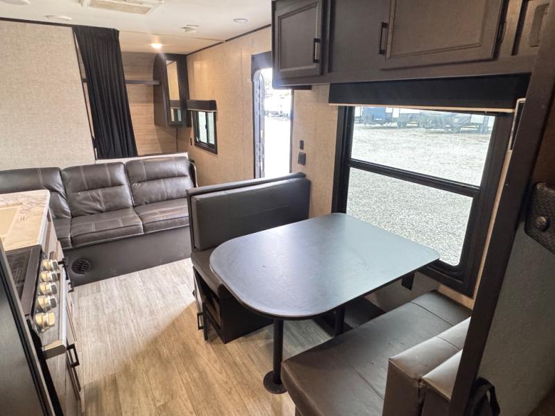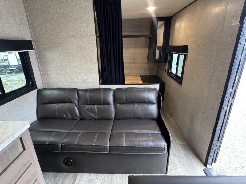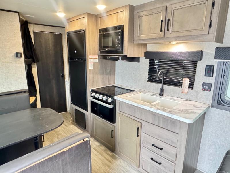 This easy to setup trailer offers a semi-private bedroom up front with a queen bed, semi-private double size bunks in the rear thanks to the curtains, and a private toilet and tub/shower room. The bathroom sink is just outside the door allowing two people to get ready for bed at once. The galley kitchen offers full amenities, and two can dine at the booth dinette and some can relax on the jack-knife sofa. Both furnishings offer extra sleeping space. And you might like to add the Chil N' Stor option which adds a fridge and counter space along the exterior to serve meals outside and store extra beverages.
