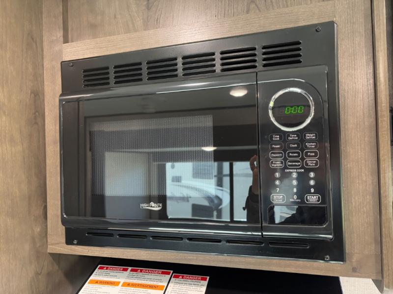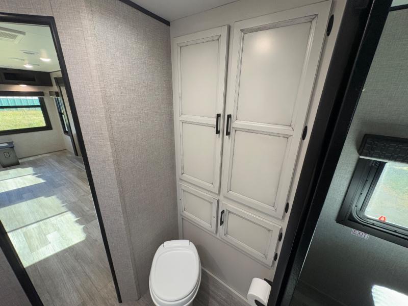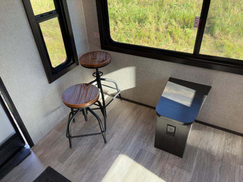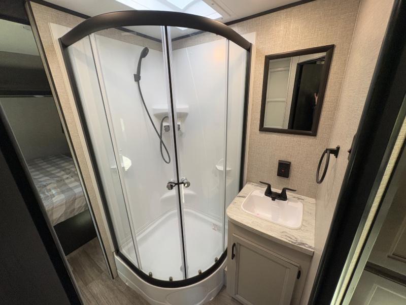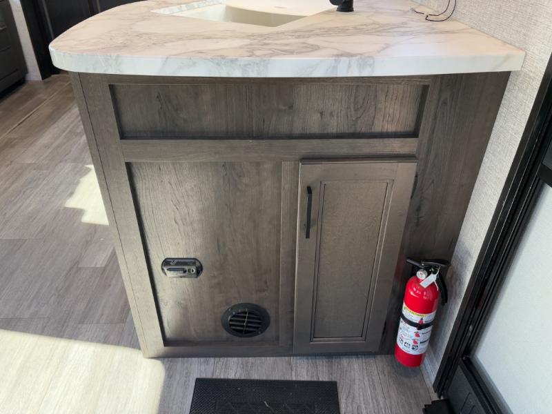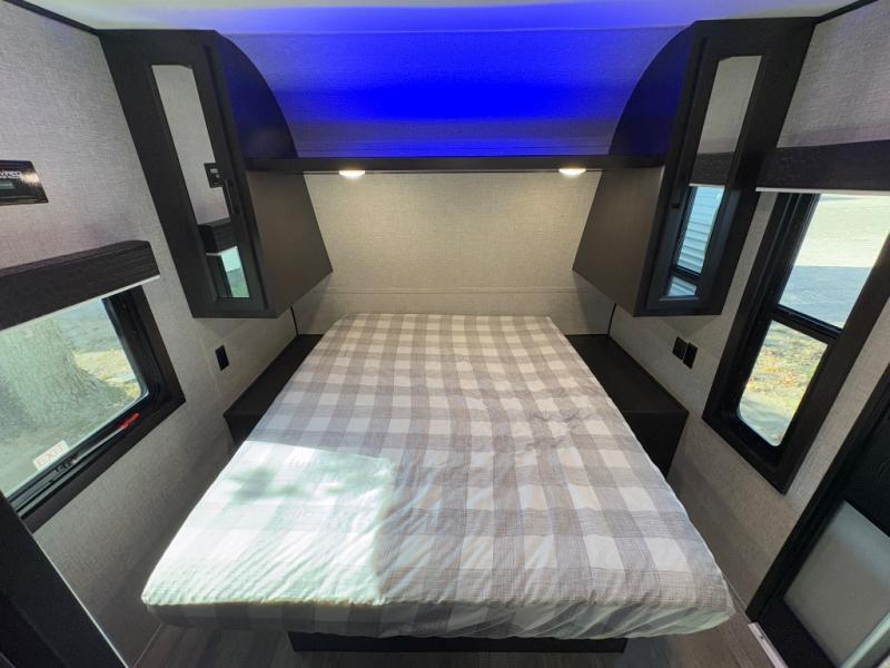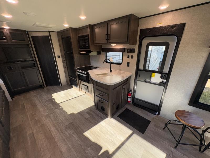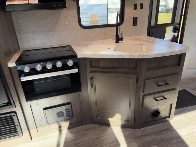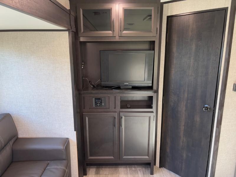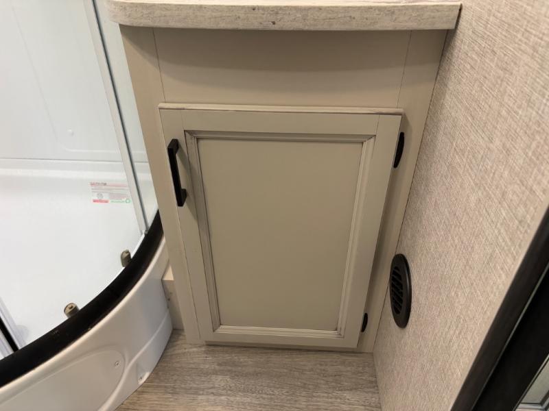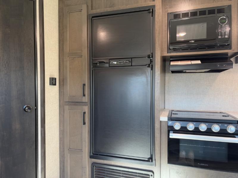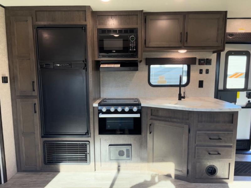 When you want to travel and see new places, this trailer gives you the flexibility to sleep two to four, plus offers a full walk-through bathroom with access from the main area and the front private bedroom. You will also appreciate having a second entry/exit door in the bedroom, a walk-around queen bed, plus dual wardrobes giving you your own side of the bed. The bathroom also has a radius shower and linen storage. The kitchen includes full amenities to make your own meals, and a pantry to keep your dry goods and snacks. You will love the rear swivel rockers with table in between to place your drinks, and the jack-knife sofa plus booth dinette offer more seating, sleeping space, and extra floor space since they are within a slide.