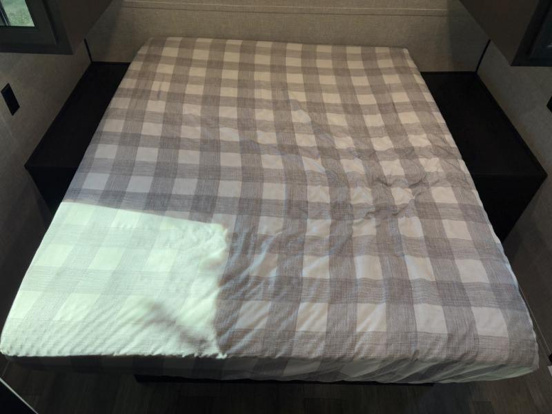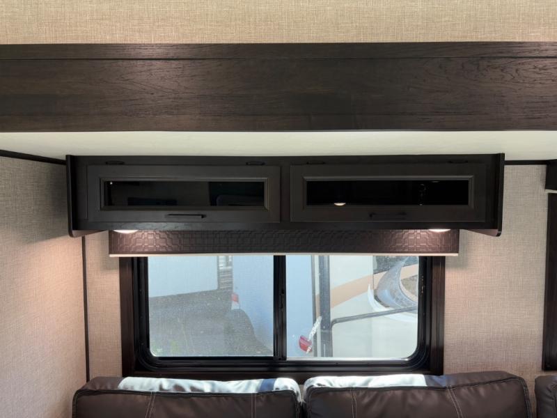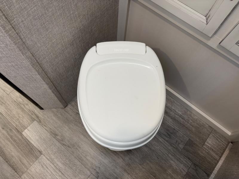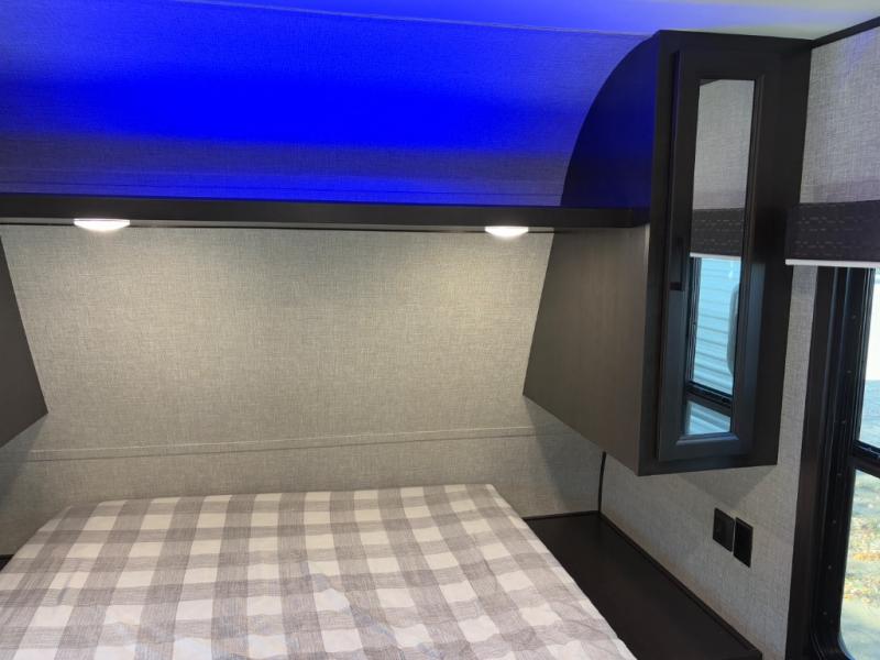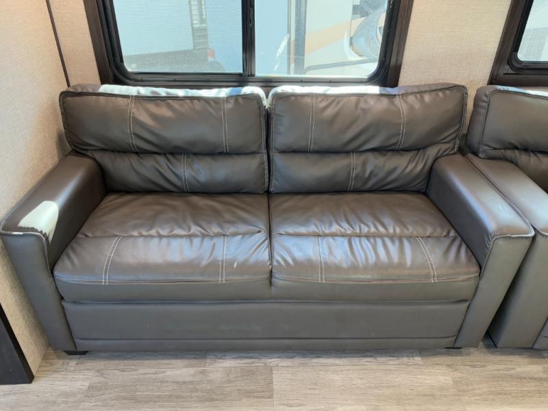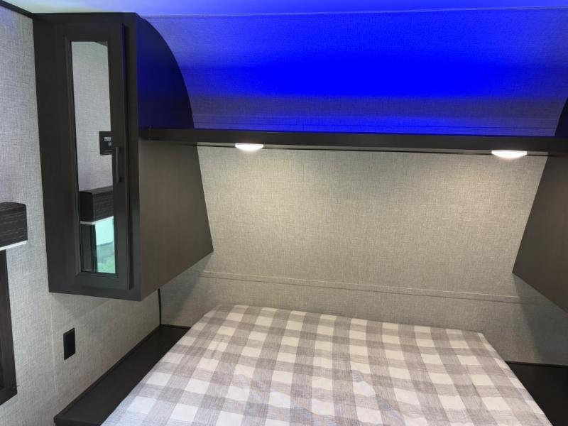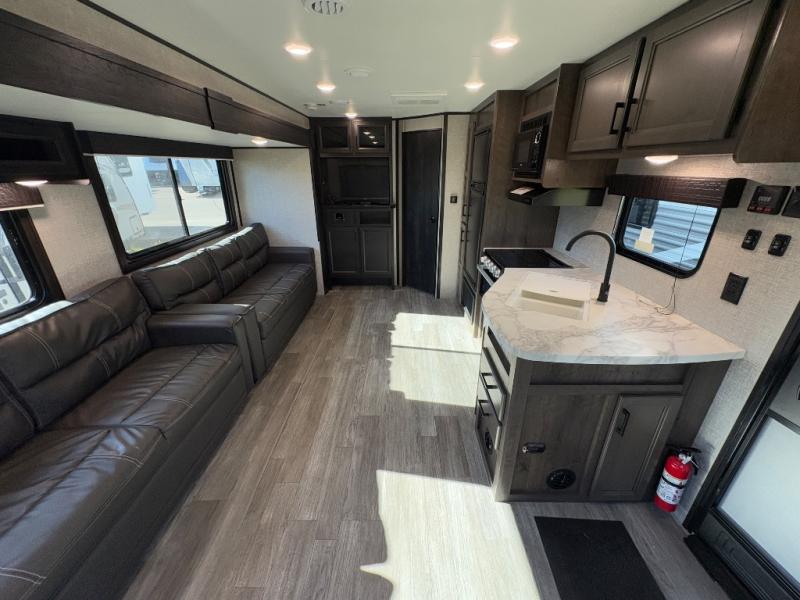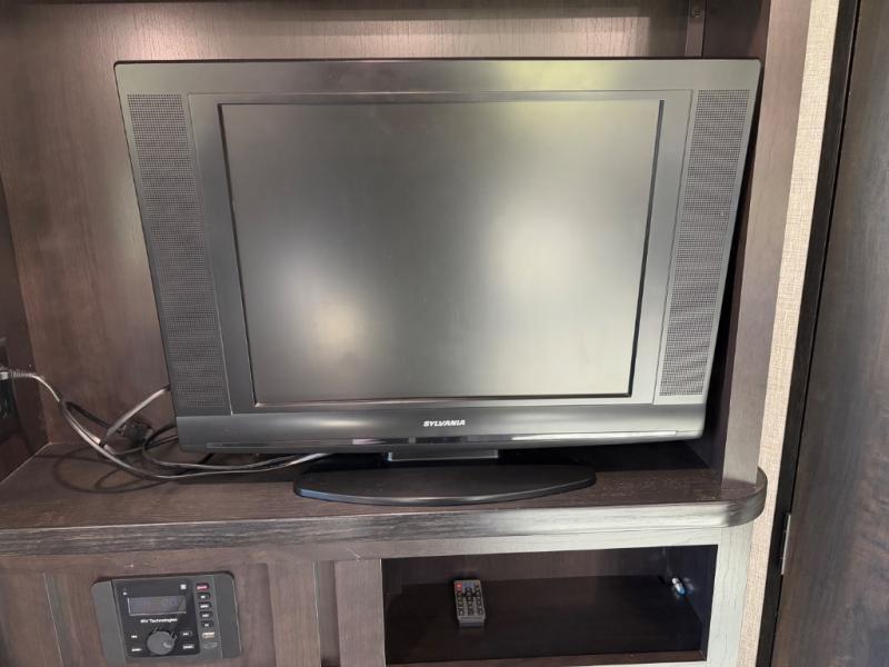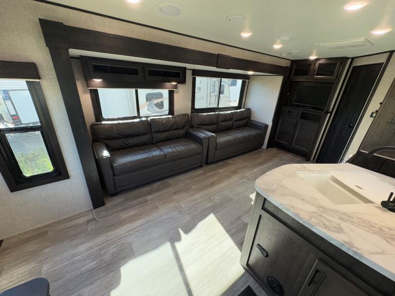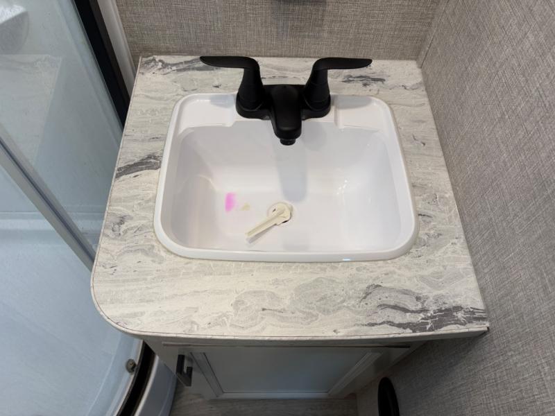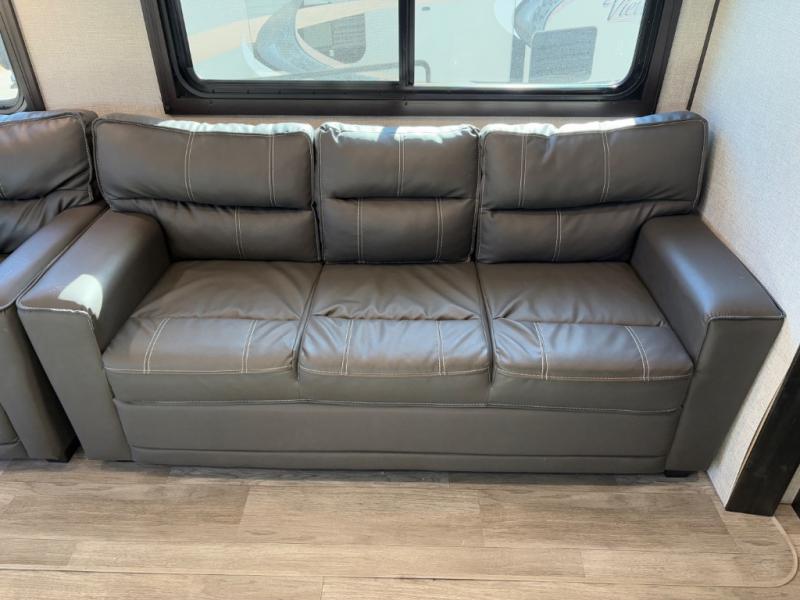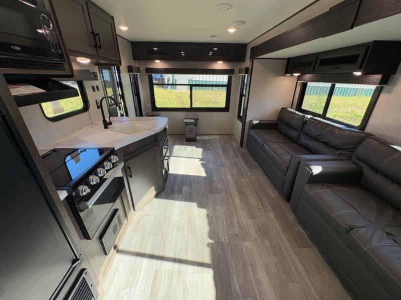 When you want to travel and see new places, this trailer gives you the flexibility to sleep two to four, plus offers a full walk-through bathroom with access from the main area and the front private bedroom. You will also appreciate having a second entry/exit door in the bedroom, a walk-around queen bed, plus dual wardrobes giving you your own side of the bed. The bathroom also has a radius shower and linen storage. The kitchen includes full amenities to make your own meals, and a pantry to keep your dry goods and snacks. You will love the rear swivel rockers with table in between to place your drinks, and the jack-knife sofa plus booth dinette offer more seating, sleeping space, and extra floor space since they are within a slide.