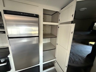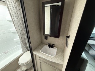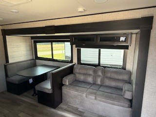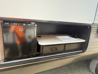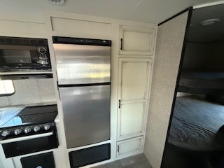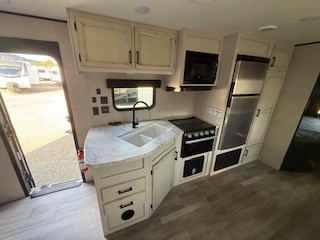 A larger family or group of friends can enjoy camping together in this trailer thanks to the booth dinette and jack-knife sofa slide providing more interior floor space and a place for two or maybe more to sleep at night. And the double size bunks are a fun place to sleep when you need four more spots, plus the privacy curtain will come in handy. The private toilet and tub/shower will keep everyone refreshed and the bathroom sink is just outside the door allowing two people to get ready at one time. The front bedroom offers the owners privacy and there is dual access, two wardrobes and a queen bed to enjoy. The cook will find full amenities indoor, plus there is an outside kitchen to make more meals.