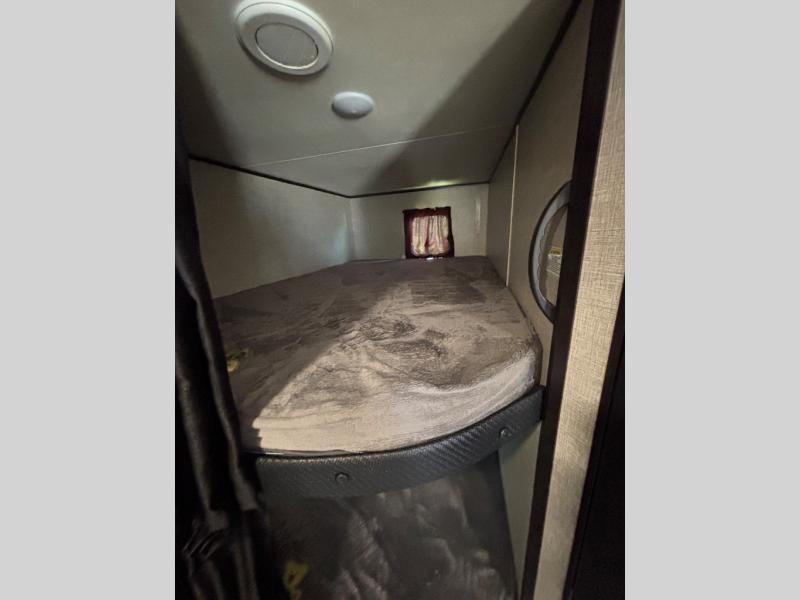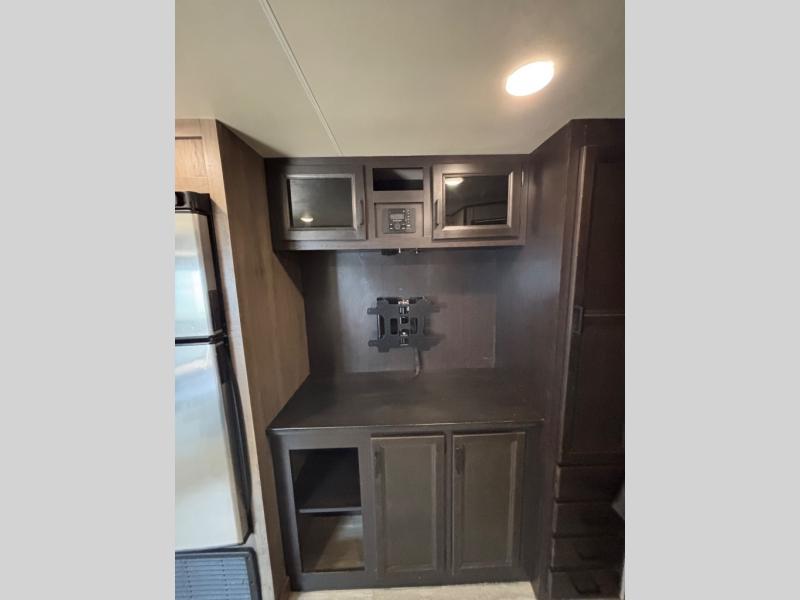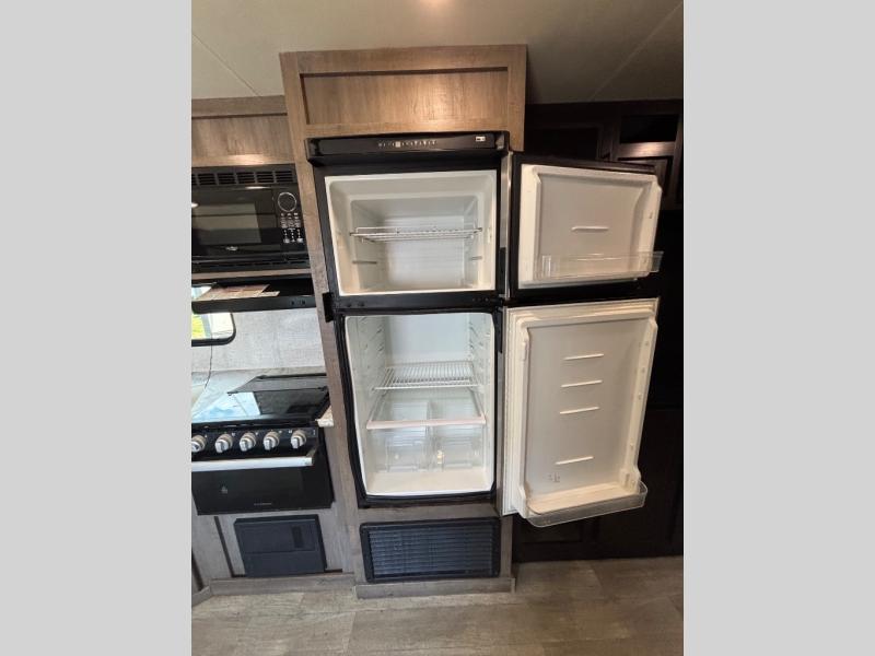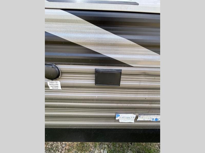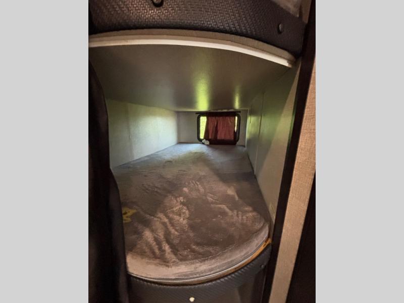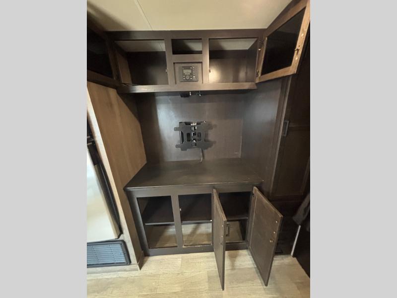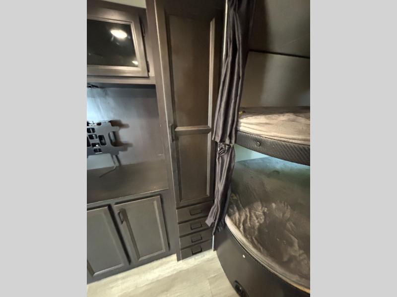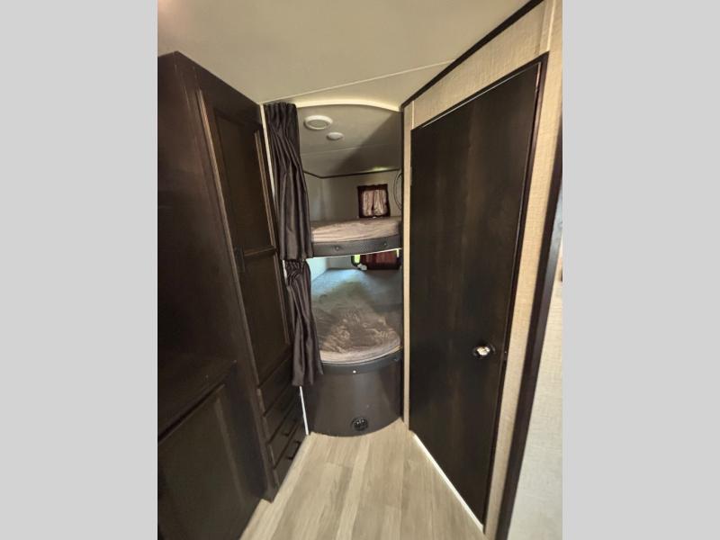Loads of fun like hiking, fishing, and playing outdoor camping games are waiting for you to make that reservation, hitch up and head out! This trailer allows the owners to sleep in privacy behind the space saving sliding door on a queen bed. And the kids or grandkids can sleep on the double size bunks in the rear next to the full bathroom including a tub/shower. They even have a wardrobe nearby for their things. The slide out jack-knife sofa and U-shaped dinette offers more floor space, a place to relax and dine, plus you can play games at the dinette. The kitchen includes full amenities at your fingertips, plus you all can enjoy the entertainment center with TV when inside. When you want to be outdoors, relax under the 16' power awning after grabbing your camping chairs, and the cook can make a snack on the outside kitchen.