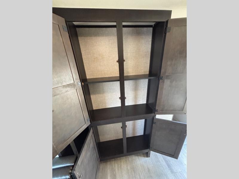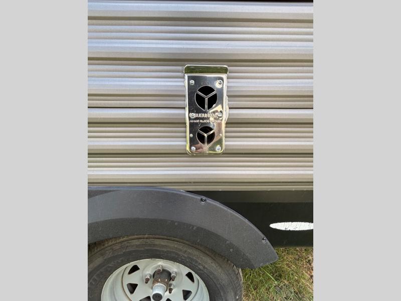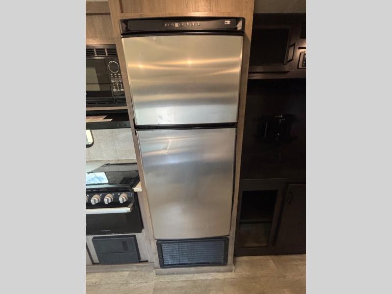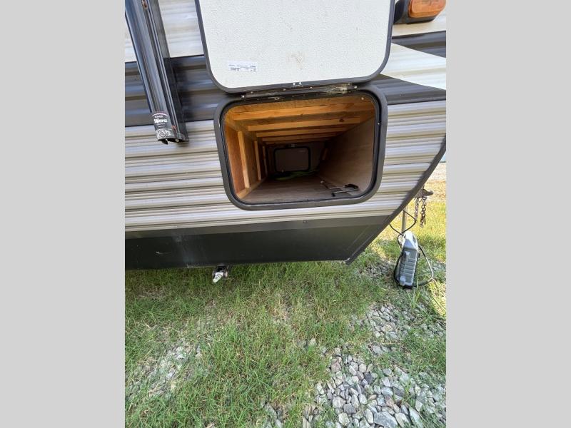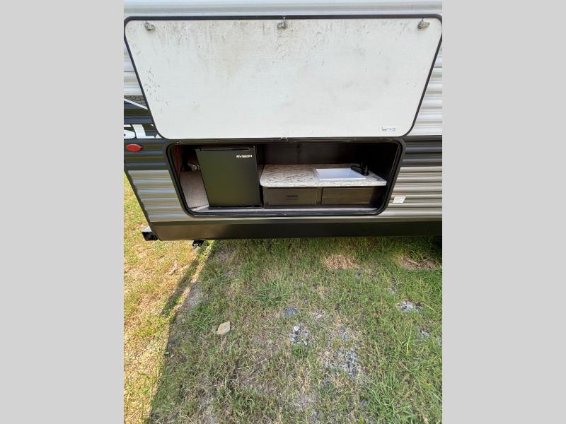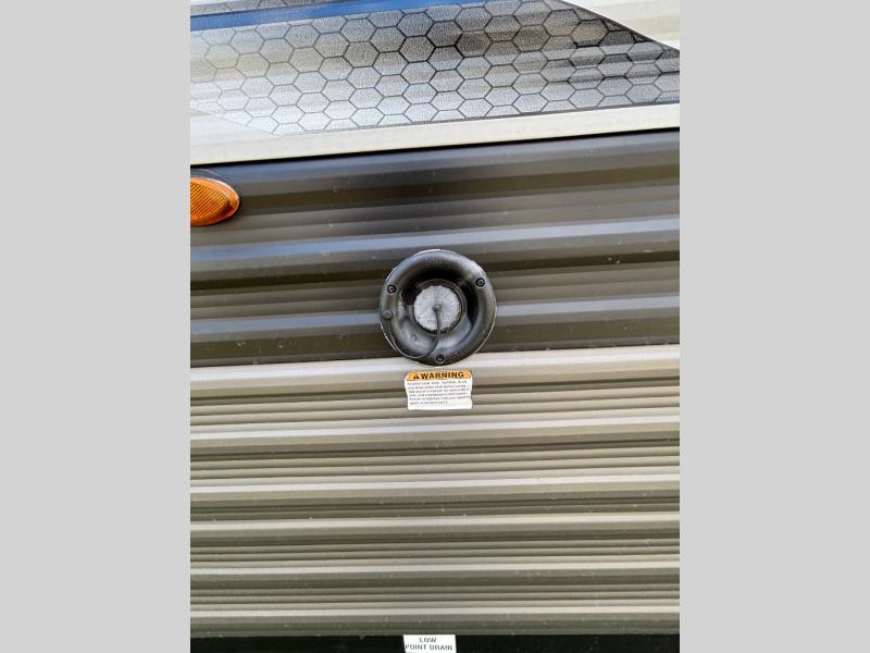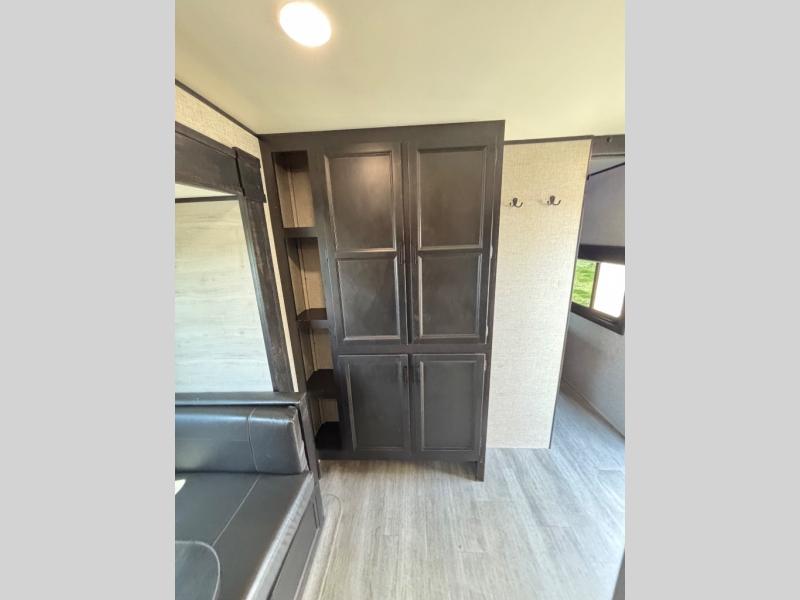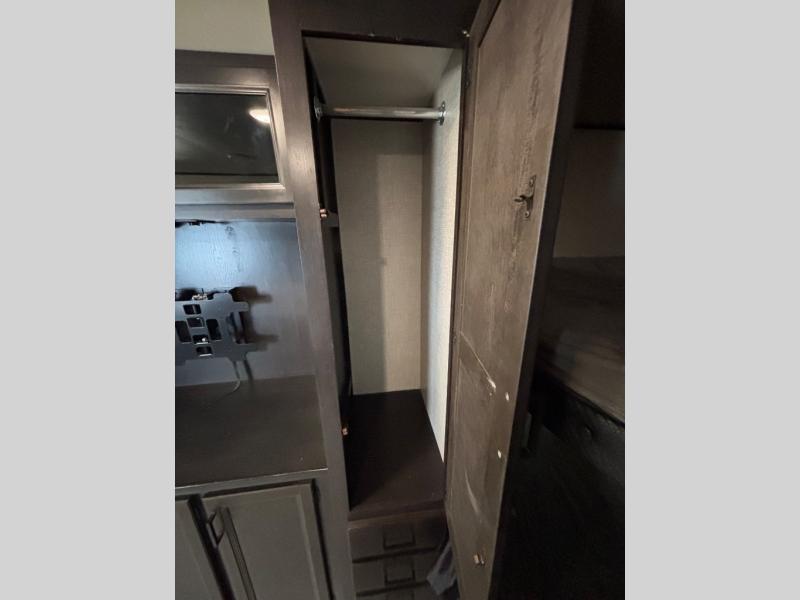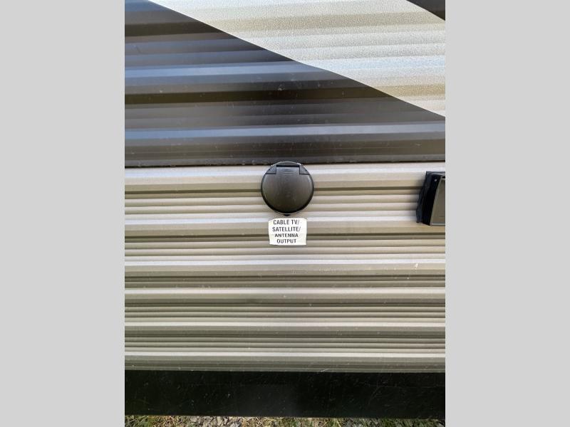 Loads of fun like hiking, fishing, and playing outdoor camping games are waiting for you to make that reservation, hitch up and head out! This trailer allows the owners to sleep in privacy behind the space saving sliding door on a queen bed. And the kids or grandkids can sleep on the double size bunks in the rear next to the full bathroom including a tub/shower. They even have a wardrobe nearby for their things. The slide out jack-knife sofa and U-shaped dinette offers more floor space, a place to relax and dine, plus you can play games at the dinette. The kitchen includes full amenities at your fingertips, plus you all can enjoy the entertainment center with TV when inside. When you want to be outdoors, relax under the 16' power awning after grabbing your camping chairs, and the cook can make a snack on the outside kitchen.