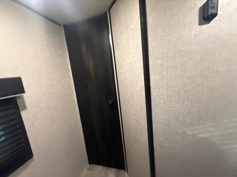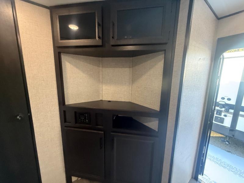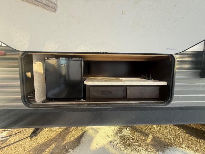 The kids or grandkids will have a fun time sleeping on the set of 48" x 80" double bunk beds in this travel trailer! You will enjoy your own privacy with the front bedroom which has a 60" x 74" queen bed, two wardrobes, and a closet to keep your clothes looking nice. Everyone can enjoy a meal or play a card game at the U-shaped dinette and enjoy the entertainment center across from a jack-knife sofa which can be switched out for the optional tri-fold sofa. You can even breathe in some fresh air while you cook dinner thanks to the outside kitchen!