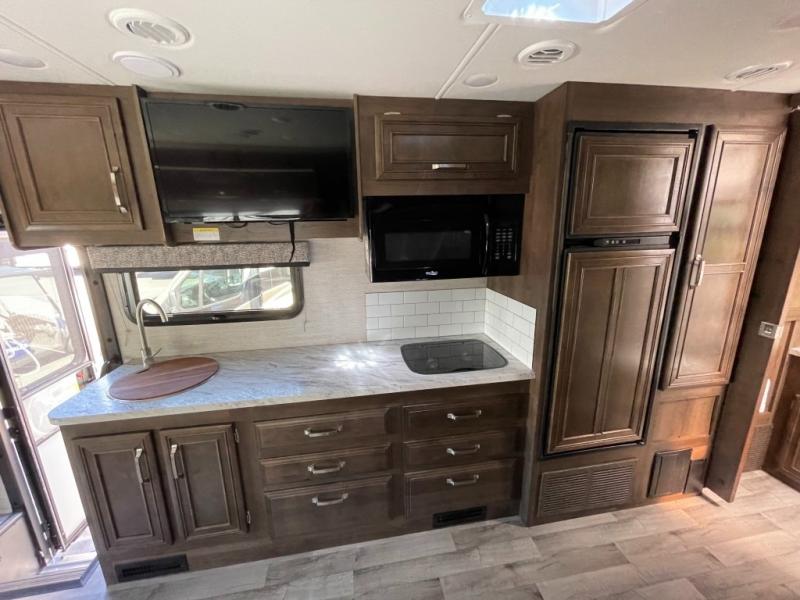 Each Melbourne Class C diesel motorhome by Jayco features durable Stronghold VBL lamination, bead-foam insulation, and a seamless front cap that resists wear and tear from the elements. There are seatbelts in all designated seating locations, and the captain's seats swivel around so they can become a part of the living area once parked. You'll appreciate an Onan 3,600-watt LP generator on board, as well as a 13,500 BTU A/C and a 30,000 BTU furnace to keep you comfortable year around. The interior of the Melbourne will have you feeling right at home with high-intensity LED lights, an 83" interior height with a padded vinyl ceiling, hardwood cabinet doors and drawers, and more!