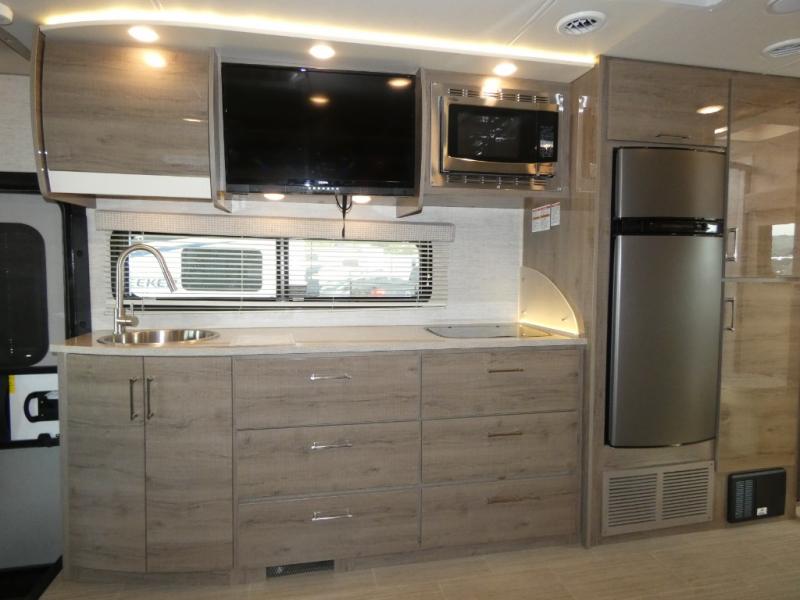 With any Melbourne Prestige Class C diesel motorhome by Jayco, every sidewall, rear wall and slide room wall is bonded together with Stronghold VBL lamination to create the lightest, yet strongest, construction available in the RV industry, plus there is a one-piece, seamless front cap that resists wear and tear from years on the road. The interior offers an overhead bunk with 750 lbs. capacity which is way over the industry standard and allows for more overnight guests. And you will find seatbelts installed in every designed seating location to keep your favorite people safe. Other standout features include the JAYCOMMAND powered by Fireplay giving you full control of key operations from your phone or tablet, a Truma AquaGo Comfort Plus tankless water heater, a water filtration system, ball-bearing drawer guides, and an 80-inch interior ceiling height with padded vinyl ceiling giving you more space to enjoy.