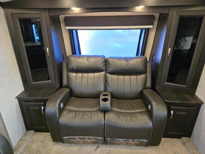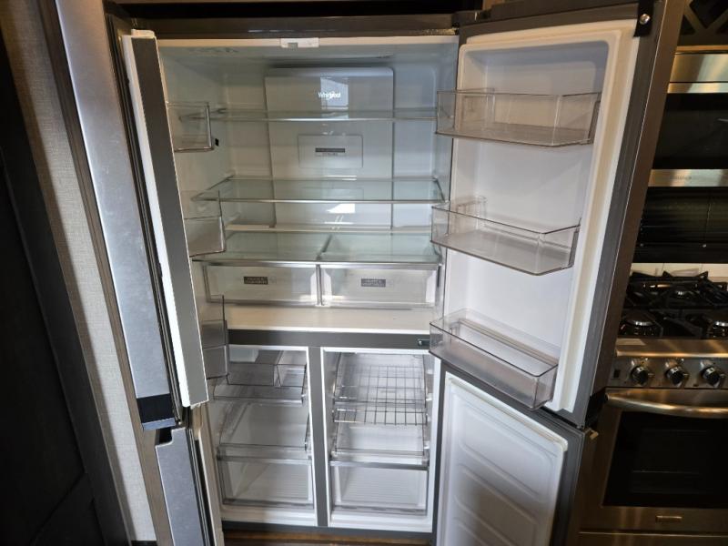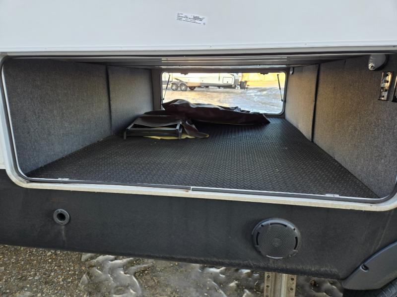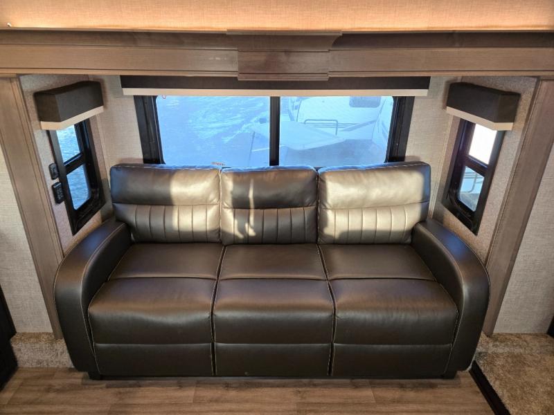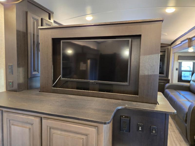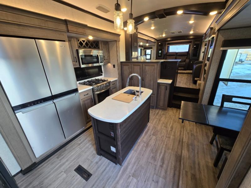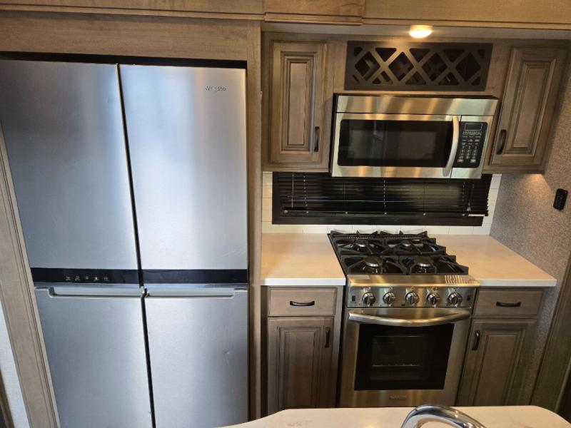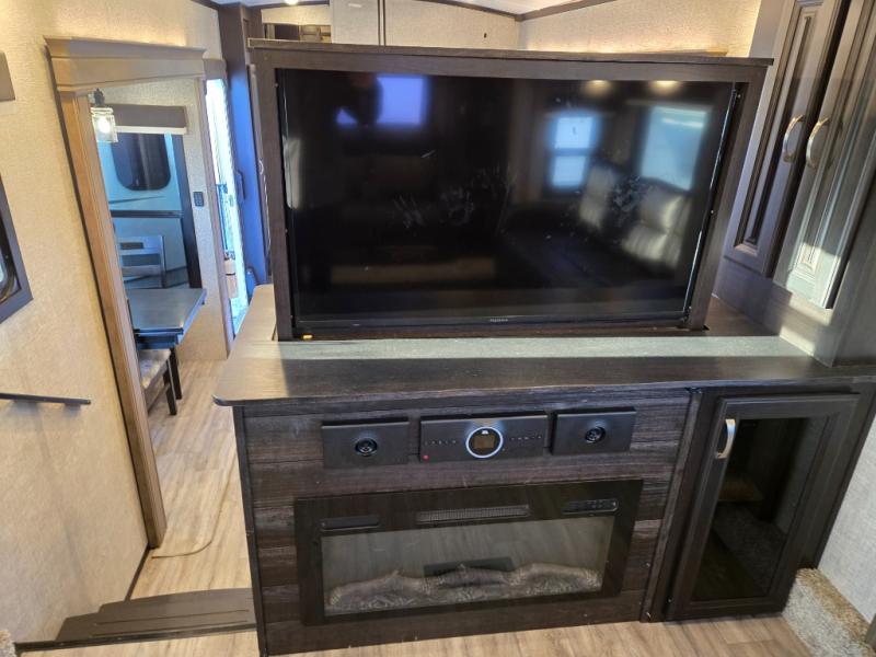 Entertainment can be found throughout this fifth wheel from the front living area with a 50" Smart LED HDTV with fully digital HDMI output and home entertainment system with subwoofer including a fireplace below that you can enjoy while relaxing on theater seats and two tri-fold sofas within slide outs, a 32" TV in the middle kitchen and there is a bedroom 32" TV. You might even like to add the tailgate TV option along the exterior. Back inside the kitchen, the cook will love the center island, the pantry, the 21 cu. residential refrigerator or choose the 18 cu. ft. option, and the free standing table without a pedestal and includes a leaf, two free standing chairs and two folding chairs. The half bath is a few steps away as an added convenience. The master bedroom includes a queen bed slide, a bench, two wardrobes and a sliding door into the bathroom which offers two sinks, a space prepped for a washer/dryer option, and a walk-in shower. And don't forget about the exterior features such as the outside kitchen for more choices when making meals, the storage for your outdoor gear and chairs, and the two awnings with integrated LED lighting.