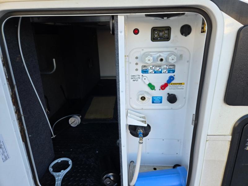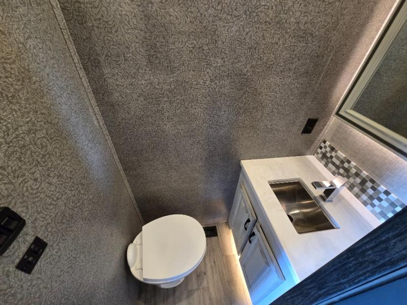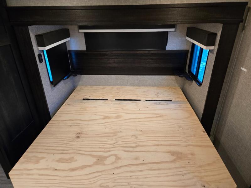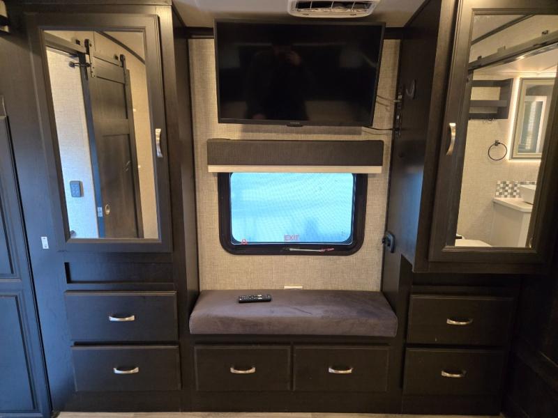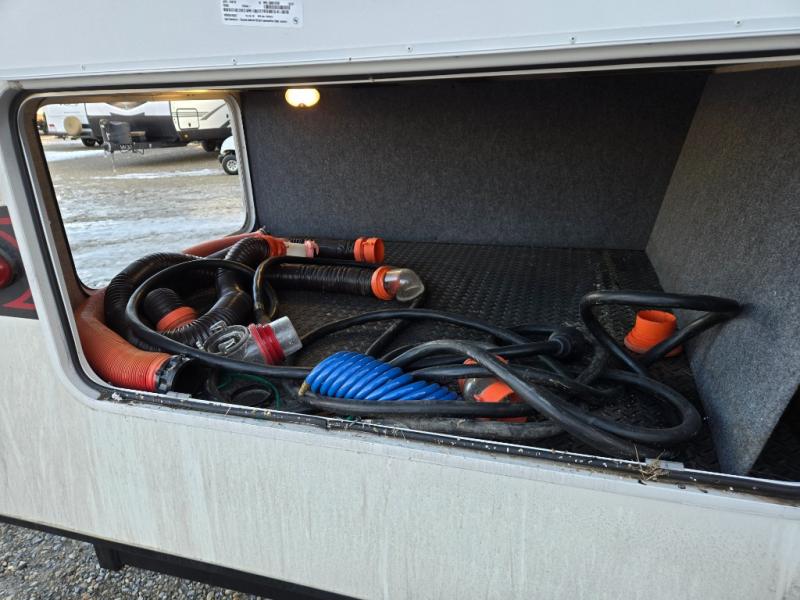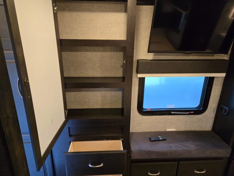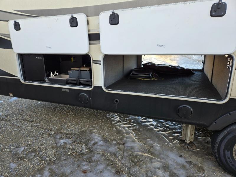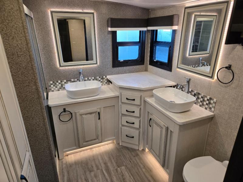 Entertainment can be found throughout this fifth wheel from the front living area with a 50" Smart LED HDTV with fully digital HDMI output and home entertainment system with subwoofer including a fireplace below that you can enjoy while relaxing on theater seats and two tri-fold sofas within slide outs, a 32" TV in the middle kitchen and there is a bedroom 32" TV. You might even like to add the tailgate TV option along the exterior. Back inside the kitchen, the cook will love the center island, the pantry, the 21 cu. residential refrigerator or choose the 18 cu. ft. option, and the free standing table without a pedestal and includes a leaf, two free standing chairs and two folding chairs. The half bath is a few steps away as an added convenience. The master bedroom includes a queen bed slide, a bench, two wardrobes and a sliding door into the bathroom which offers two sinks, a space prepped for a washer/dryer option, and a walk-in shower. And don't forget about the exterior features such as the outside kitchen for more choices when making meals, the storage for your outdoor gear and chairs, and the two awnings with integrated LED lighting.