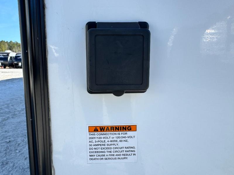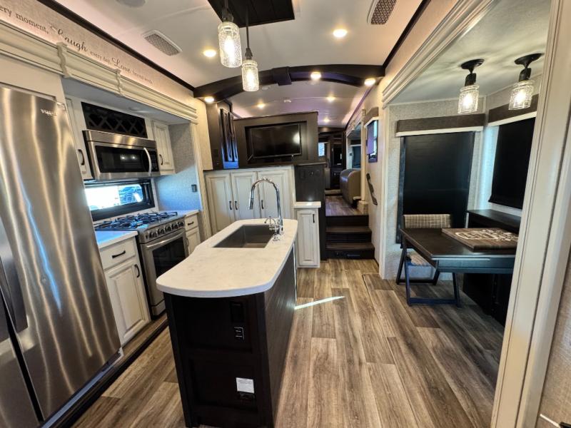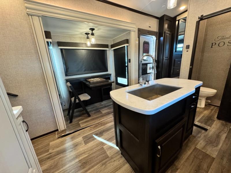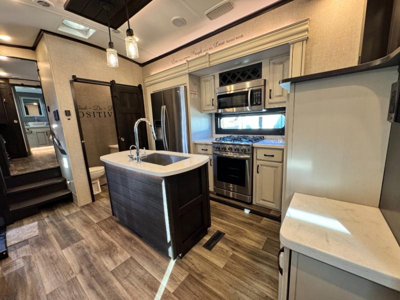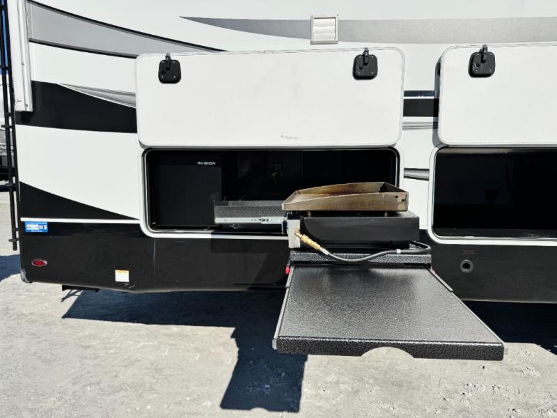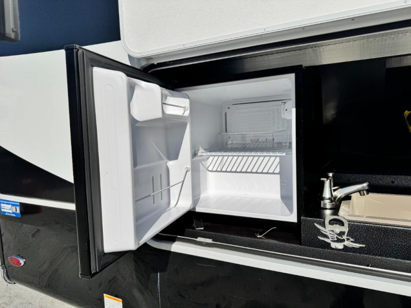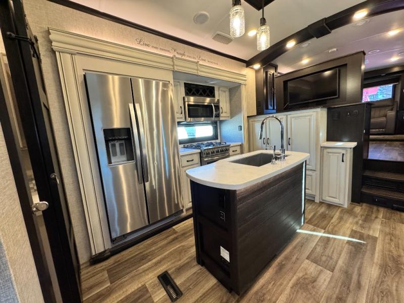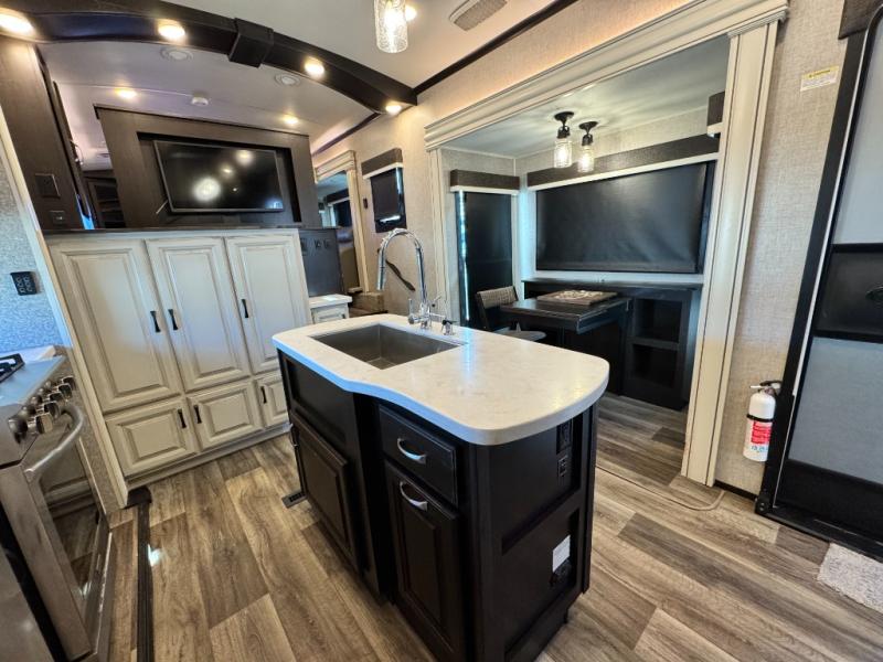 Entertainment can be found throughout this fifth wheel from the front living area with a 50" Smart LED HDTV with fully digital HDMI output and home entertainment system with subwoofer including a fireplace below that you can enjoy while relaxing on theater seats and two tri-fold sofas within slide outs, a 32" TV in the middle kitchen and there is a bedroom 32" TV. You might even like to add the tailgate TV option along the exterior. Back inside the kitchen, the cook will love the center island, the pantry, the 21 cu. residential refrigerator or choose the 18 cu. ft. option, and the free standing table without a pedestal and includes a leaf, two free standing chairs and two folding chairs. The half bath is a few steps away as an added convenience. The master bedroom includes a queen bed slide, a bench, two wardrobes and a sliding door into the bathroom which offers two sinks, a space prepped for a washer/dryer option, and a walk-in shower. And don't forget about the exterior features such as the outside kitchen for more choices when making meals, the storage for your outdoor gear and chairs, and the two awnings with integrated LED lighting.