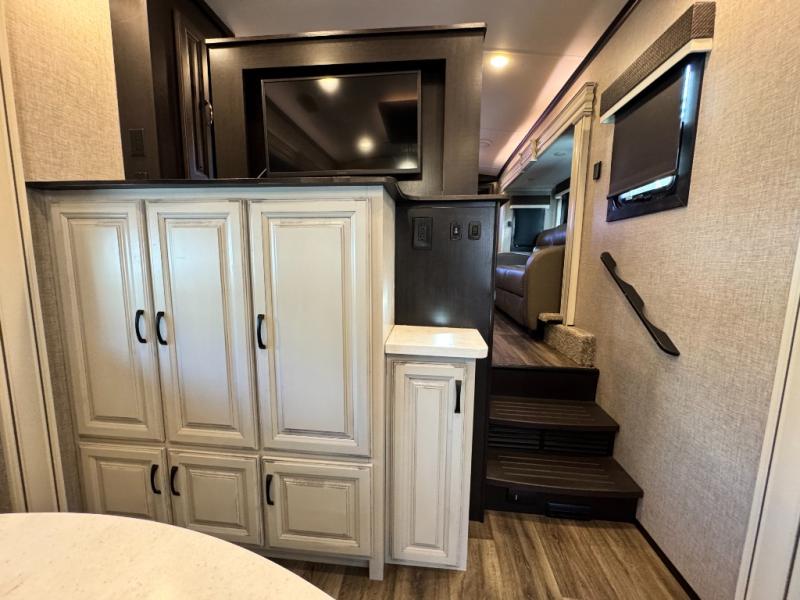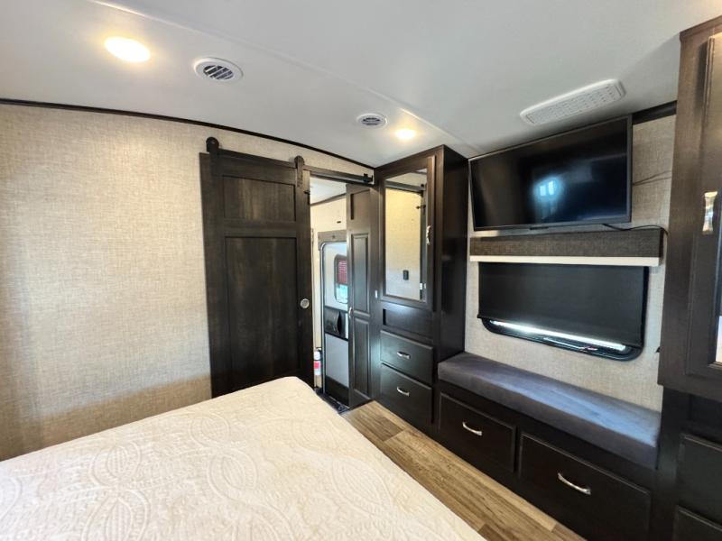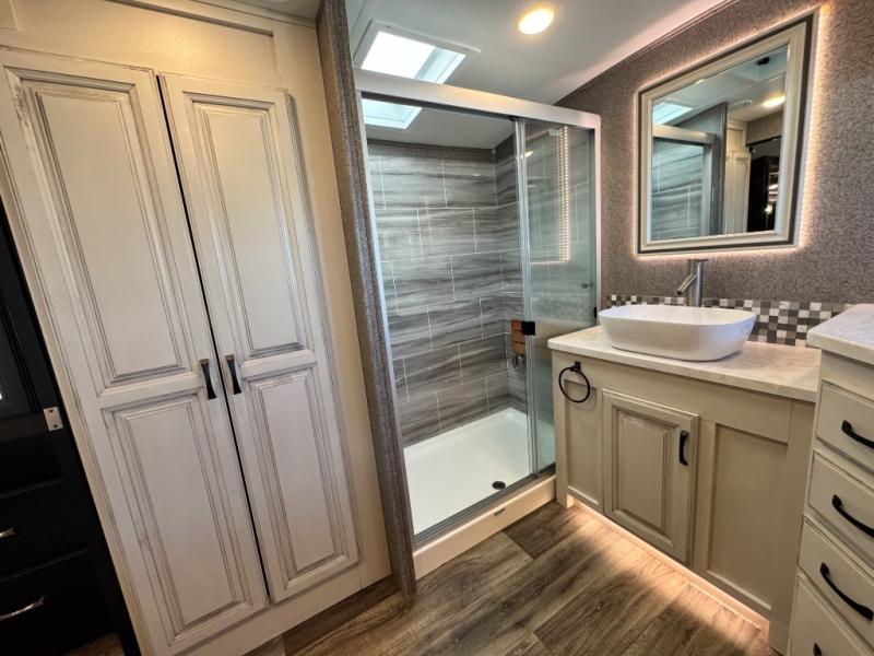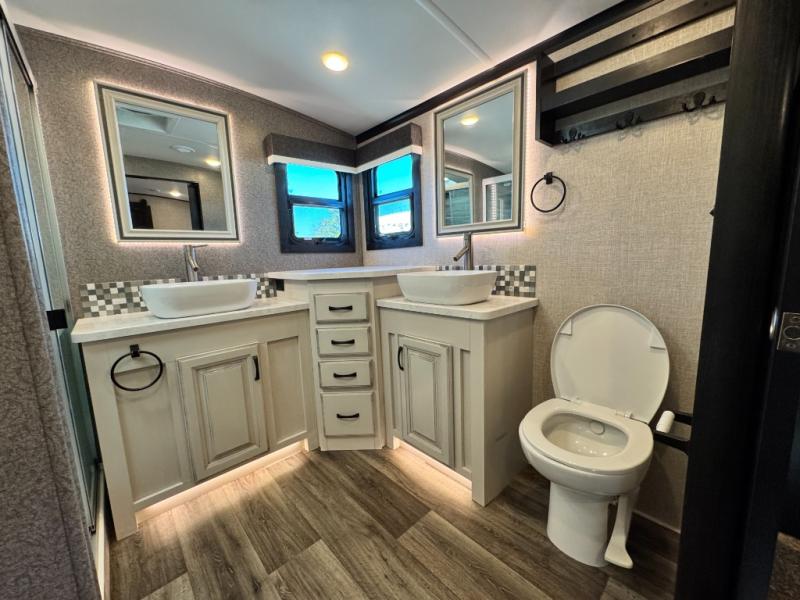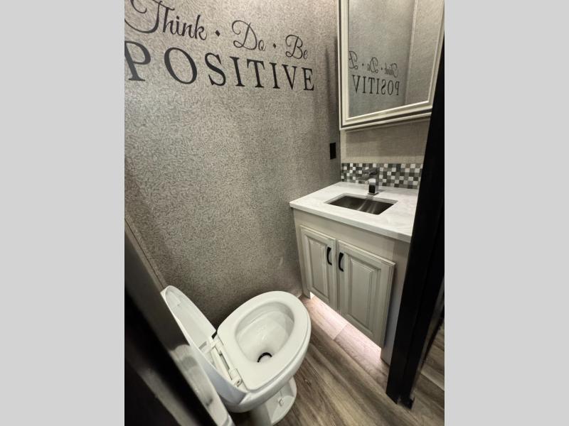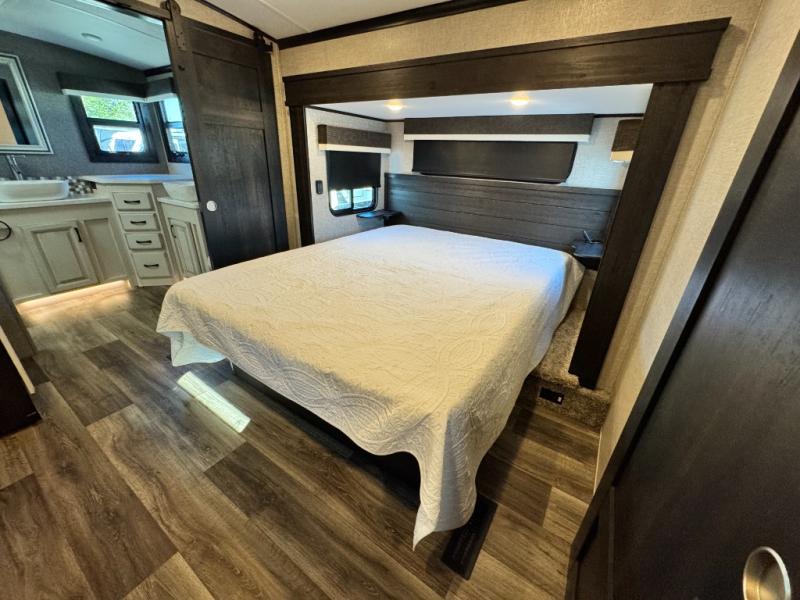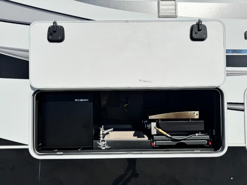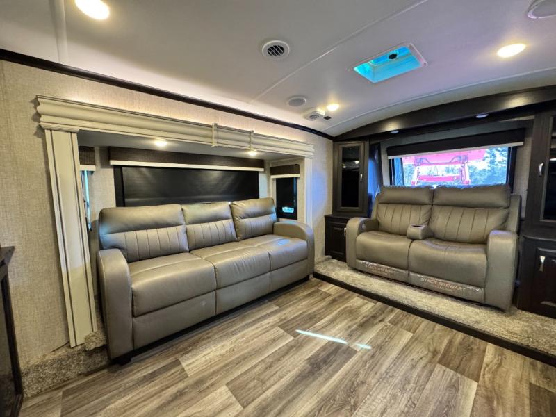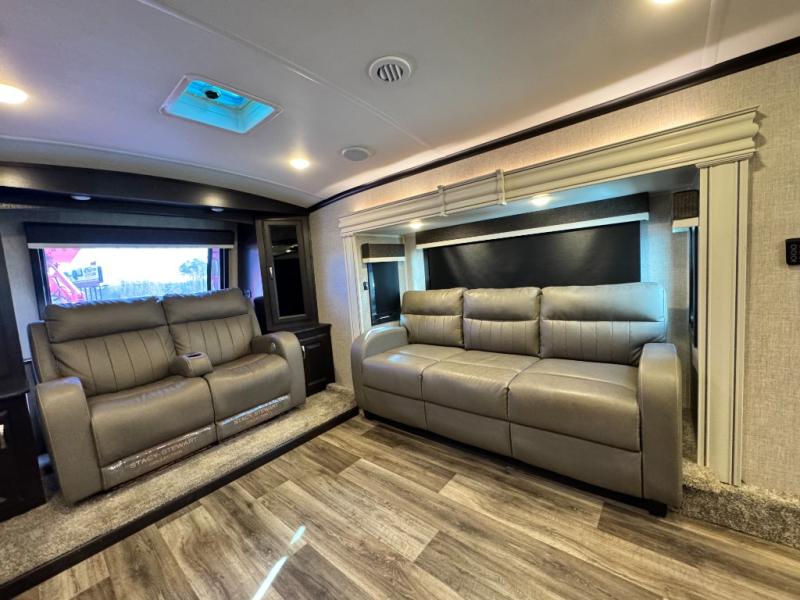 Entertainment can be found throughout this fifth wheel from the front living area with a 50" Smart LED HDTV with fully digital HDMI output and home entertainment system with subwoofer including a fireplace below that you can enjoy while relaxing on theater seats and two tri-fold sofas within slide outs, a 32" TV in the middle kitchen and there is a bedroom 32" TV. You might even like to add the tailgate TV option along the exterior. Back inside the kitchen, the cook will love the center island, the pantry, the 21 cu. residential refrigerator or choose the 18 cu. ft. option, and the free standing table without a pedestal and includes a leaf, two free standing chairs and two folding chairs. The half bath is a few steps away as an added convenience. The master bedroom includes a queen bed slide, a bench, two wardrobes and a sliding door into the bathroom which offers two sinks, a space prepped for a washer/dryer option, and a walk-in shower. And don't forget about the exterior features such as the outside kitchen for more choices when making meals, the storage for your outdoor gear and chairs, and the two awnings with integrated LED lighting.