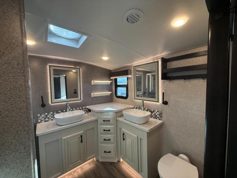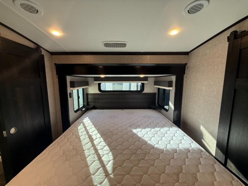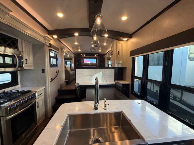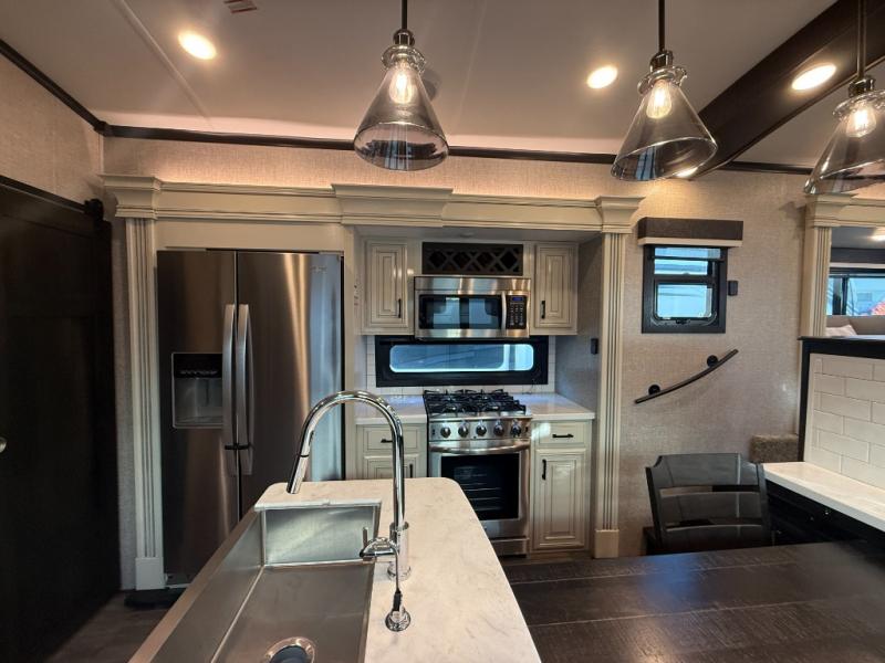 Each Pinnacle fifth wheel features Stronghold VBL lamination for the lightest, yet strongest construction in the RV industry. Add that to the Magnum Truss XL6 roof system and Climate Shield zero-degree tested weather protection and you'll be enjoying your fifth wheel for years to come. Some of the exterior conveniences you will appreciate are the Keyed-Alike lock system, the fully enclosed, universal docking center, and the 6-point hydraulic auto-leveling system for quick and easy set up. The 5 Star Handling Package will make towing a fifth wheel a walk in the park, and the two Whisper Quiet A/C units will keep you comfortable during the hot summer months. Inside, you'll enjoy the farmhouse stainless steel sink, the handcrafted hardwood glazed cabinetry, the vinyl flooring throughout, plus many more comforts. There is even a central vacuum system, a wireless remote control system, USB ports throughout, plus many more conveniences to make each trip enjoyable.