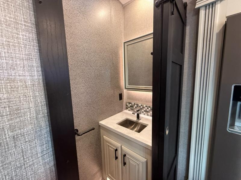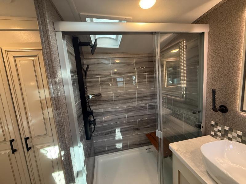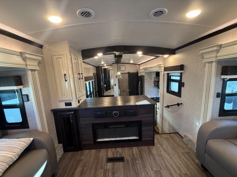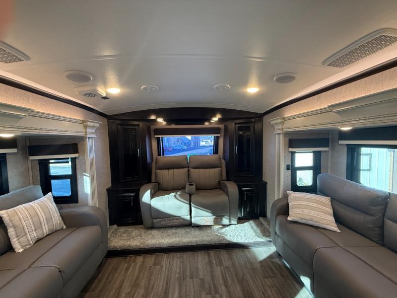 The ultimate in luxury and space is found in this quad slide out fifth wheel. The front living area includes two large tri-fold sofas, a 50" TV lift and a fireplace across from the theater seats. Check out the center kitchen with a sliding table top, a 32" TV to watch as you cook dinner, plus under-table storage for kitchen necessities. This model also includes an outside kitchen the chef is sure to enjoy, especially with two power awnings for maximum protection. The master bedroom will make you feel like royalty with its king bed, two wardrobes and a bench, plus a full rear bath. The huge vanity with dual bath sinks will allow you both to get ready at the same time, plus there is a walk-in shower with a seat for added convenience.