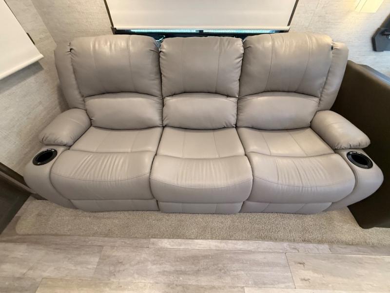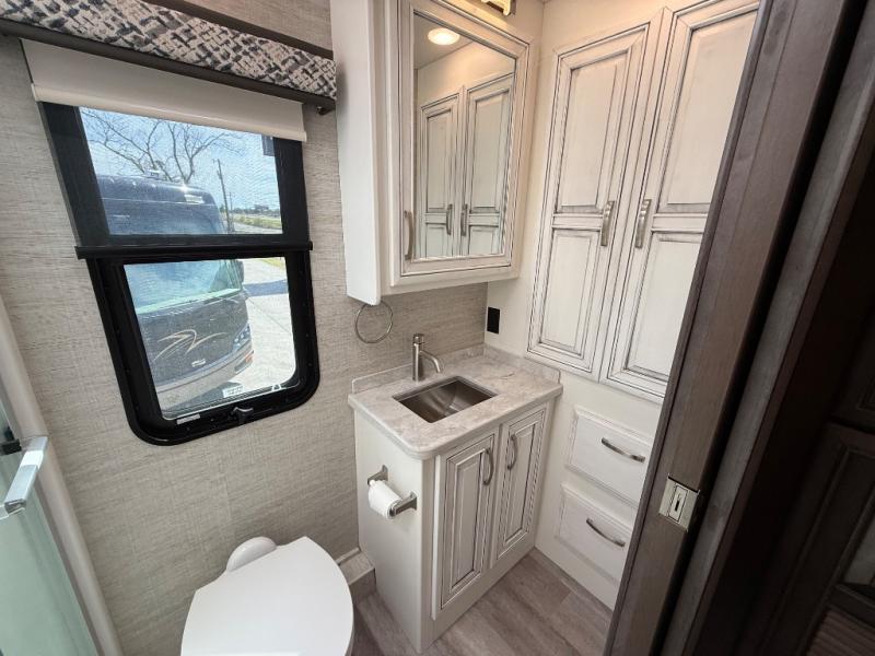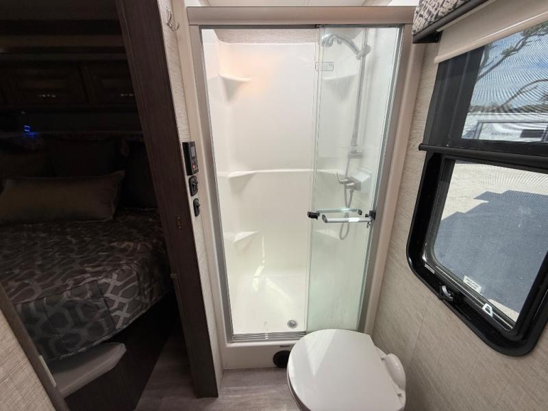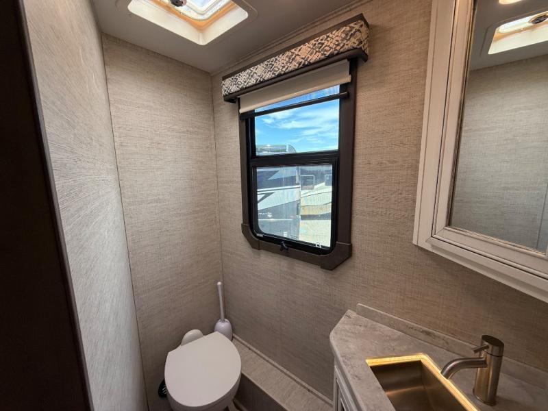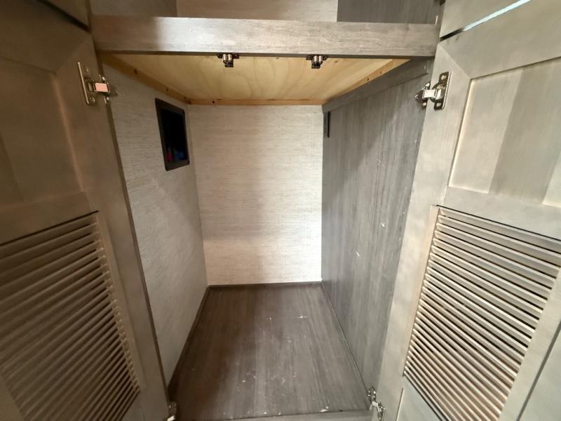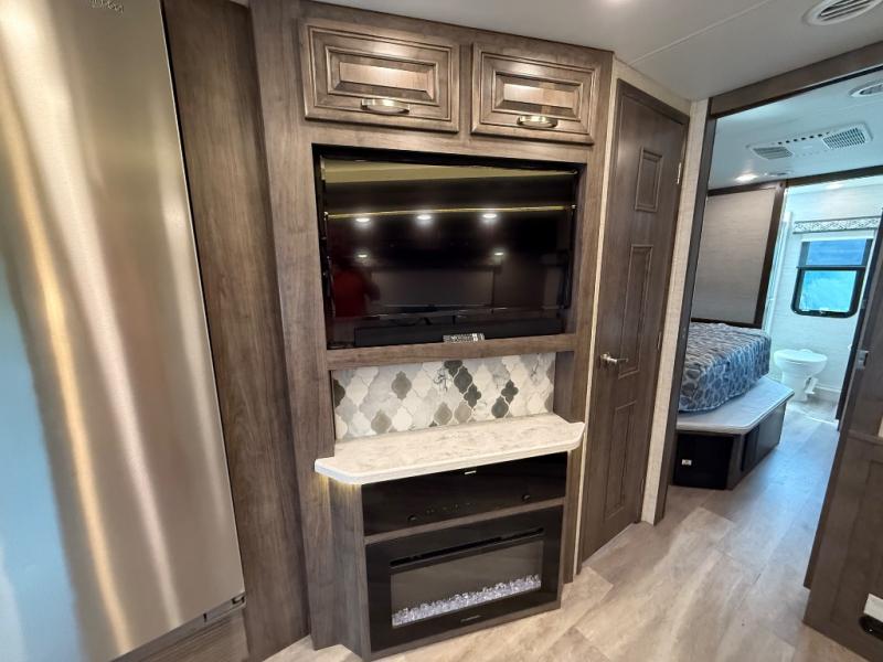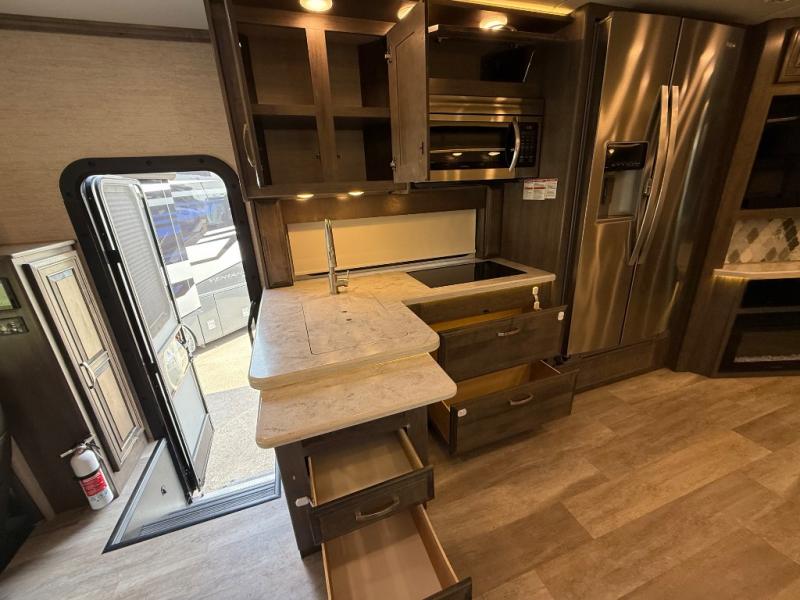 You will find lots to love with this motorhome! From the bath and a half to the bunk over cab and outside entertainment center. The chef can prepare their best meals with the two burner induction cooktop and the countertop extension will make it even easier. There's a large pantry next to the booth dinette so you can quickly grab a snack during game night or if you prefer to relax instead then you can enjoy the fireplace and 39" LED HD Smart Fire TV while sitting on the 93" reclining sofa. The master suite has a king bed slide with a power head lift to lay your head on at night, a LED TV with a wardrobe and storage area next to it, as well as an area prepped to add an optional washer and dryer. You even have access to the full rear bathroom which has a 30" x 36" shower and a wardrobe to keep your linens close.