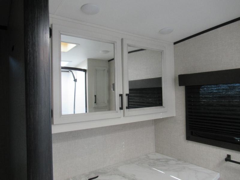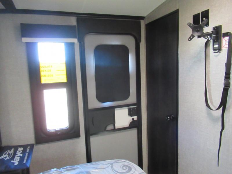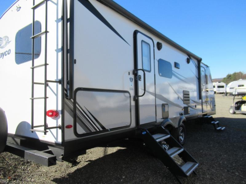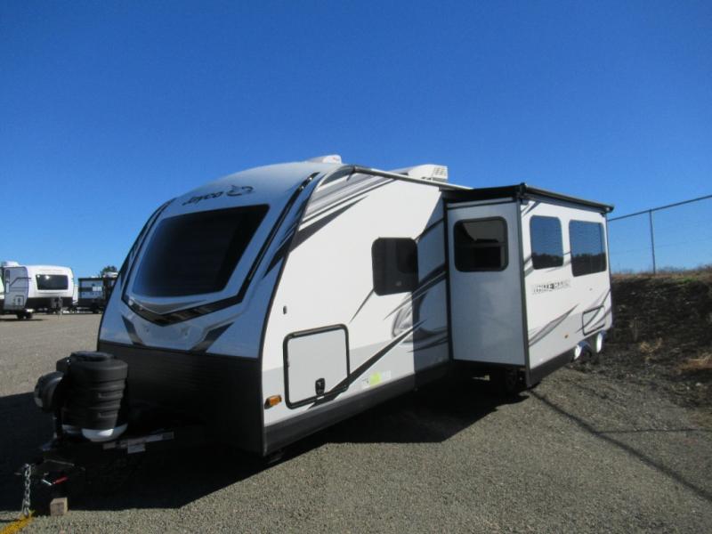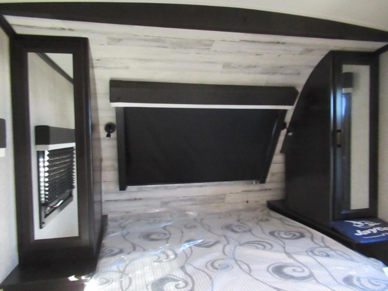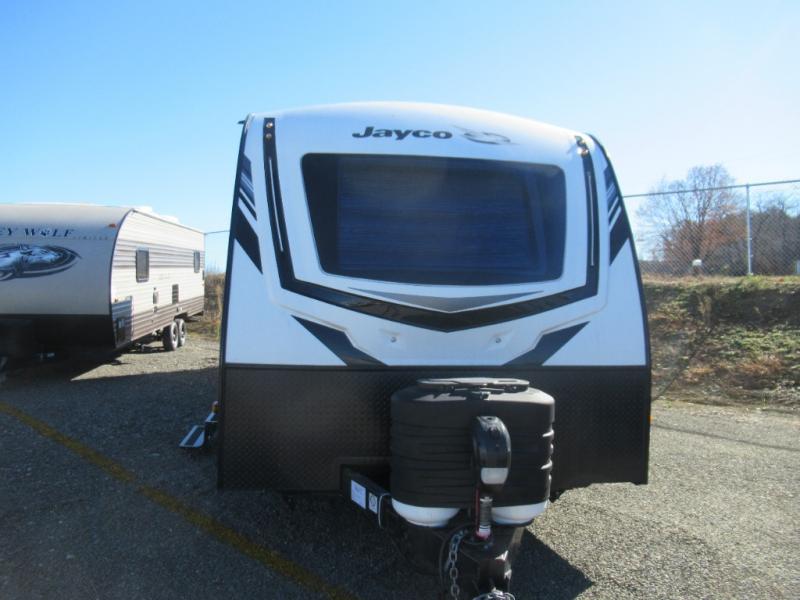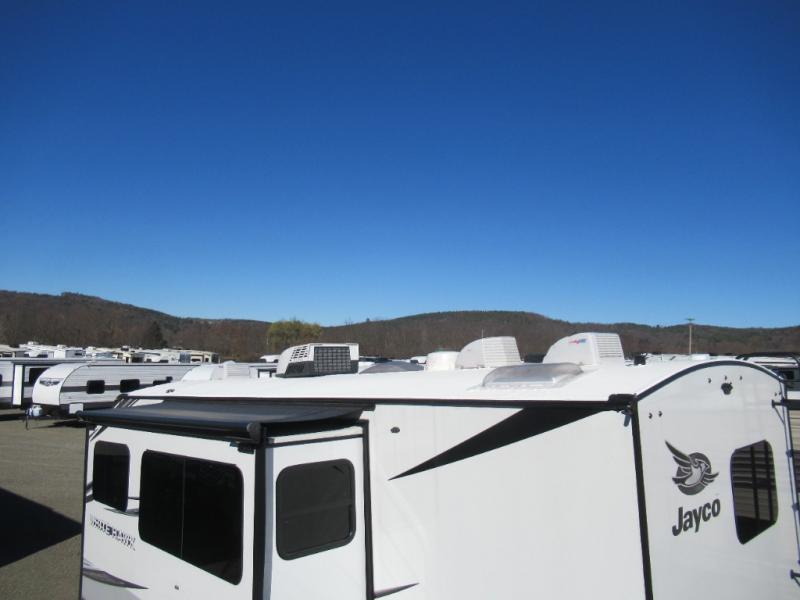 The lightweight White Hawk travel trailers by Jayco will blow you away with their roomy interiors, luxurious amenities, and durable construction. The Magnum Truss Roof System can withstand 50% more weight than the competition, and the Stronghold VBL lamination is the lightest, yet strongest in the industry. Each model includes the JAYCOMMAND "Smart RV" system with a tire pressure monitor system, plus American-made Goodyear tires for maximum durability and carrying capacity. You will love the sleek look of the front molded fiberglass cap with an automotive windshield and blue LED accent lighting, along with the frameless windows and automotive-style aluminum rims. The White Hawk travel trailers also include an arched interior ceiling, a kitchen skylight with a shade, residential vinyl flooring with cold crack resistance, and an electric fireplace.