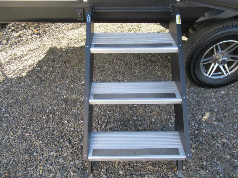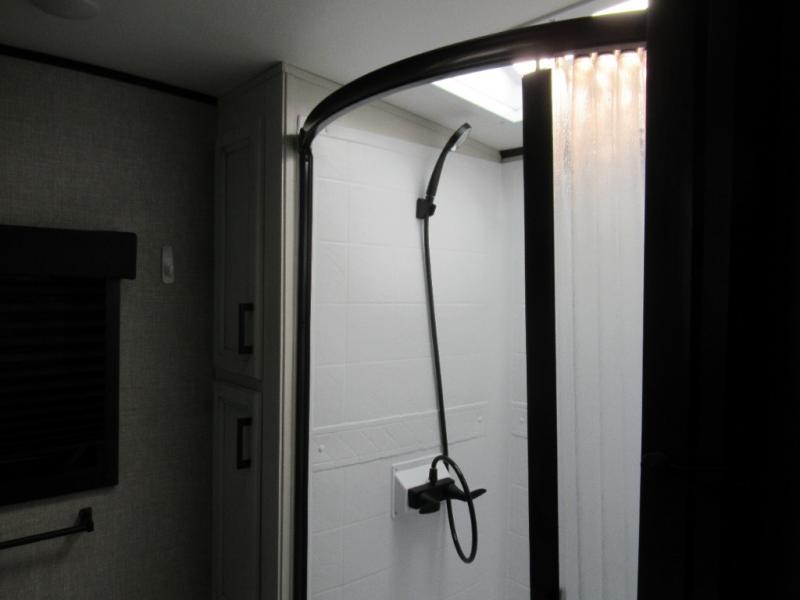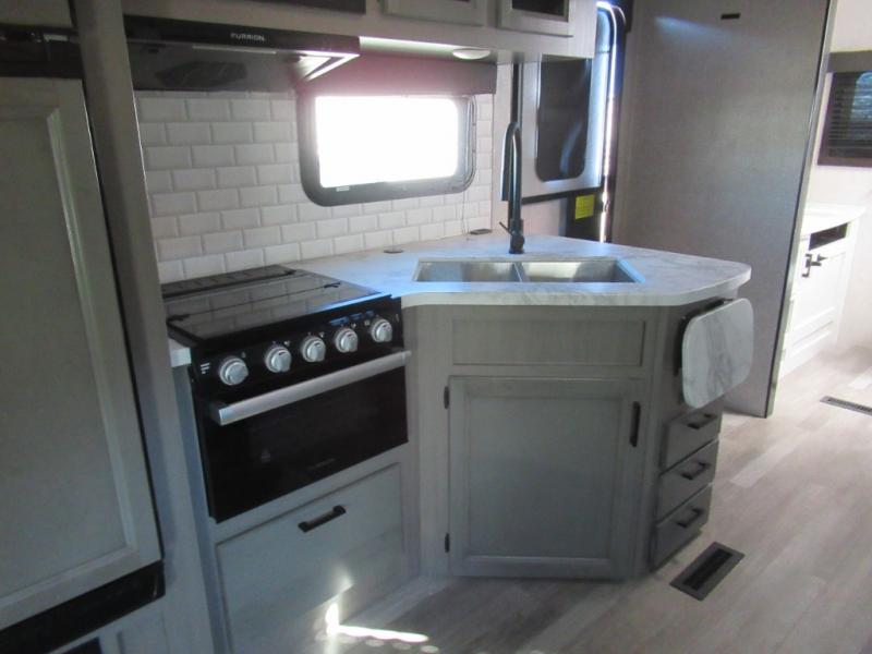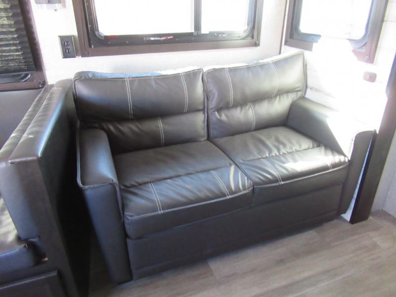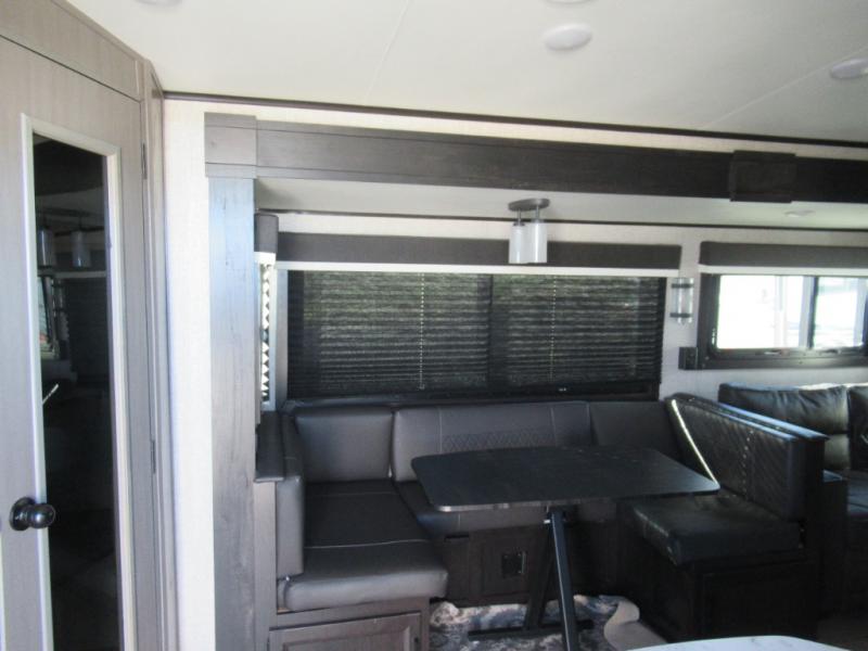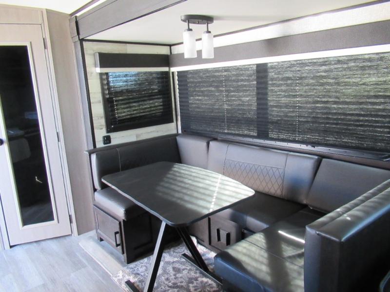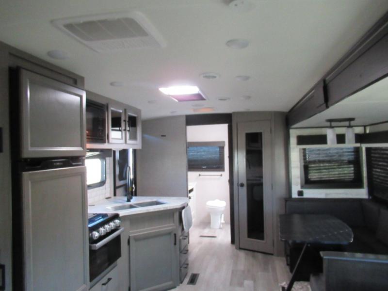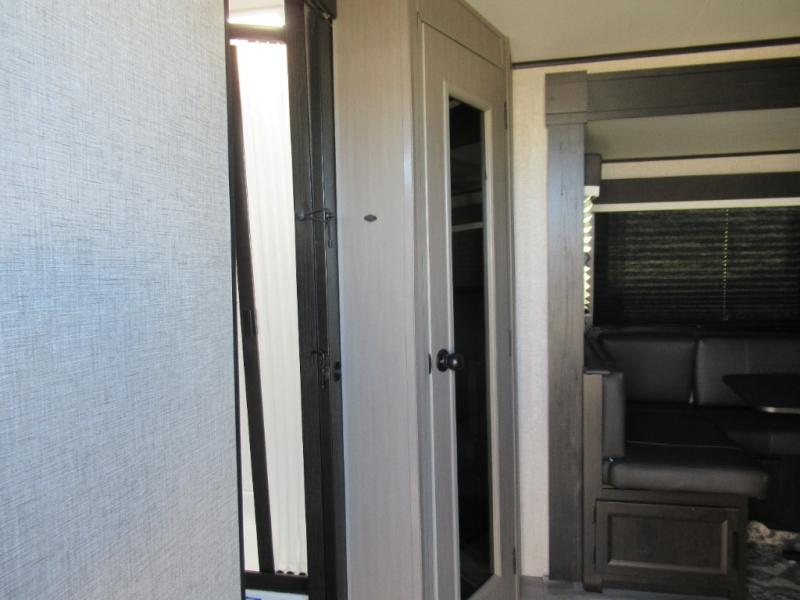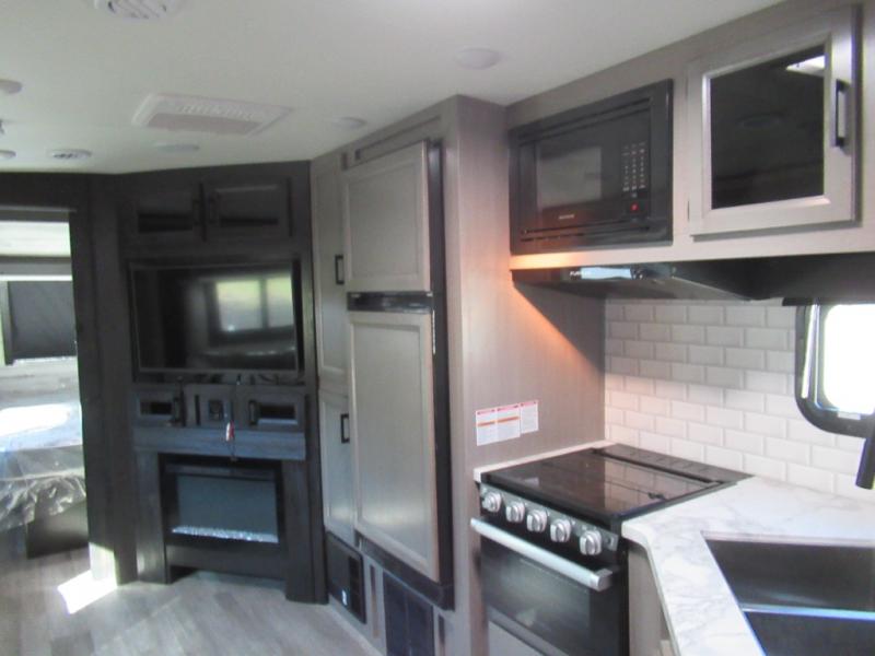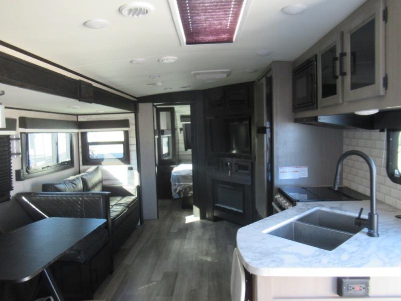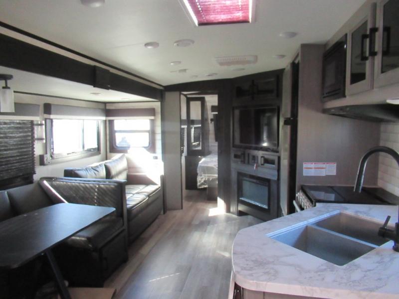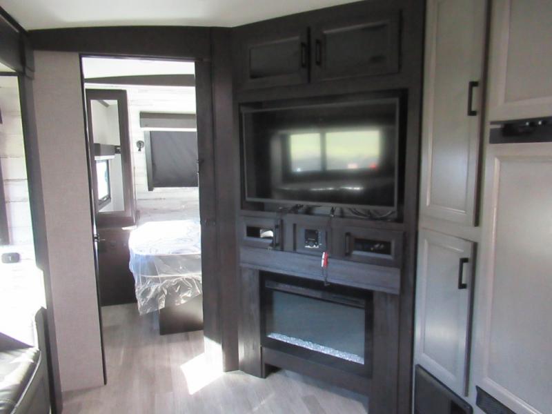 Your family will love camping every other weekend in this spacious travel trailer. The full rear bath is tucked away in the back for privacy, and there are dual entry doors for convenience. When you're not outside cooking on the outdoor kitchen, gather around the U-shaped dinette for game night. You'll find the LED TV and fireplace will make this area feel more like home, and there are two pantries to store snacks and dry goods. When it comes time to call it a night, head to the front private bedroom for a great night's rest on the queen bed, and you'll find two wardrobes plus a closet to keep your clothes tidy.