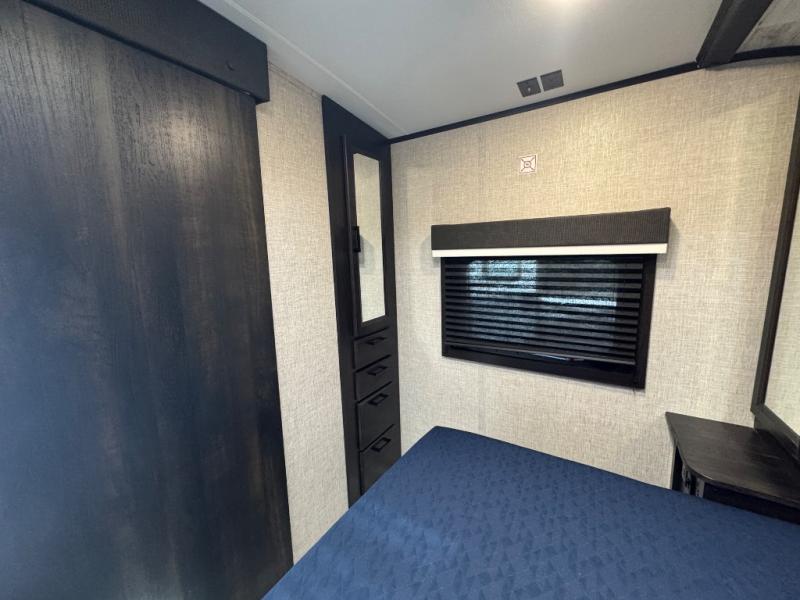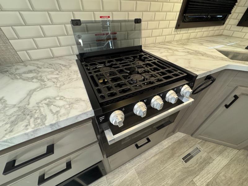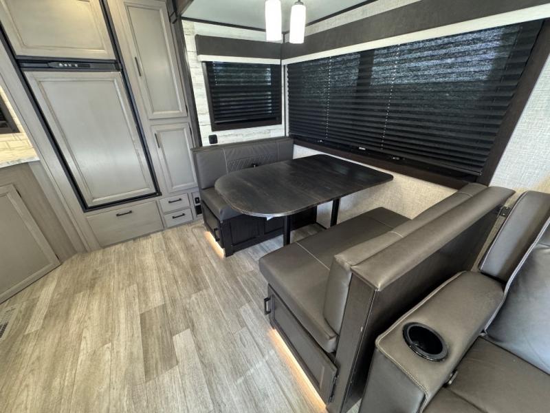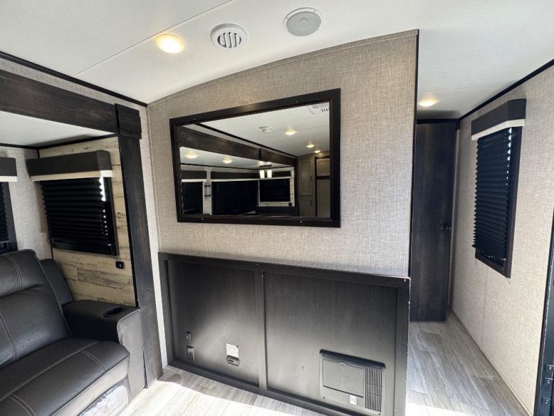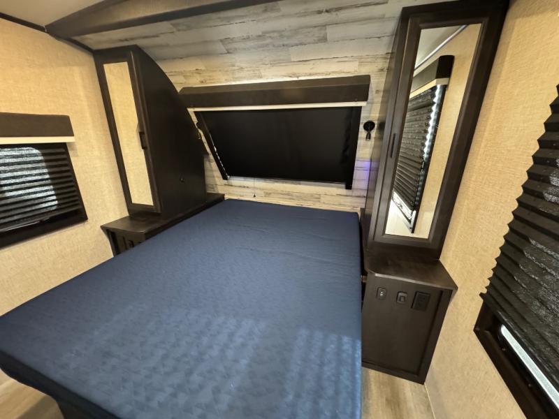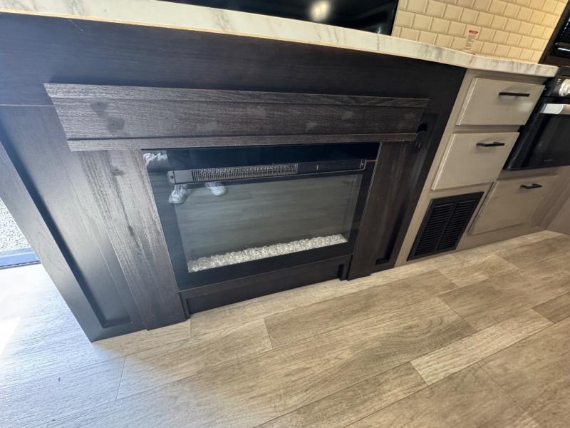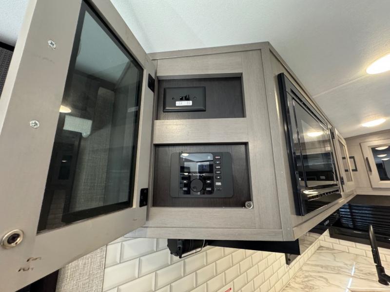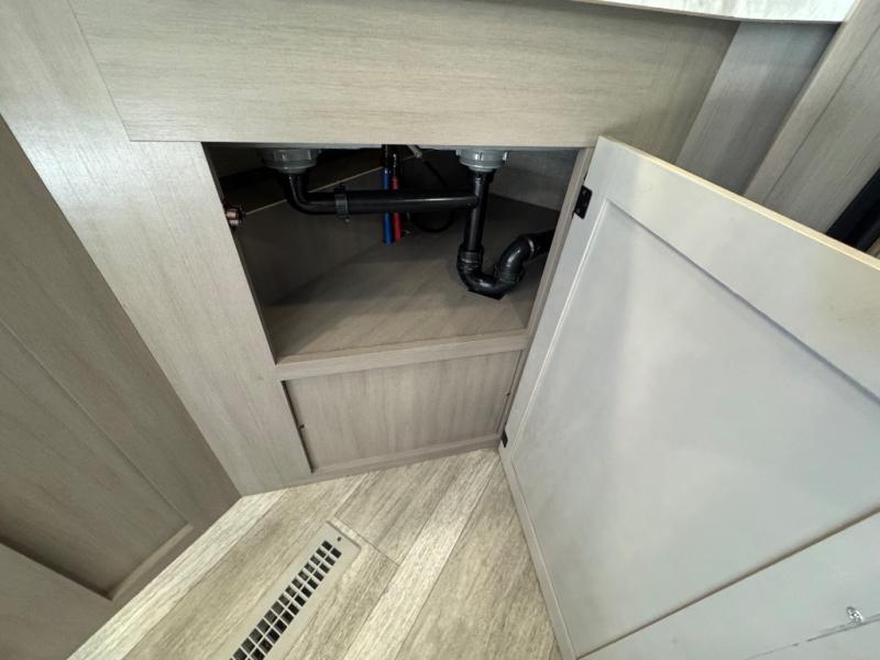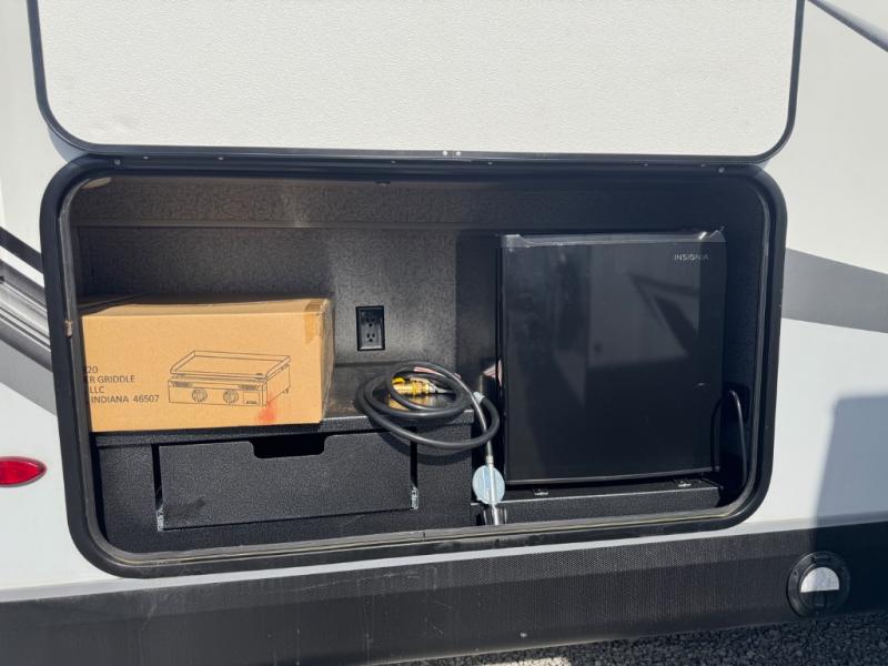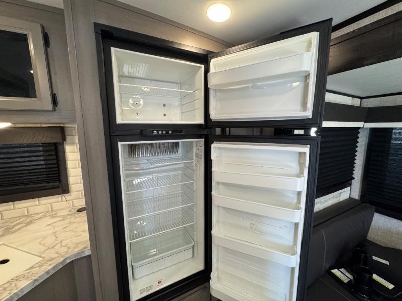 Step inside this rear kitchen travel trailer for fun family vacations. The large slide will provide the chef space to cook, while the kids watch a movie on the TV on lift. If the weather is just right, you will probably want to cook on the outside kitchen while the kids ride their bikes around the campsite. This model includes a tri-fold sofa and a booth dinette that will be perfect for meal times, relaxing, and sleeping space at night. You and your spouse can take the front private bedroom with a queen bed and dual wardrobes for your things, and the full bath is centrally located for easy access!