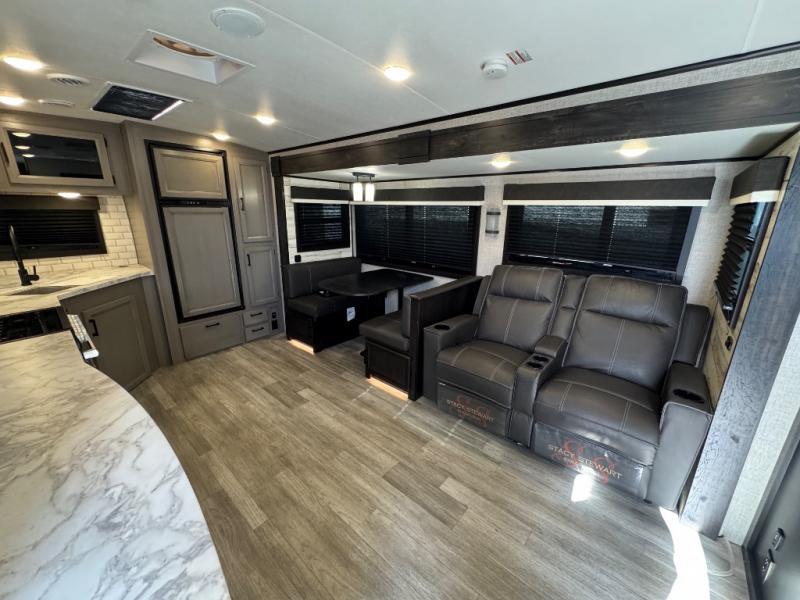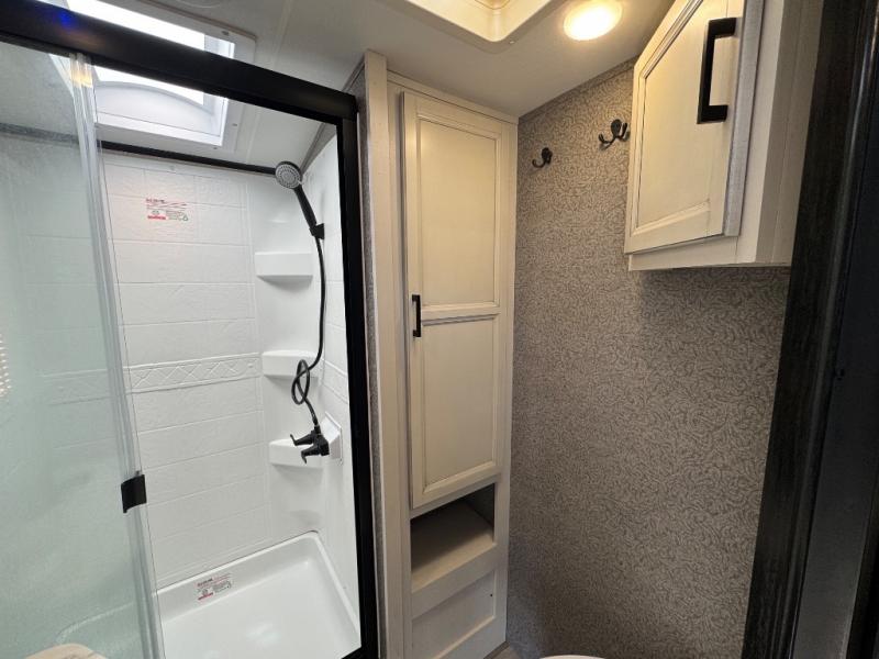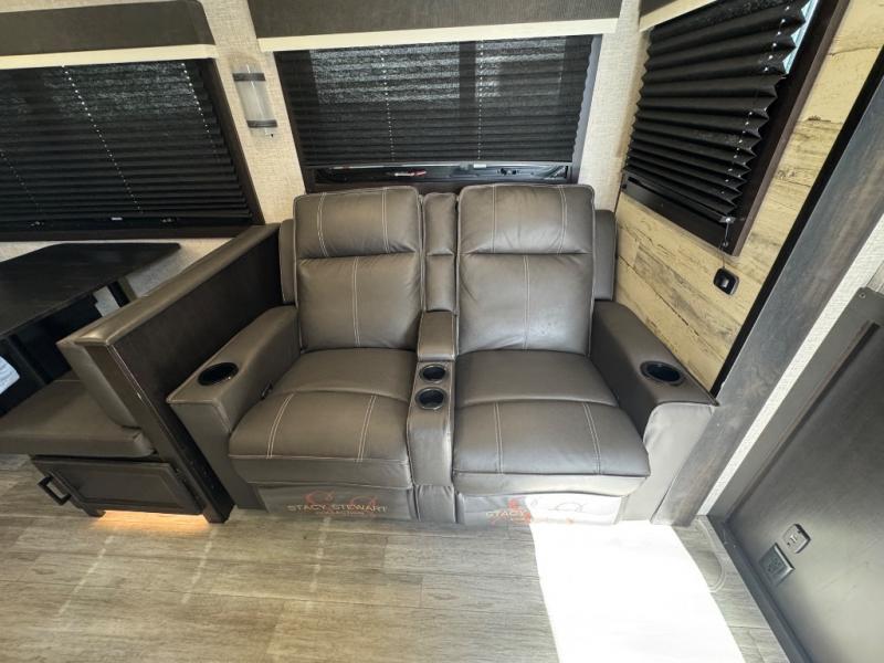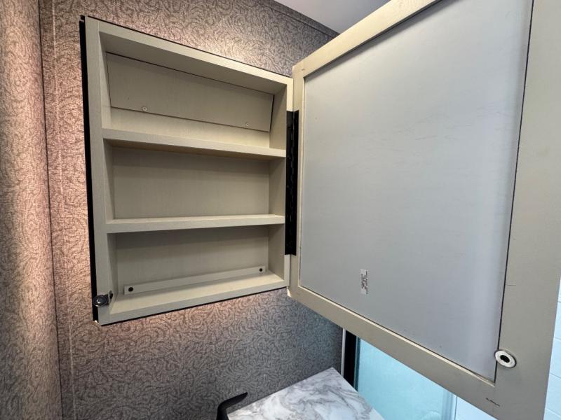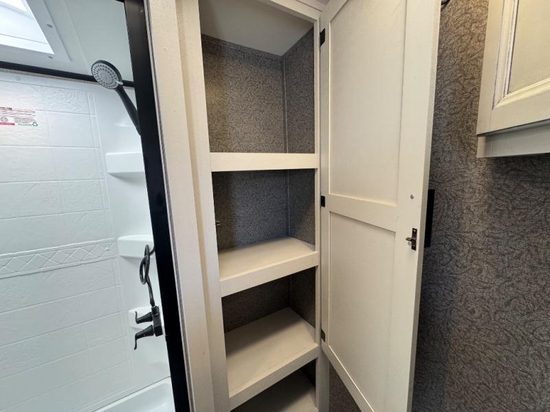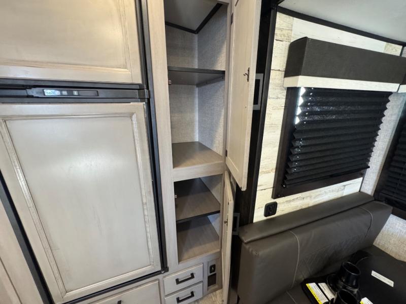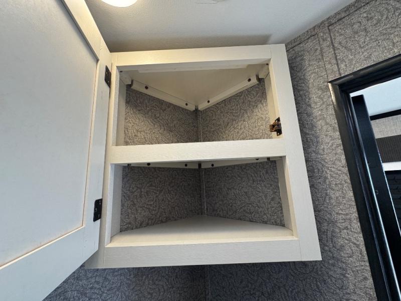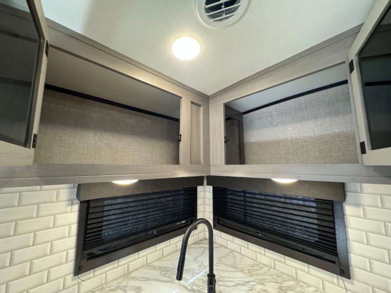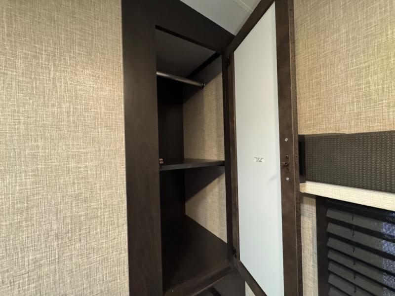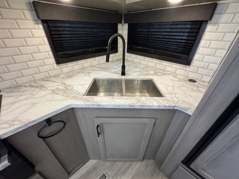 Step inside this rear kitchen travel trailer for fun family vacations. The large slide will provide the chef space to cook, while the kids watch a movie on the TV on lift. If the weather is just right, you will probably want to cook on the outside kitchen while the kids ride their bikes around the campsite. This model includes a tri-fold sofa and a booth dinette that will be perfect for meal times, relaxing, and sleeping space at night. You and your spouse can take the front private bedroom with a queen bed and dual wardrobes for your things, and the full bath is centrally located for easy access!