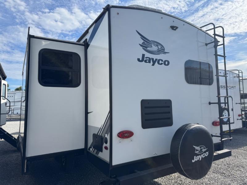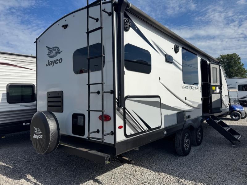 The lightweight White Hawk travel trailers by Jayco will blow you away with their roomy interiors, luxurious amenities, and durable construction. The Magnum Truss Roof System can withstand 50% more weight than the competition, and the Stronghold VBL lamination is the lightest, yet strongest in the industry. Each model includes the JAYCOMMAND "Smart RV" system with a tire pressure monitor system, plus American-made Goodyear tires for maximum durability and carrying capacity. You will love the sleek look of the front molded fiberglass cap with an automotive windshield and blue LED accent lighting, along with the frameless windows and automotive-style aluminum rims. The White Hawk travel trailers also include an arched interior ceiling, a kitchen skylight with a shade, residential vinyl flooring with cold crack resistance, and an electric fireplace.
